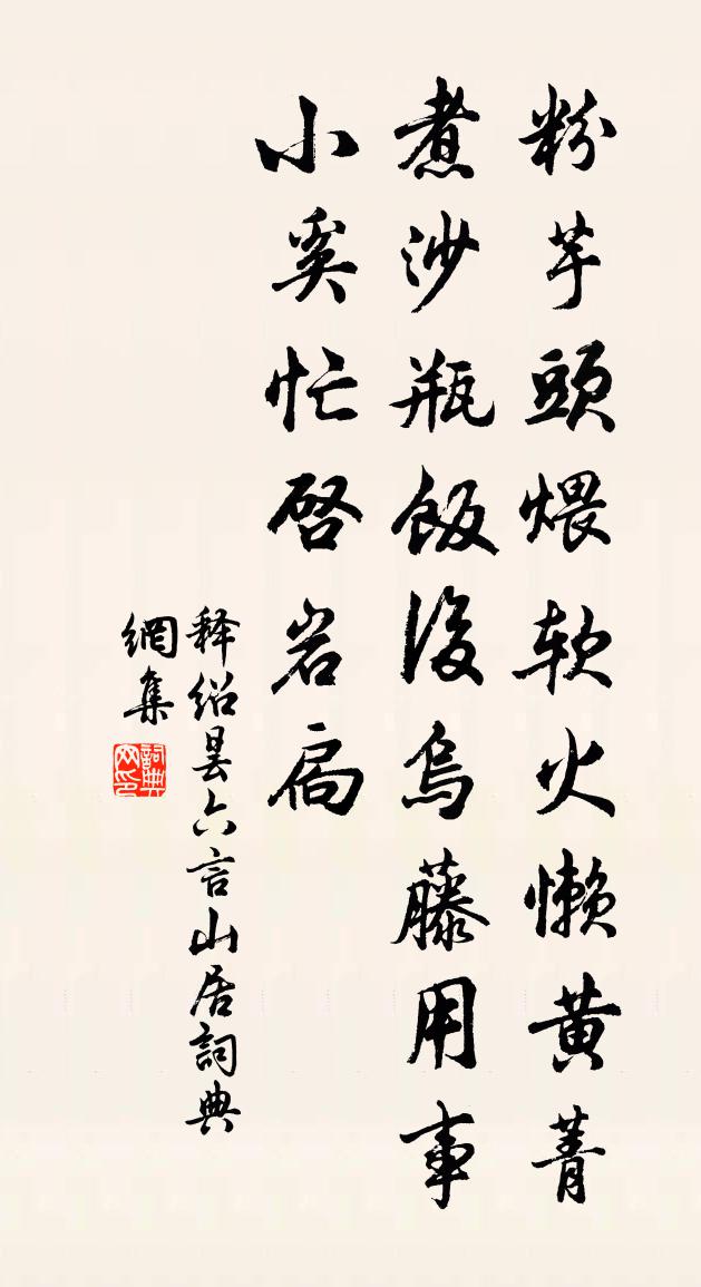 詩詞名句歷史字典書法欣賞書法字典國語詞典說文解字康熙字典古漢語字典標 題 作 者 詩 句 六言山居作者:釋紹曇 朝代:宋代六言山居原文粉芋頭煨軟火,懶黃菁煮沙瓶。飯後烏藤用事,小奚忙啟岩扃。詩詞問答問:六言山居的作者是誰?答:釋紹曇問:六言山居寫於哪個朝代?答:宋代釋紹曇六言山居書法欣賞六言山居書法作品詩詞推薦題妙覺寺朱利賓〔宋代〕有民增吏役,無事愛僧家。不憚山頭路,來煎飯後茶。鍾魚雖闃寂,松竹自交加。掃榻須盤薄,吾生會有涯。贈太子太傅康靖李公輓歌詞二首司馬光〔宋代〕黃髮今彫喪,蒼生欲奈何。散金纏極樂,曳杖已成歌。十郡余恩在,三台故吏多。位崇仍有後,五福更為多。醉宿慈氏院晨起張耒〔宋代〕痛飲淋漓半夜醒,披衣坐得曉窗明。風松一夕清無限,壚火三更暖有情。孤閣鳴鐘天黯慘,寒山戴雪晚崢嶸。年來湖上遇雨鄭獬〔宋代〕老龍怒相搏,快雨忽噴灑。天公白羽箭,竦竦射萬瓦。電眼窺人屋,狂雷震欲下。直疑惡溪山,掃除重造化。頃之瑞鷓鴣趙希蓬〔宋代〕強將紙帳醉梅花。千劫應知作熱沙。夢逐梨雲迷去路,曲隨楊柳到伊家。客懷暗遣心頭恨,醉眼休將口上夸。清曉次韻楊廷秀周必大〔宋代〕江國群芳自有餘,詩才酒興不愁無。卻憐西蜀移根遠,醉向東風落筆初。生查子·題京口郡治塵表亭辛棄疾〔宋代〕悠悠萬世功,矻矻當年苦。魚自入深淵,人自居平土。紅日又西沉,白浪長東去。不是望金山,我自思量禹。梁州令歐陽修〔宋代〕紅杏牆頭樹。紫萼香心初吐。新年花發舊時枝,徘徊千繞,獨共東風語。陽台一夢如雲雨。為問今何處。離情別恨和十二兄五首晃沖之〔宋代〕我家溱洧間,春水色如酒。嵩少在吾旁,日夕意亦厚。田園雖不廣,幽興隨事有。藥畦灌陳根,芋區采駢首。春郊示全真元常(元常,趙氏生)韋應物〔唐代〕余辭郡符去,爾為外事牽。寧知風雪夜,復此對床眠。始話南池飲,更詠西樓篇。無將一會易,歲月坐推遷。送趙侯之任戴震伯〔宋代〕趙侯東南彥,遠作西南征。驪駒向前路,高秋不留行。送以奉林鶴,仍吹子晉笙。淵淵洞庭湖,古月今猶明。流輝挽橫海曾朝議王義山〔宋代〕父子眉山多一蘇,衣冠盛事再堪圖。岫雲懶出官情薄,霖雨未成輿望孤。橫海僅存遺藁在,臨川有此老師無。瓣香和徐秘書徐鉉〔唐代〕年少支離奈命何,悲秋懷舊苦吟多。龍泉有氣終難掩,荊玉無瑕豈憚磨。會偶良工收杞梓,莫將閒夢掛煙蘿。他年偈頌二百零五首釋正覺〔宋代〕影略門前倒剎竿,箇中訊息授傳難。玲瓏侍者能相委,盤走明珠珠走盤。和高諫議蒙兼賓客時入翰苑姚合〔唐代〕兼秩恩歸第一流,時尋仙路向瀛洲。鐘聲迢遞銀河曉,林色蔥籠玉露秋。紫殿講筵鄰御座,青宮賓榻入龍樓。從來紹興十年發皇太后冊寶八首佚名〔宋代〕聲樂備陳,禮容罔武。相維辟公,虔奉玉冊。皇則受之,慕形於色。既壽且康,興天無極。書近事二首劉克莊〔宋代〕石衛尉家先沒入,黔婁生處亦誅求。客嘲未悟漫天戲,鬼瞰皆知偃月謀。不許他人分越國,預拚異日去崖州。傍觀游熙六年端午帖子詞皇后合五首崔敦詩〔宋代〕瑞麥登時物,香蒲薦壽祺。珠囊新樣小,蹙就葛覃詩。沁園春(御閱還上郭殿帥)劉過〔宋代〕玉帶猩袍,遙望翠華,馬去似龍。擁貂蟬爭出,千宮鱗集,貔貅不斷,萬騎雲從。細柳營開,團花袍窄,人指汾陽埇橋達奚四、於十九、陳大三侍御夜宴敘各賦二韻權德輿〔唐代〕滿樹鐵冠瓊樹枝,樽前燭下心相知。明朝又與白雲遠,自古河梁多別離。名句推薦跨馬出郊時極目,不堪人事日蕭條杜甫《野望》 上交不諂,下交不瀆佚名《易傳·繫辭傳下·第五章》 林下春晴風漸和,高崖殘雪已無多。王守仁《春晴》 垓下美人泣楚歌,定陶美人泣楚舞,真龍亦鼠虎亦鼠。王象春《書項王廟壁》 荊吳相接水為鄉,君去春江正淼茫。孟浩然《送杜十四之江南 / 送杜晃進士之東吳》 常人安於故習,學者溺於所聞。商鞅《商君書·更法》 年年社日停針線。怎忍見、雙飛燕。黃公紹《青玉案·年年社日停針線》 南園春半踏青時,風和聞馬嘶。歐陽修《阮郎歸·南園春半踏青時》 香非在蕊,香非在萼,骨中香徹。晁補之《鹽角兒·亳社觀梅》 淡盪春光寒食天。玉爐瀋水裊殘煙。李清照《浣溪沙·淡盪春光寒食天》