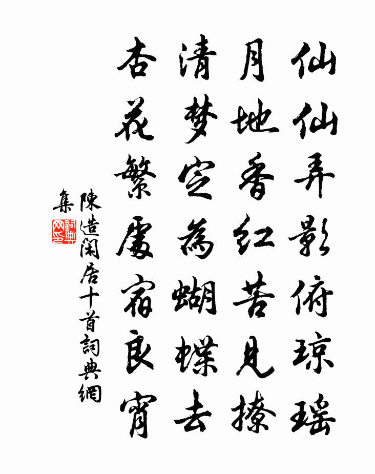 詩詞名句歷史字典書法欣賞書法字典國語詞典說文解字康熙字典古漢語字典標 題 作 者 詩 句 閒居十首作者:陳造 朝代:宋代閒居十首原文仙仙弄影俯瓊瑤,月地香紅苦見撩。清夢定為蝴蝶去,杏花繁處宿良宵。詩詞問答問:閒居十首的作者是誰?答:陳造問:閒居十首寫於哪個朝代?答:宋代陳造閒居十首書法欣賞閒居十首書法作品詩詞推薦初春紀事陸游〔宋代〕窗欞無日影,庭樹無風聲,微雲淡天宇,非陰亦非晴。美哉豐年祥,入我屠蘇觥。父老亦共喜,驩言叩柴荊。一飽【中呂】紅繡鞋_秋日湖上紅王舉之〔元代〕秋日湖上紅葉荒林酒興,黃花老圃詩情,柳塘新雁兩三聲。湖光扶不定,山色畫難成。六橋風露冷。棲雲吊貫酸齋撥悶(一作贈嚴二別駕)杜甫〔唐代〕聞道雲安麴米春,才傾一盞即醺人。乘舟取醉非難事,下峽消愁定幾巡。長年三老遙憐汝,棙柁開頭捷有神。已辦和顏長官百詠邊庭朱繼芳〔宋代〕角聲吹裂肺肝愁,說與將軍莫逗留。男子生當侯萬里,死判馬革海西頭。鄭汝則七十陳藻〔宋代〕少壯同時事網山,幾人別後鬢能斑。古稀慚愧今餘四,君已平頭一醉歡。偈頌二百零五首釋正覺〔宋代〕一日不作,一日不食,歇者無心穫者力。分明只個是家風,會得種田博飯喫。張仲通追賦洛中雜題和嘗歷覽者六章其六蘄竹梅堯臣〔宋代〕顋肥節腦瘦,蘄水長笛材。洛陽袁氏塢,此竹舊移來。雪霰飽已久,竅星誰為開。與君作龍吟,吹髮江南海。獨立方岳〔宋代〕村夫子挾兔園冊,教得黃鸝解讀書。能記蒙求中一句,百般嬌奼可憐渠。河滿子晏幾道〔宋代〕對鏡偷勻玉箸,背人學寫銀鉤。系誰紅豆羅帶角,心情正著春遊。那日楊花陌上,多時杏子牆頭。眼底關山無奈,題濟川亭釋宗覺〔宋代〕高亭窺綠潤,古寺面蒼陰。聞有遺仙事,應容過客尋。路危山背迥,雲重洞天深。一鳥不飛去,時能弄好音。別章鍊師倪瓚〔元代〕方舟共濟春江闊,訪我寒煙菰葦中。鼓柁斜沖薲葉雨,鉤簾半怯杏花風。仙人壇上芝應碧,玉女窗中桃未紅。擬趁壽安縣君輓詞陳師道〔宋代〕兩大推平日,三從播後聲。憂勸登上壽,簫鼓閉佳城。緦布千人從,松楸十里行。哀榮動鄰里,點筆競諸生。鷓鴣天丘崈〔宋代〕玳瑁宴中見綠珠。淡然高韻勝施朱。揉蘭霧縠薔薇淺,半露冰肌玉不如。餐秀色,味膚腴。輕紅端合與為奴。只愁行香子(茶詞)蘇軾〔宋代〕綺席才終。歡意猶濃。酒闌時、高興無窮。共夸君賜,初拆臣封。看分香餅,黃金縷,密雲龍。斗贏一水,功敵千太常引 和王治書仲安安熙〔元代〕求田問舍欲婆娑。算無地,不風波。胸次盡嵯峨。世間事、都能幾多。登山臨水,望花隨柳,獨此未消磨。便擬借和待制龐學士寄獻宮師相公之作宋祁〔宋代〕溢滎清溜接家田,白首辭榮鉉席賢。直使斯人歌畫法,後容吾黨記歸年。五禽習戲探仙術,萬法觀空證佛緣。聞道子野雪後寄和卻寄廷玉仇遠〔宋代〕淵明白髮滿頭生,肯賦閒情未老成。自笑冷官租屋住,每因來使出郊迎。橫經空忝先生號,解印仍呼處士名。惟有惜分飛·淚濕闌乾花著露毛滂〔宋代〕淚濕闌乾花著露。愁到眉峰碧聚。此恨平分取。更無言語。空相覷。 短雨殘雲無意緒。寂寞朝朝暮暮。今夜山深溪中月下寄楊子尉封亮李益〔唐代〕蘅若奪幽色,銜思恍無悰。宵長霜霧多,歲晏淮海風。團團山中月,三五離夕同。露凝朱弦絕,觴至蘭玉空。清光途中逢周朴貫休〔唐代〕東西南北路,相遇共興哀。世濁無知己,子從何處來。菊衰芳草在,程遠宿煙開。儻遇中興主,還應不用媒。名句推薦棘枝風哭酸,桐葉霜顏高。孟郊《秋懷十五首》 寂寂聞猿愁,行行見雲收李白《尋高鳳石門山中元丹丘》 此身合是詩人未?細雨騎驢入劍門。陸游《劍門道中遇微雨》 歸來飽飯黃昏後,不脫蓑衣臥月明。呂岩《牧童 / 令牧童答鍾弱翁》 香非在蕊,香非在萼,骨中香徹。晁補之《鹽角兒·亳社觀梅》 詩言志,歌永言,聲依永,律和聲。佚名《尚書·虞書·舜典》 月出驚山鳥,時鳴春澗中。王維《鳥鳴澗》 都緣自有離恨,故畫作遠山長。歐陽修《訴衷情·眉意》 我行殊未已,何日復歸來。宋之問《題大庾嶺北驛》 仁不異遠,義不辭難班固《漢書·紀·武帝紀》