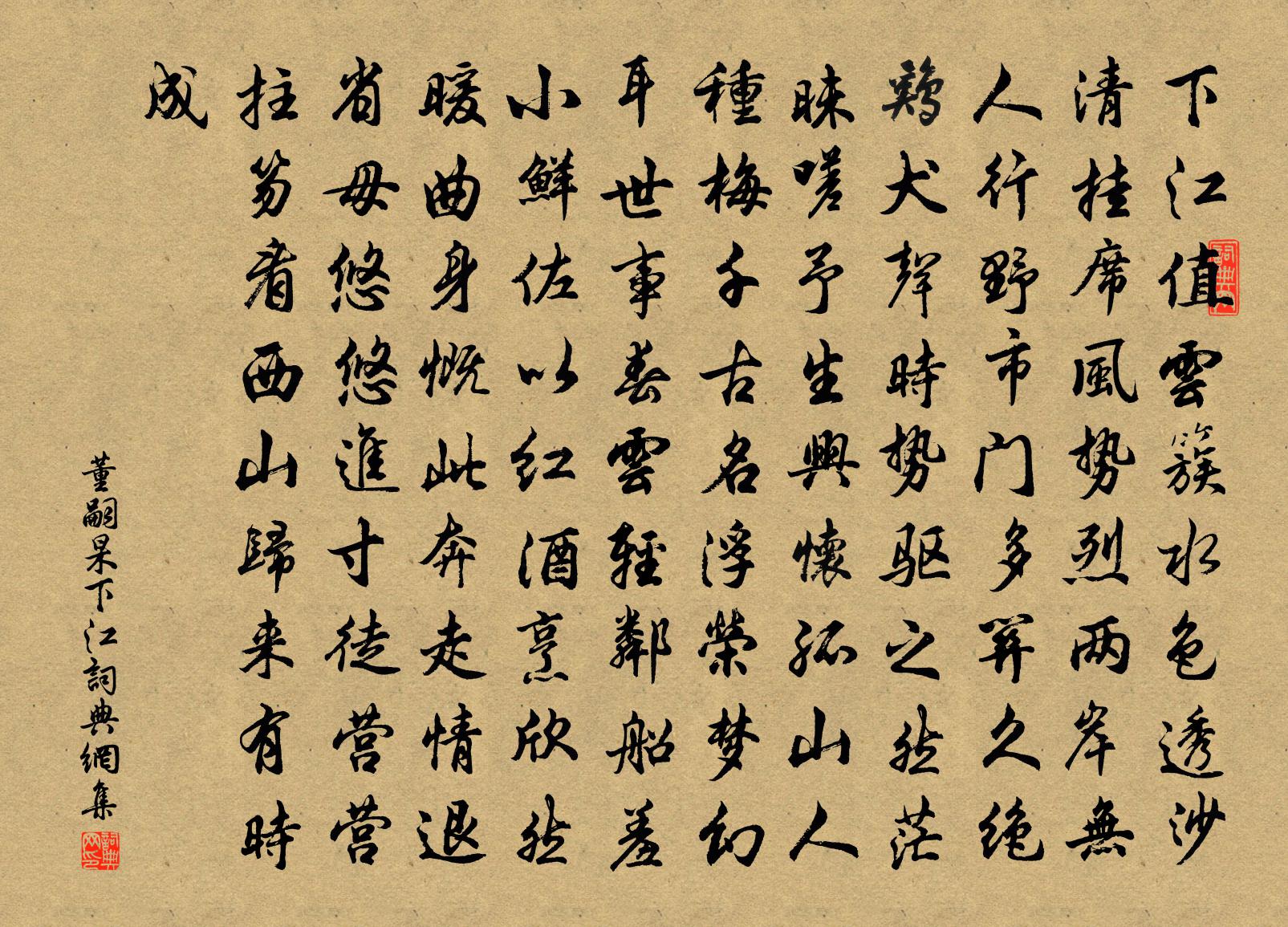 詩詞名句歷史字典書法欣賞書法字典國語詞典說文解字康熙字典古漢語字典標 題 作 者 詩 句 下江作者:董嗣杲 朝代:宋代下江原文下江值雲簇,水色透沙清。掛席風勢烈,兩岸無人行。野市門多關,久絕雞犬聲。時勢驅之然,茫昧嗟予生。興懷孤山人,種梅千古名。浮榮夢幻耳,世事春雲輕。鄰船羞小鮮,佐以紅酒烹。欣然暖曲身,慨此奔走情。退省毋悠悠,進寸徒營營。拄笏看西山,歸來有時成。詩詞問答問:下江的作者是誰?答:董嗣杲問:下江寫於哪個朝代?答:宋代董嗣杲下江書法欣賞下江書法作品詩詞推薦漁家傲晁沖之〔宋代〕浦口潮來沙尾漲。危檣半落帆游漾,水調不知何處唱。風淡盪。鱖魚吹起桃花浪。雪盡小橋梅總放。層樓一任愁人記小圃花果二十首劉克莊〔宋代〕但見空林摘,誰知園戶饞。詔書免包貢,野老可分甘。題嚴子陵祠二首(後首一作杜荀鶴詩)方乾〔唐代〕物色旁求至漢庭,一宵同寢見交情。先生不入雲台像,贏得桐江萬古名。蒼翠雲峰開俗眼,泓澄煙水浸塵心。惟將頌古七首釋道謙〔宋代〕太平時節歲豐盈,旅不齎糧戶不扃。官路無人夜無月,唱歌歸去恰三更。清涼院僧房致齋洪咨夔〔宋代〕花片牆陰晚,禽聲屋角晴。東風猶峭在,煨芋坐深明。和許守喜雨韻吳芾〔宋代〕千里焦枯頓郁蒼,邦人寧復慮年荒。大田一雨渾沾足,鄰壤群偷更伏藏。治郡羨君端有術,救民愧我獨無方。夜來再韻奉酬楊公遠〔宋代〕穿簾燕子作雙飛,怡是春光欲老時。公退只應無個事,山泉石鼎煮鑰旗。藍田溪雜詠二十二首窗里山錢起〔唐代〕遠岫見如近,千里一窗里。坐來石上雲,乍謂壺中起。謝人惠魚米潘從大〔宋代〕讀書乾祿不醫貧,饌厭寒葅甑欲塵。自笑淒涼彈鋏客,欣逢慵慨指囷人。江南縮項鮮堪鱠,浙右長腰色勝銀。盂飯酬和杜五弟晴朝獨坐見贈李嶠〔唐代〕平明坐虛館,曠望幾悠哉。宿霧分空盡,朝光度隙來。影低藤架密,香動藥闌開。未展山陽會,空留池上杯。木蘭花慢李曾伯〔宋代〕漸吾蓋鄉秋近,蓋正蓴美、蓋更鱸肥。蓋顧安得相從,征帆銜尾,飛蓋追隨。南中眼前事勢,正相持、邊腹一枰棋客中春思李中〔唐代〕又聽黃鳥綿蠻,目斷家鄉未還。春水引將客夢,悠悠繞遍關山。和十一侍郎韓維〔宋代〕地傳槐大井泉深,昔侍先庭此鎮臨。奉使共成三世澤,思親遠滄百年心。懷金豈足驕顏氏,抱瓮徒勞拙漢陰。抖擻浣溪沙劉辰翁〔宋代〕十日千機可復諧。郭郎感運豈仙才。人間自是少行媒。直上扶搖須九萬,滿前星斗共昭回。又傳賈客向曾來。借道冠有賦文天祥〔宋代〕病中蕭散服黃冠,笑倒群兒指為彈。秘監賀君曾道士,翰林蘇子亦祠官。酒壺釣具有時樂,茶灶筆床隨處安。幸有題靈岩各景明心洞元勛〔宋代〕僧房尚聞聲,雲扃已通步。觀身空翠間,宿靄避市屨。不須躡回蹤,逕自通仙路。閉合陸游〔宋代〕閉合孤城剩放慵,桐江清絕勝吳松。雲收忽見北山雪,月落正聞西寺鐘。世味老來無奈薄,土思病後不勝濃。蓴羹挽南塘趙尚書二首劉克莊〔宋代〕趙掌端平制,蕭蕭素髮新。更生宗室老,太白謫仙人。貴矣狨施馬,悲哉筆絕麟。誰為篆華表,題作宋詞臣。次單君范袖來汪西皋所譔詠秋十章以示因和之陳著〔宋代〕平生四海有知心,宿草秋風只感今。獨向西皋一回首,未曾平面已蘭金。念奴嬌(中秋獨坐)李綱〔宋代〕暮雲四卷,淡星河、天影茫茫垂碧。皓月浮空,人盡道,端的清圓如璧。丹桂扶疏,銀蟾依約,千古佳今夕。寒光名句推薦尋桃覓柳,開遍南枝未覺。辛棄疾《瑞鶴仙·賦梅》 一日萬機,一人聽斷,雖復憂勞,安能盡善?吳兢《貞觀政要·卷二·論求諫》 突營射殺呼延將,獨領殘兵千騎歸。李白《從軍行》 如來不應以具足諸相見。鳩摩羅什譯《金剛經·離色離相》 淮水東邊舊時月,夜深還過女牆來。劉禹錫《金陵五題·石頭城》 專勝者未必克,挾疑者未必敗。范曄《後漢書·列傳·烏桓鮮卑列傳》 開到荼蘼花事了。曹雪芹《紅樓夢·第六十三回》 禮者,人道之極也。荀子《荀子·禮論》 玉樹猶難伸,壓倒千竿竹。環山樵《薛寶釵·雪竹》 婿為燕國王,身被詔獄加。李白《秦女休行》