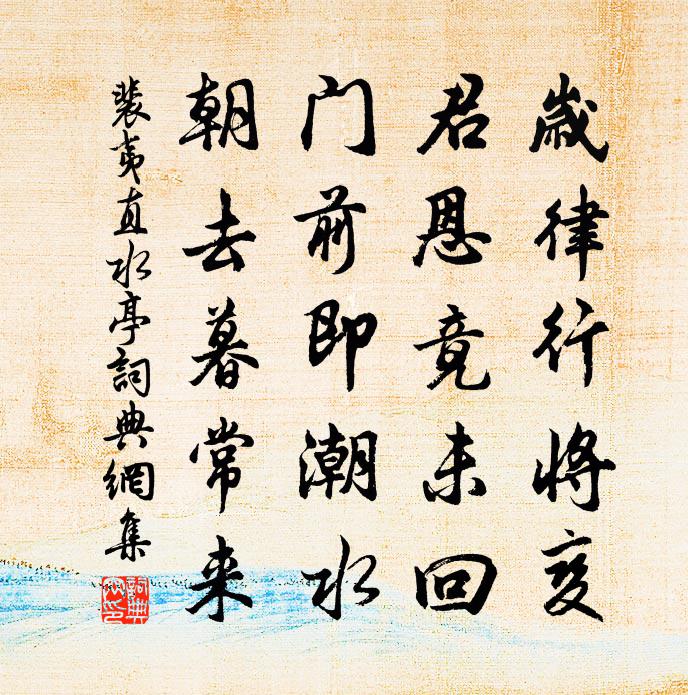詩詞名句歷史字典書法欣賞書法字典國語詞典說文解字康熙字典古漢語字典標 題 作 者 詩 句 水亭作者:裴夷直 朝代:唐代水亭原文歲律行將變,君恩竟未回。門前即潮水,朝去暮常來。詩詞問答問:水亭的作者是誰?答:裴夷直問:水亭寫於哪個朝代?答:唐代問:水亭是什麼體裁?答:五絕裴夷直水亭書法欣賞水亭書法作品注釋全唐詩:卷513-9詩詞推薦蝶戀花黃裳〔宋代〕一望瑤華初委地。更約幽人,共賞岩邊翠。拭把方諸聊與試。無情爭得無中淚。飛瀑恐從星漢至。漸向賓筵,但覺塞下感懷朱慶餘〔唐代〕塞下閒為客,鄉心豈易安。程塗過萬里,身事尚孤寒。竟日風沙急,臨秋草木殘。何年方致主,時拂劍塵看。次韻徐太博方岳〔宋代〕宗派鸕鶿煙雨外,釣蓑能得幾從清。坐無相印田三頃,捻到吟髭雪幾莖。剡曲船今寒昨夢,灞橋驢亦笑塵纓。南州南郊大禮詩王禹偁〔宋代〕千官雲擁御樓時,朝服紛紛換禮衣。萬里梯航歸大國,一聲雷雨破圜扉。青蠅傳去人人喜,丹鳳銜來處處飛。收盡題赤城中岩寺周朴〔唐代〕浮世師休話,晉時燈照岩。禽飛穿靜戶,藤結入高杉。存沒詩千首,廢興經數函。誰知將俗耳,來此避囂讒。送玉堂守永嘉曾由基〔宋代〕袞袞諸公塞要津,獨當椽笑演絲綸。久職清禁聊均佚,誰道明河不可親。畿郡喜迎賢太守,帝旁卻欠直詞臣。逸才送陳忠玉兼寄尹夢得黃仲通並寄季通侄五首張嵲〔宋代〕君歸多問尹夫子,疲後新詩定益工。鴻雁南來書不到,想應全未廢書空。獨步釋紹嵩〔宋代〕獨步時凝望,幽襟失所從。煙霞橫眼界,天地醉心胸。澤國秋容老,人家水影重。行窮十里嶺,回首興何慵。喜雨釋寶曇〔宋代〕麥吐經時雨,爐薰一寸雲。葉邊先策策,月墮故紛紛。待趣詩翁語,何曾菜色聞。問天渾不試,吾欲張吾軍。彭澄之告以卜築佐之一緡一石二絕句以為親舊曾豐〔宋代〕家無儲粟況儲錢,佐費吾其以義先。一石一緡未為厚,量渠背負與腰纏。百日假滿白居易〔唐代〕心中久有歸田計,身上都無濟世才。長告初從百日滿,故鄉元約一年回。馬辭轅下頭高舉,鶴出籠中翅大開。但拂漁家傲歐陽修〔宋代〕對酒當歌勞客勸。惜花只惜年華晚。寒艷冷香秋不管。情眷眷。憑欄盡日愁無限。思抱芳期隨塞雁。悔無深意傳雙水調歌頭 為仲方東園賦王惲〔元代〕野飲不稱意,歸促紫游韁。誰知草堂深處,清賞興尤長。夢裡佳人錦瑟,眼底瓦盆濁酒,衣袖醉淋浪。歌罷竹軒晚詩二首趙與時〔宋代〕粲粲香秔雪不如,新菘況復滿杯盂。侯門肉食紛紛是,有此清奇風味無。郊廟歌辭。享太廟樂章。永和魏徵〔唐代〕於穆烈祖,弘此丕基。永言配命,子孫保之。百神既洽,萬國在茲。是用孝享,神其格思。舟行即事二首張耒〔宋代〕去去路日遠,行行歲向深。晚田荒更闊,秋野曉多陰。岸蓼飛寒蝶,汀沙戲水禽。迎風蘆顫葉,眩日棗裝林。早蟹醉桃源(單葉荼蘼)趙師俠〔宋代〕纖枝延蔓走青虬。風清體更柔。故繞檀蕊著花稠。疏疏如綴旒。瓊作靨,玉成裘。玫瑰應輩流。惜香愁怕罥搔頭。寄清溪道友齊己〔唐代〕山門搖落空,霜霰滿杉松。明月行禪處,青苔繞石重。泉聲喧萬壑,鍾韻遍千峰。終去焚香老,同師大士蹤。鷓鴣天張掄〔宋代〕鶴馭來從玉席前。笑談勳業照凌煙。心游物外都無礙,春在壺中別有天。香似霧,酒如泉。華堂冰雪映神仙。靈椿玉樓春莫崙〔宋代〕綠楊芳徑鶯聲小。簾幕烘香桃杏曉。餘寒猶峭雨疏疏,好夢自驚人悄悄。憑君莫問情多少。門外江流羅帶繞。直饒名句推薦牆外行人,牆裡佳人笑。蘇軾《蝶戀花·春景》 身既死兮神以靈,魂魄毅兮為鬼雄。屈原《國殤》 即從巴峽穿巫峽,便下襄陽向洛陽。杜甫《聞官軍收河南河北》 金風細細。葉葉梧桐墜。晏殊《清平樂·金風細細》 山中也有千年樹,世上難逢百歲人。佚名《增廣賢文·上集》 修身以敬,勿托以尊。房玄齡《晉書·列傳·第八章》 水軟櫓聲柔,草綠芳洲,碧桃幾樹隱紅樓。左輔《浪淘沙·曹溪驛折桃花一枝數日零落裹花片投之涪江歌此送之》 謂誰朝來不作意,狂風挽斷最長條。杜甫《絕句漫興九首·其一》 賞罰不可輕行,用人彌須慎擇。吳兢《貞觀政要·卷三·論擇官》 試問鄉關何處是,水雲浩蕩迷南北。趙鼎《滿江紅·丁未九月南渡泊舟儀真江口作》