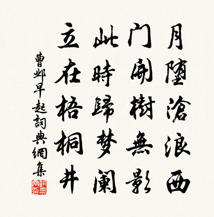 詩詞名句歷史字典書法欣賞書法字典國語詞典說文解字康熙字典古漢語字典標 題 作 者 詩 句 早起作者:曹鄴 朝代:唐代早起原文月墮滄浪西,門開樹無影。此時歸夢闌,立在梧桐井。詩詞問答問:早起的作者是誰?答:曹鄴問:早起寫於哪個朝代?答:唐代問:早起是什麼體裁?答:五古曹鄴早起書法欣賞早起書法作品注釋全唐詩詩文賞析立在:一作獨立。詩詞推薦滿庭芳(荷花)趙長卿〔宋代〕竹颭斜梢,荷傾餘瀝,晚風初到南池。雨收池上,高柳亂蟬嘶。冉冉蓮香滿院,夕陽映、紅浸庭闈。涼生到,碧瓜句潘興嗣〔宋代〕擬將十幅綃,繪出雲堂景。蓮藕花葉圖吳師道〔元代〕玉雪竅玲瓏,紛披綠映紅。生生無限意,只在苦心中。次韻酬洪監倉方岳〔宋代〕我輩從來不入時,知心粗有硯相隨。肯分雪屋十年夢,寫作秋山一段奇。簾靜堂深無比客,歲寒亭老有先師。梧桐秋暑張嵲〔宋代〕涉旬秋暑不可觸,發疏被汗如膏沐。忽然三日風撼山,冬裘未具膚生粟。去年登高作重九, * 未開新酒熟。今年次韻山居方岳〔宋代〕文如翻海百川朝,不說從前兩耳囂。徑與此山俱寂寂,未應吾道竟寥寥。一生不辦雕龍口,十萬誰纏騎鶴腰。但得浣溪沙·散步山前春草香張淑芳〔宋代〕散步山前春草香。朱闌綠水繞吟廊。花枝驚墮繡衣裳。或定或搖江上柳,為鶯為鳳月中篁。為誰掩抑鎖芸窗。郊廟歌辭祭汾陰樂章太簇角盧從願〔唐代〕坤元載物,陽樂發生。播殖資始,品匯鹹亨。列俎棋布,方壇砥平。神歆禋祀,後德惟明。申屠子迪游蘭亭次韻答之王冕〔元代〕茂林修竹蒼煙外,斷碣荒亭古道傍。俯仰乾坤慨今昔,笑談風月引壺觴。幽蘭垂佩莖莖紫,佳菊團金朵朵黃。誰信劉高士自畫琴橫膝前對雲起求詩葉適〔宋代〕試向遮岩擁壑時,弄弦調軫按前徽。未須寫就多情曲,饒與閒雲自在飛。兵部宋尚書輓詞二首周必大〔宋代〕北客今無幾,公才合奮飛。再期騫禁密,仍世攝途歸。星動尚書履,霜留御史威。桑榆初未逼,何乃露先晞。野意陸游〔宋代〕小東門外曳筇枝,白葛烏紗自一奇。閒客消遙無吏責,茂陰清潤勝花時。茶經每向僧窗讀,菰米仍於野艇炊。便覺偈頌一百二十三首釋祖欽〔宋代〕露地白牛黑黑,是處尋他不得。山青水綠,似有如無。眼見耳聞,依稀彷佛。全不顧時,蹄角卻在。才動著時,蹤疊嶂樓有懷吳門朱長文〔唐代〕虎邱換得敬亭山,句水松陵數舍間。天下難如兩州好,君恩乞與一身閒。慚無牒訴煩敲扑,喜有林泉數往還。猶想景定初元即事十首劉克莊〔宋代〕客駭蒙倛面,兒扶痀瘺身。有時臨鏡問,此老是何人。次韻子瞻特來高安相別先寄遲適遠卻寄邁迨過蘇轍〔宋代〕老兄騎騾日百里,據鞍作詩若翻水。忽吟春草思惠連,因之亦夢添丁子。群兒競長堪一笑,老馬臥餐何日起。聞兄瑟瑟釵溫庭筠〔唐代〕翠染冰輕透露光,墮雲孫壽有餘香。只因七夕回天浪,添作湘妃淚兩行。次韻閻刑部才元楊梅周必大〔宋代〕炎官傘照濤江紅,五月獻果明光宮。越人一枝古所重,蜀無他楊譜則同。玄珠更將赤水浴,流火呈祥復王屋。不伴題張幾仲所藏醉道士圖韓元吉〔宋代〕何須坐客總能文,呼酒相逢日暮雲。醉倒盡如狂道士,夜歸誰問故將軍。挽故知容州朝請陶公五首羅一龍〔宋代〕古貌如公更古心,宦情終淺道情深。區區飽暖何曾計,一字廉稱值萬金。名句推薦鄂王墳上草離離,秋日荒涼石獸危。趙孟頫《岳鄂王墓》 二月黃鶯飛上林,春城紫禁曉陰陰。錢起《贈闕下裴舍人》 滄江好煙月,門系釣魚船。杜牧《旅宿》 同天下之利者,則得天下;擅天下之利者,則失天下。姜子牙《六韜·文韜·文師》 行人日暮少,風雪亂山深。孔平仲《寄內·試說途中景》 年去年來白髮新,匆匆馬上又逢春。于謙《立春日感懷》 過橋分野色,移石動雲根。賈島《題李凝幽居》 紗窗日落漸黃昏,金屋無人見淚痕。劉方平《春怨》 平生多感激,忠義非外獎。李白《酬裴侍御對雨感時見贈》 凌余陣兮躐余行,左驂殪兮右刃傷。屈原《國殤》