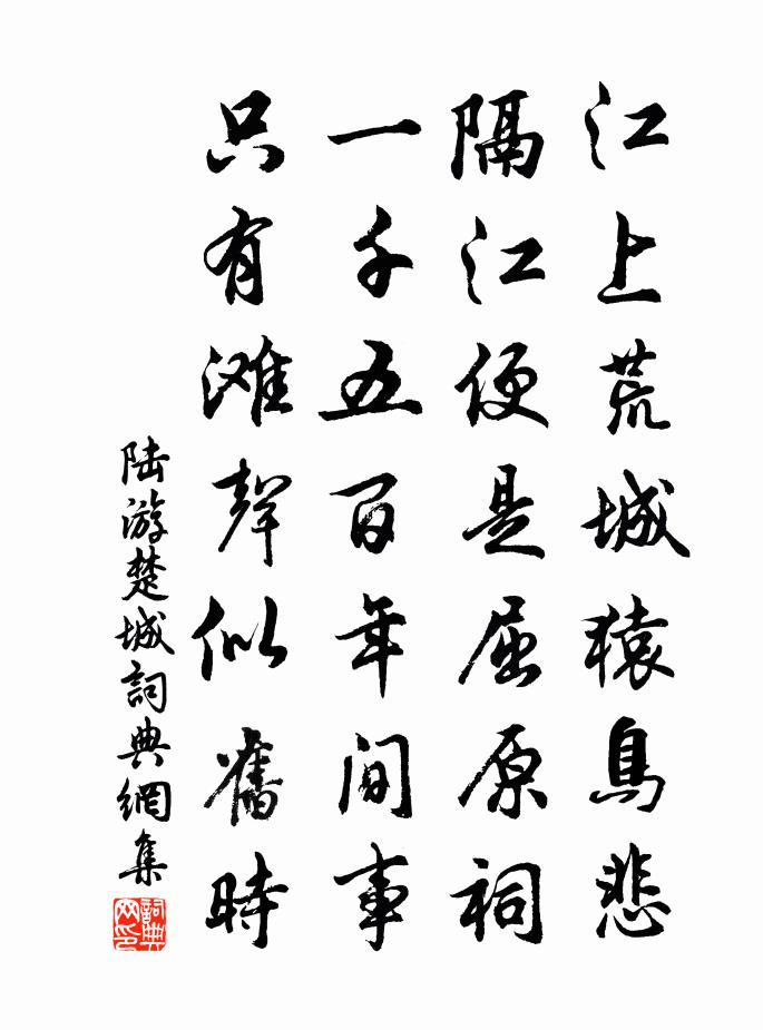 詩詞名句歷史字典書法欣賞書法字典國語詞典說文解字康熙字典古漢語字典標 題 作 者 詩 句 楚城作者:陸游 朝代:宋代楚城原文江上荒城猿鳥悲,隔江便是屈原祠。一千五百年間事,只有灘聲似舊時。詩詞問答問:楚城的作者是誰?答:陸游問:楚城寫於哪個朝代?答:宋代問:陸游的名句有哪些?答:陸游名句大全陸游楚城書法欣賞楚城書法作品詩詞推薦六朝門前趙劉聰周曇〔唐代〕戎羯誰令識善言,刑將不捨遽能原。垂成卻罷鳳儀殿,仍改逍遙納諫園。九吟詩石室吳昌裔〔宋代〕竹几 * 石室中,細書抱朴參同。寧聲碧眼朱高十,何必攜琴下閬風。次韻分司南京李誠之待制求酒二首蘇轍〔宋代〕春深風雨半相和,節物令人意緒多。中酒何須問賢聖,和詩今尚許羊何。高人不受塵土侵,三年浙江藏何深。久閒相和歌辭。銅雀妓皎然〔唐代〕強開尊酒向陵看,憶得君王舊日歡。不覺余歌悲自斷,非關艷曲轉聲難。仲宣樓落成和吳深源制參韻李曾伯〔宋代〕東都一星下東壁,粲以文鳴斗南一。玄德髀肉瞞白頭,俯仰宇宙俱漚浮。主人景升帝王胄,風土更羨遠中州。安能偈頌二百零五首釋正覺〔宋代〕只者便是,非像非鏡。誰主誰賓,何偏何正。縫罅莫我欺無孔之槌,錙銖莫我定無星之秤。聊將拄杖攪滄溟,令彼鷓鴣天(壽何簿乃尊)牟巘〔宋代〕鳩杖龐眉鶴髮仙。詩中有史筆如椽。愛蓮自是平生趣,吟到梅花晚更堅。珍九鼎,食萬錢。誰如有子采衣鮮。蜀陳和答葉無咎孫應時〔宋代〕百年一夢欲誰何,底事容心強揣摩。便續淵明歸去引,不題工部醉時歌。故山已恐鶴相怨,陋巷何妨雀可羅。多謝五更仇遠〔宋代〕一雞一雞鳴,夢覺天未曉。誰較夜短長,我睡不可少。夢保母如兒時姚勉〔宋代〕憶昔兒時衣百花,阿母扶我上戲車。兩歲讀書未離乳,書罷尋乳猶歸家。年方十三失阿保,弱冠慈母仙去早。只今暮春感懷強至〔宋代〕雨聲日夜催春老,不顧愁人鬢欲華。堂上自來相熟燕,樹間猶有未飛花。詩篇閒里曾無數,酒盞生前亦有涯。傳語大龍湫薛師石〔宋代〕昔聞天下山,衡岳稱崇丘。又聞天下水,江漢為巨流。古有山海經,歷歷敘九州。李唐三百載,詩家無一留。及觀示程介夫馬廷鸞〔宋代〕流年何必共君參,九瑣青山老一庵。試檢樂天詩集看,明年半百又加三。寓興林寬〔唐代〕西母一杯酒,空言浩劫春。英雄歸厚土,日月照閒人。衰草珠璣冢,冷灰龍鳳身。茂陵驪岫晚,過者暗傷神。薔薇花張祜〔唐代〕曉風抹盡燕支顆,夜雨催成蜀錦機。當晝開時正明媚,故鄉疑是買臣歸。春日小園即事十首方回〔宋代〕閒園草劃欠樓台,一紀干戈夢裡回。盡失牡丹三百本,新移初見一枚開。句徐仲謀〔宋代〕郡城重疊安寢有時延皓月,白起徐鈞〔宋代〕投降趙卒本求生,坑後誰人不死爭。三召三辭寧自刎,邯鄲料不再長平。秋日早朝(一作秋日候扇)許渾〔唐代〕宵衣應待絕更籌,環佩鏘鏘月下樓。井轉轆轤千樹曉,鎖開閶闔萬山秋。龍旗盡列趨金殿,雉扇才分見玉旒。虛戴西湖訪梅吳泳〔宋代〕欲休不休歲垂晚,似冷不冷霜復晴。起撐湖船訪梅去,一點兩點藏林坰。主林無神花氣薄,樹影庚庚香漠漠。誰能名句推薦明月何皎皎,照我羅床幃。佚名《明月何皎皎》 芙蓉金菊斗馨香。天氣欲重陽。晏殊《訴衷情·芙蓉金菊斗馨香》 去年花里逢君別,今日花開已一年。韋應物《寄李儋元錫》 雪洗虜塵靜,風約楚雲留張孝祥《水調歌頭·和龐佑父》 遺廟丹青落,空山草木長。杜甫《武侯廟》 滿眼韶華,東風慣是吹紅去。幾番煙霧,只有花難護。陳子龍《點絳唇·春日風雨有感》 野臣潛隨擊壤老,日下鼓腹歌可封。鮑防《元日早朝行》 泰山嵯峨夏雲在,疑是白波漲東海。李白《早秋單父南樓酬竇公衡》 知音如不賞,歸臥故山秋。賈島《題詩後》 伏波惟願裹屍還,定遠何鬚生入關。李益《塞下曲》