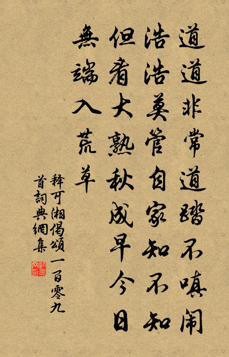 詩詞名句歷史字典書法欣賞書法字典國語詞典說文解字康熙字典古漢語字典標 題 作 者 詩 句 偈頌一百零九首作者:釋可湘 朝代:宋代偈頌一百零九首原文道道,非常道。踏不嗔,鬧浩浩。莫管自家知不知,但看大熟秋成早。今日無端入荒草。詩詞問答問:偈頌一百零九首的作者是誰?答:釋可湘問:偈頌一百零九首寫於哪個朝代?答:宋代釋可湘偈頌一百零九首書法欣賞偈頌一百零九首書法作品詩詞推薦和司法張仲良醉中論詩楊萬里〔宋代〕醉語醒猶記,來詩讀轉新。不綠明好密,其柰客居貧。無乃陽秋誤,云何鼠朴珍。端今和者寡,敢以速為神。夢丹書李亨〔唐代〕厥不云乎,惟其惟時。上天所保,福祿不虧。題賈巡官林亭楊巨源〔唐代〕白鳥閒棲亭樹枝,綠樽仍對菊花籬。許詢本愛交禪侶,陳寔由來是好兒。明月出雲秋館思,遠泉經雨夜窗知。門前滕縣時同年西園蘇軾〔宋代〕人皆種榆柳,坐待十畝陰。我獨種松柏,守此一寸心。君看閭裡間,盛衰日駸駸。種木不種德,聚散如飛禽。老時宿江原縣東十里張氏亭子未明而起陸游〔宋代〕寸廩驅人卒歲勞,一官坐失布衣高。劍南十月霜猶薄,江上五更雞亂號。孤枕擁衾尋短夢,青燈照影著征袍。客愁句周邦彥〔宋代〕人從生處樂,誰向死前休。贈金勵睡詩二首陳摶〔宋代〕至人本無夢,其夢本遊仙。真人本無睡,睡則浮雲煙。爐里近為樂,壺中別有天。欲知睡夢裡,人間第一玄。大龍湫薛師石〔宋代〕昔聞天下山,衡岳稱崇丘。又聞天下水,江漢為巨流。古有山海經,歷歷敘九州。李唐三百載,詩家無一留。及觀帝京二首殷堯藩〔唐代〕列郡徵才起俊髦,萬機獨使聖躬勞。開藩上相頒龍節,破虜將軍展豹韜。地入黃圖三輔壯,天垂華蓋七星高。迎春望嶧山呂定〔宋代〕極目東山秀色濃,紫霄千葉醉芙蓉。題詩尚記仙人洞,飛佩曾過玉女峰。樹老孤桐秋露下,碑殘古篆暮雲封。何時蜀相廟汪元量〔宋代〕我謁武侯祠,陰郎草淒淒。當時南陽結廬學龍臥,深山大澤無人知。胡為蜀先主,三顧前致辭。欲煩恢復天下計,觀扱兔梅堯臣〔宋代〕莽莽蒿萊下,紛紛狡兔迷。枯枝坐守者,若個是忘歸。代京尹吳山雲益雪應賀廟堂二首陳著〔宋代〕安排寒事做年華,老手薇垣第一家。神女先馳行雨旆,馮夷隨翦舞風花。萬塵並納真平等,一色橫陳絕點瑕。養樂奉和幸韋嗣立山莊侍宴應制李乂〔唐代〕曲榭迴廊繞澗幽,飛泉噴下溢池流。祗應感發明王夢,遂得邀迎聖帝游。【雙調】沉醉東風關漢卿〔元代〕面比花枝解語,眉橫柳葉長疏。想著雨和雲,朝還暮,但開口只是長吁。紙鷂兒休將人廝應付,肯不肯懷兒里便許送韋十六評事充同谷郡防禦判官杜甫〔唐代〕昔沒賊中時,潛與子同游。今歸行在所,王事有去留。逼側兵馬間,主憂急良籌。子雖軀幹小,老氣橫九州。挺身御溝水王貞白〔唐代〕一帶御溝水,綠槐相蔭清。此中涵帝澤,無處濯塵纓。鳥道來雖險,龍池到自平。朝宗本心切,願向急流傾。晚夏西園二首宋祁〔宋代〕道樾陰陰密,畦泉活活流。梨成津向潤,瓜熟子相鉤。汝墳貧女梅堯臣〔宋代〕汝墳貧家女,行哭音悽愴。自言有老父,孤獨無丁壯。郡吏來何暴,官家不敢抗。督遣勿稽留,龍種去攜杖。勤勤疾風伯張嵲〔宋代〕不雨經時氣若焚,共欣疏點夜深聞。平明忽捲重陰盡,可是風師待策勛。名句推薦盈盈一點芳心,占多少春光,問卿知否?紅妝莫斗顧太清《玉燭新·白海棠》 悲霜雪之俱下兮,聽潮水之相擊。屈原《九章》 一切都是命,半點不由人。佚名《增廣賢文·上集》 我欲穿花尋路,直入白雲深處,浩氣展虹霓。黃庭堅《水調歌頭·遊覽》 江送巴南水,山橫塞北雲王勃《江亭夜月送別二首》 一粥一飯,當思來處不易;半絲半縷,恆念物力維艱。朱柏廬《朱子家訓·全文》 故園腸斷處,日夜柳條新。宋之問《途中寒食題黃梅臨江驛寄崔融》 千里江山昨夢非,轉眼秋光如許。文徵明《念奴嬌·中秋對月》 日月盈昃,辰宿列張。周興嗣《千字文·全文》 橋北橋南千百樹,綠煙金穗映清流。朱栴《官橋柳色》