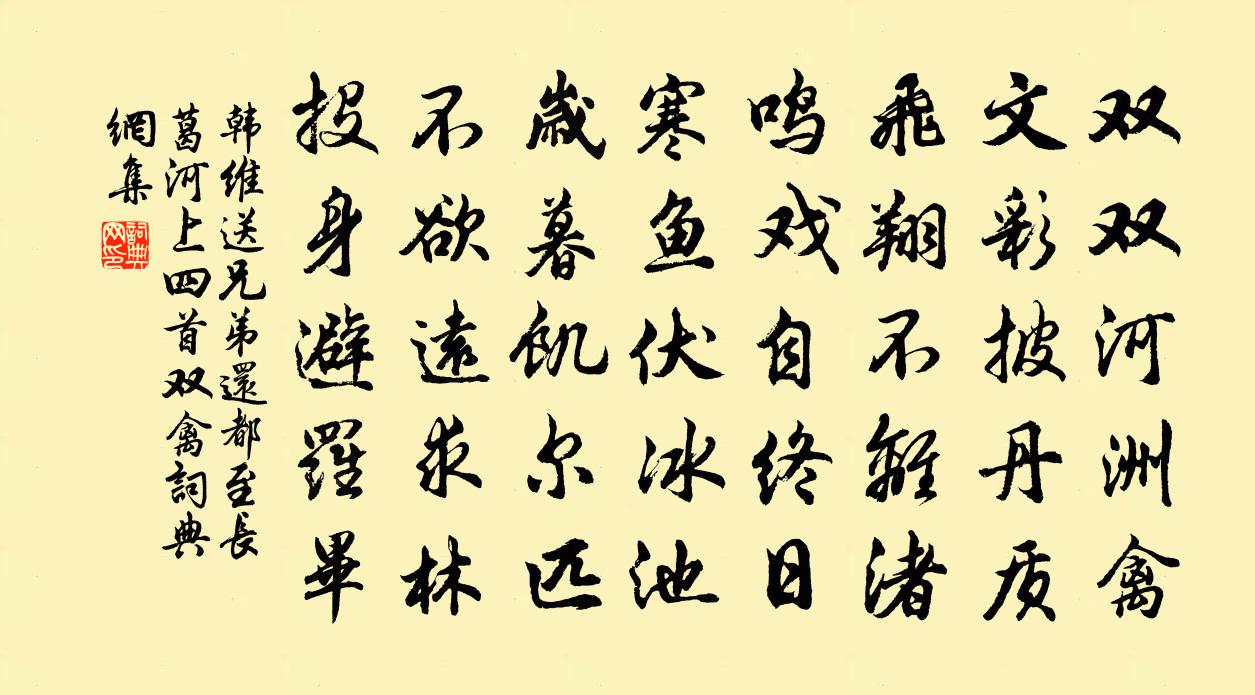 詩詞名句歷史字典書法欣賞書法字典國語詞典說文解字康熙字典古漢語字典標 題 作 者 詩 句 送兄弟還都至長葛河上四首雙禽作者:韓維 朝代:宋代原文雙雙河洲禽,文彩披丹質。飛翔不離渚,鳴戲自終日。寒魚伏冰池,歲暮飢爾匹。不欲遠求林,投身避羅畢。詩詞問答問:《送兄弟還都至長葛河上四首雙禽》的作者是誰?答:韓維問:該詩寫於哪個朝代?答:宋代書法欣賞送兄弟還都至長葛河上四首雙禽書法作品詩詞推薦賈節庵冒夏暑越修塗過我苕霅情誼甚厚令聞古牟巘五〔宋代〕英英君令弟,介烈夙所秉。就死得處所,我意復何恨。用洪景之韻送郭子山強至〔宋代〕別筵那得易為情,別酒連連只自傾。車馬縱游憐客興,江湖幽適負吾生。盤中異味歸南食,篋里新詩記北行。文史讀王摩詰詩愛其散發晚未簪道書行尚把之句因陸游〔宋代〕仕宦五十年,所至不黔突,取魚固舍熊,挾兔那恨鶻。退歸息厭厭,誰敢書咄咄。屋穿每茨草,驢瘦可數骨。秋風高其佩指頭畫虎乾隆〔清代〕鐵嶺老人閻李流,畫不用筆用指頭,縱橫揮灑饒奇趣,晚年手法彌警遒。為吾染指畫蒼虎,氣橫幽壑寒颼颼,落墨花月詞曹勛〔宋代〕花光露重春煙濕,鶴去瑤台人竚立。坐見欄乾月腳西,景入長門金鎖澀。花開直莫媚春風,春風代謝如呼吸。六七月之交山中涼甚陸游〔宋代〕城市方炎熱,村墟乃爾涼。拂窗桐葉下,繞舍稻花香。獨鶴警秋露,雙螢明屋樑。臥聞機婦織,感嘆夜初長。訴衷情趙長卿〔宋代〕花前月下會鴛鴦。分散兩情傷。臨行祝付真意,臂間皓齒留香。還更毒,又何妨。盡成瘡。瘡兒可後,痕兒見在,水調歌頭呂渭老〔宋代〕其兄進道作水調歌頭一韻,幾二十首,讀之,殆不勝情。次其韻作一篇,懷其人,亦以贈元發、說道扁舟思獨往,十六觀經頌水觀第二釋遵式〔宋代〕次作水想見西方,一切皆為淨土水。既見水已想成冰,皎然映徹琉璃地。普天樂·翠荷殘滕賓〔元代〕翠荷殘,蒼梧墜。千山應瘦,萬木皆稀,蝸角名,蠅頭利。輸與淵明陶陶醉,盡 * 圍繞東籬。良田數頃,黃牛二句李邴〔宋代〕古來重九皆如此,無復龍山劇孟嘉。題駱秀才葺故廬疏何應龍〔宋代〕家在西湖合澗橋,短籬圍得數椽茅。歸來頗費支撐力,羞見春風燕子巢。次韻葛天民蘇泂〔宋代〕搗柏為香炷,煎茶當酒杯。鬢因兒女雪,心向利名灰。茅屋湖邊住,柴扉柳下開。殘年未歸去,排日為公來。滾繡球楊巽齋〔宋代〕琢玉英標不染塵,光涵月影愈清新。青皇宴罷呈餘技,拋向東風展轉頻。庭際新移松竹齊己〔唐代〕三莖瘦竹兩株松,瑟瑟悠悠韻且同。抱節乍離新澗雪,盤根遠別舊林風。歲寒相倚無塵地,蔭影分明有月中。更待題周氏庵蘇泂〔宋代〕緩步勝騎馬,迷塗問跨牛。蓴絲方擾擾,湖水亦悠悠。解後因成款,淹留卻當游。旁觀君共我,真是兩沙鷗。早春會王逵主人得蓬字李端〔唐代〕今年華鬢色,半在故人中。欲寫無窮恨,先期一醉同。綠叢猶覆雪,紅萼已凋風。莫負歸山契,君看陌上蓬。綺懷十六首·其十五黃景仁〔清代〕幾回花下坐 * ,銀漢紅牆入望遙。似此星辰非昨夜,為誰風露立中宵? * 思盡抽殘繭,宛轉心傷剝後蕉。三五往銀山深道亡寺觀暮投宿民居李新〔宋代〕入谷清光寒刮眼,遠分蒼樹繞樓台。急鏘環佩豀流迅,晚下牛羊雪跡開。山影不隨雲影轉,竹聲長作雨聲來。野梅秋居雜詠十首李彌遜〔宋代〕茅茨入作椽,中有插架軸。琅函與貝葉,落落皆在目。閒依淨幾繙,緩繞疏篁讀。困即抱這眠,擁鼻寧厭熟。不知名句推薦拔劍擊大荒,日收胡馬群。杜甫《後出塞五首》 煙橫水際,映帶幾點歸鴉,東風銷盡龍沙雪。賀鑄《石州引·薄雨初寒》 金風細細。葉葉梧桐墜。晏殊《清平樂·金風細細》 千古風流八詠樓,江山留與後人愁。李清照《題八詠樓》 日暖桑麻光似潑,風來蒿艾氣如薰。蘇軾《浣溪沙·軟草平莎過雨新》 渺萬裡層雲,千山暮雪,隻影向誰去?元好問《摸魚兒·雁丘詞 / 邁陂塘》 反者道之動;弱者道之用。老子《老子·德經·第四十章》 窗含西嶺千秋雪,門泊東吳萬里船。杜甫《絕句》 以繩墨取木,則宮室不成矣。呂不韋《呂氏春秋·覽·離俗覽》 當時父母念,今日爾應知。白居易《燕詩示劉叟》