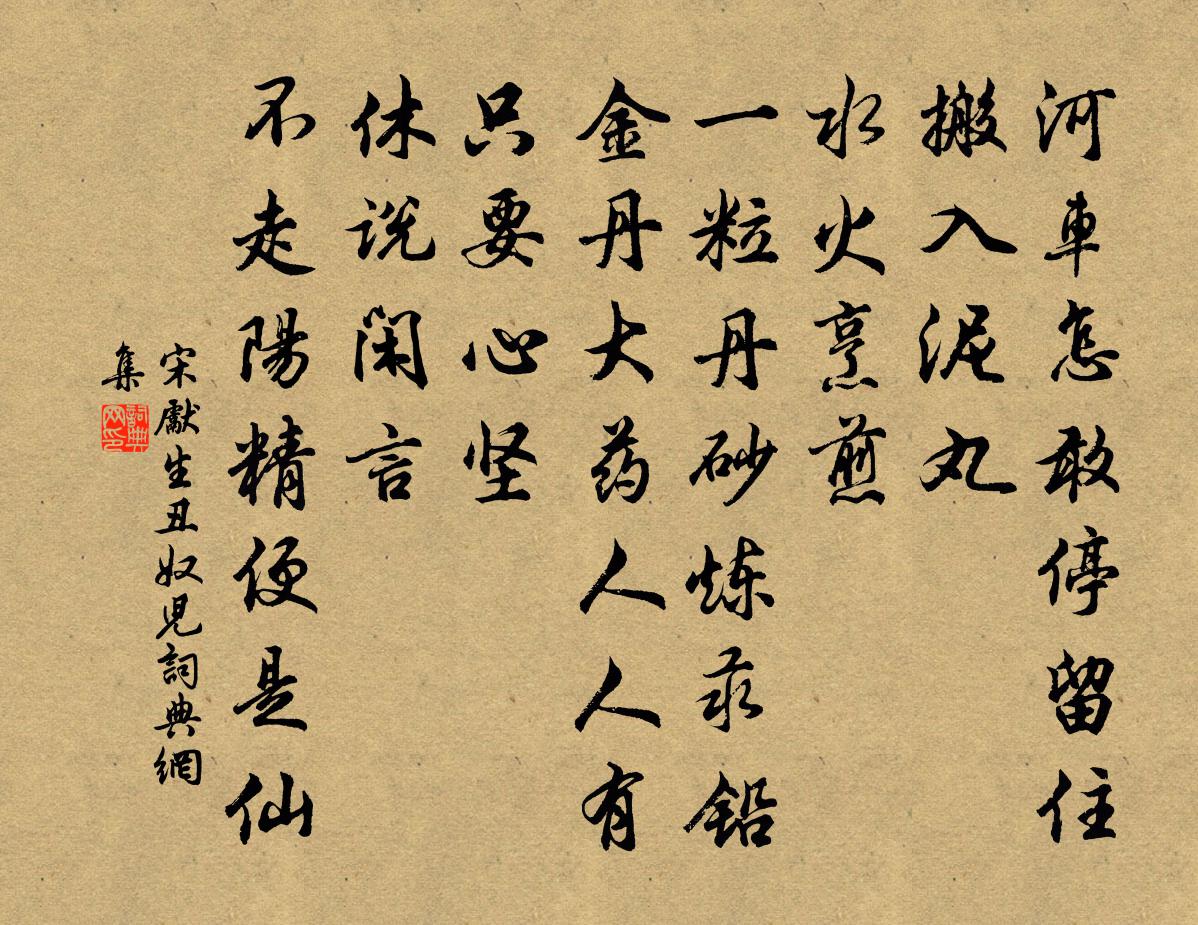 詩詞名句歷史字典書法欣賞書法字典國語詞典說文解字康熙字典古漢語字典標 題 作 者 詩 句 醜奴兒/採桑子作者:宋先生 朝代:宋代醜奴兒/採桑子原文河車怎敢停留住,搬入泥丸。水火烹煎。一粒丹砂鍊汞鉛。金丹大藥人人有,只要心堅。休說閒言。不走陽精便是仙。詩詞問答問:醜奴兒/採桑子的作者是誰?答:宋先生問:醜奴兒/採桑子寫於哪個朝代?答:宋代問:醜奴兒/採桑子是什麼體裁?答:詞宋先生醜奴兒/採桑子書法欣賞醜奴兒/採桑子書法作品詩詞推薦次方雲台韻陳宓〔宋代〕泉石膏盲世欲忘,扁舟更遡壽湖光。也知他日持荷橐,不似閒時制芰裳。雨後尚餘新稻熟,風前偏覺荔枝香。人生過京口以南見竹林楊萬里〔宋代〕行從江北別梅兄,歸到江南見竹君。卻憶西湖湖上寺,梅花如雪竹如雲。和沖老雪頌韓維〔宋代〕揉絮瓊飛曉尚飄,平吞六合蔽層霄。從來不打禾山鼓,且向樽前看綠腰。狀江南仲春謝良輔〔唐代〕江南仲春天,細雨色如煙。絲為武昌柳,布作石門泉。司戶攝淳安丞同官送至西湖支使有詩因次韻徐僑〔宋代〕把酒湖亭一笑逢,沿湖猶擁綠叢叢。倒涵嵐影晴煙紫,回射城陰夕照紅。愁緒不關歌舞外,交情卻在別離中。片帆蝶戀花晏殊〔宋代〕南雁依稀回側陣。雪霽牆陰,偏覺蘭牙嫩。中夜夢余消酒困。爐香卷穗燈生暈。急景流年都一瞬。往事前歡,未免瑞鶴仙王千秋〔宋代〕征鴻翻塞影。悵悲秋人老,渾無佳興。鳴蛩問酒病。更堆積愁腸,摧殘詩鬢。起尋芳徑。菊羞人、依叢半隱。又豈山中贈客顧況〔唐代〕山中好處無人別,澗梅偽作山中雪。野客相逢夜不眠,山中童子燒松節。長恨歌白居易〔唐代〕漢皇重色思傾國,御宇多年求不得。楊家有女初長成,養在深閨人未識。天生麗質難自棄,一朝選在君王側。回眸端午帖子詞二十首九夫人合五首歐陽修〔宋代〕涼生玉宇來風細,日永金徒報漏稀。皎潔冰壺清水殿,三千爭捧赭黃衣。紹興登門肆赦二首佚名〔宋代〕拜況於郊,皇哉唐哉。熙事休成,六騑鼎來。天間以決,地垠以開。隕祉發祥,如登春台。田舍即事十首劉克莊〔宋代〕小築三家聚,新篘萬戶春。昔豪幾腐脅,今病罕沾唇。太古華胥氏,豐年畏壘人。超然市朝外,未易葛天民。春日村居章甫〔宋代〕村迥客來少,山寒春到遲。修塘留野水,插槿補疏籬。旁舍閒相過,幽人舊有期。出門看遠燒,拄杖立多時。別李三元稹〔唐代〕階蓂附瑤砌,叢蘭偶芳藿。高位良有依,幽姿亦相托。鮑叔知我貧,烹葵不為薄。半面契始終,千金比然諾。人生田舍雜興懷長兄四首廖行之〔宋代〕去城靳靳路一驛,故歲迢迢今甫來。桃李陰成真綠野,溪山清絕勝章台。青衫手板徒勞爾,竹杖芒鞋亦快哉。莫向琴白玉蟾〔宋代〕夜靜無雲月似銀,清宵鶴唳一傷神。子期玉骨寒於雪,世上知音能幾人。邵州陪王郎中宴楊巨源〔唐代〕西塞無塵多玉筵,貔貅鴛鷺儼相連。紅茵照水開樽俎,翠幕當雲發管弦。歌態曉臨團扇靜,舞容春映薄衫妍。魯儒客枕不寐二首陳造〔宋代〕老羨平生睡作魔,矧因多病覆金荷。起憑曲幾頻搔首,如此迢迢良夜何。浪吟於石〔宋代〕十載驅馳翰墨場,翩翩霞佩高頡頏。賦窺賈馬搜班揚,詩崇晉漢卑齊梁。斯文未喪道未亡,欲尋墜緒何茫茫。蕭騷後園小池李復〔宋代〕鑿地開方斷石根,潤通草樹亦欣欣。築基偏傍孤亭闊,引水初從曲徑分。風約落花回近岸,露垂欹竹滴圓紋。春晴名句推薦拆桐花爛漫,乍疏雨、洗清明。柳永《木蘭花慢·拆桐花爛漫》 向淺洲遠渚,亭亭清絕。張炎《疏影·詠荷葉》 侈而墮者貧,而力而儉者富。韓非及後人《韓非子·顯學》 白馬繞旌旗,悲鳴相追攀。李白《豫章行》 壚邊人似月,皓腕凝霜雪。韋莊《菩薩蠻·人人盡說江南好》 念碎劈芳心,縈思千縷,贈將幽素,偷翦重雲。吳文英《風流子·黃鐘商芍藥》 天下者、大具也,不可以小人有也,不可以小道得也,不可以小力持也。荀子《荀子·正論》 別來半歲音書絕,一寸離腸千萬結。韋莊《應天長·別來半歲音書絕》 數州訊息斷,愁坐正書空。杜甫《對雪》 憑畫檻,雨洗秋濃人淡。厲鶚《謁金門·七月既望湖上雨後作》