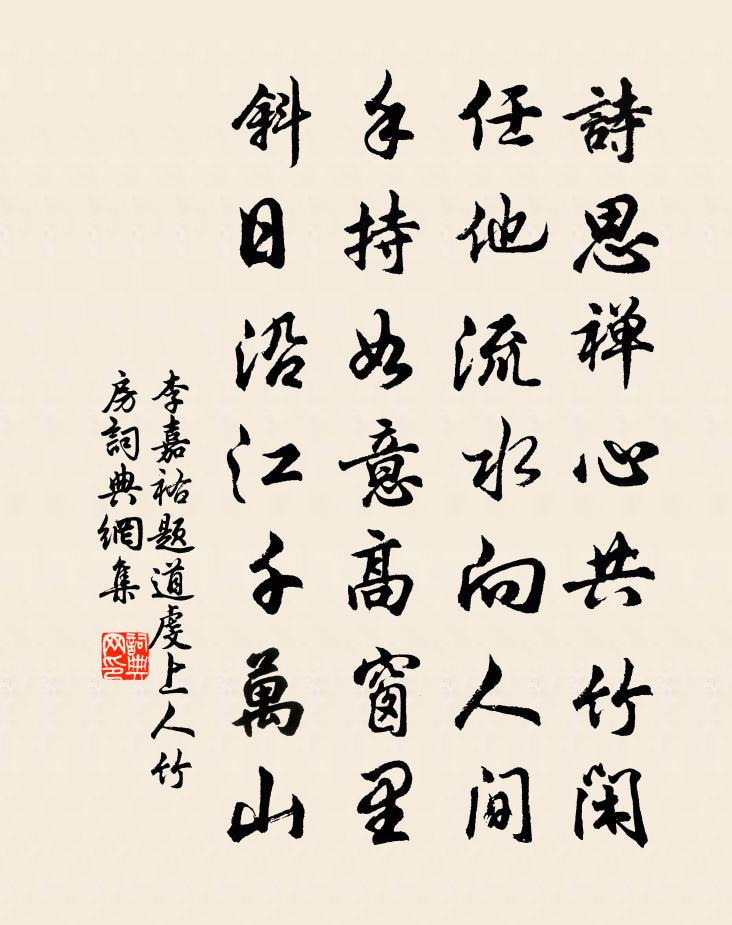 詩詞名句歷史字典書法欣賞書法字典國語詞典說文解字康熙字典古漢語字典標 題 作 者 詩 句 題道虔上人竹房作者:李嘉祐 朝代:唐代題道虔上人竹房原文詩思禪心共竹閒,任他流水向人間。手持如意高窗里,斜日沿江千萬山。詩詞問答問:題道虔上人竹房的作者是誰?答:李嘉祐問:題道虔上人竹房寫於哪個朝代?答:唐代李嘉祐題道虔上人竹房書法欣賞題道虔上人竹房書法作品注釋全唐詩:卷207_44詩詞推薦摸魚兒黃機〔宋代〕惜春歸、送春惟有,亂紅撲蔌如雨。亂紅也怨春狼藉,搵得淚痕無數。腸斷處。更喚起、瓊鵲催髮長亭路。征鞍難直舍獨坐思成都陸游〔宋代〕錦城花絮送吳船,屈指東歸又幾年。群玉峰頭身老矣。百花潭上夢依然。青衫尚記稱狂客,白髮寧知作老僊?所恨織圖二十四首翦帛樓璹〔宋代〕低眉事機杼,細意把刀尺。盈盈彼美人,翦翦其束帛。輸官給邊用,辛苦何足惜。大勝漢繚綾,粉涴不再著。詠史詩高陽池胡曾〔唐代〕古人未遇即銜杯,所貴愁腸得酒開。何事山公持玉節,等閒深入醉鄉來。重陽臨安舟中作陳藻〔宋代〕小船獨坐看平洋,歷歷登高舊事長。戲把此身觀變化,今年無酒過重陽。青陽龍池山潮泉其應有時禱於泉上坐頃三應山韓元吉〔宋代〕八月錢塘岸,江潮晝殷雷。豈知驚浪誦,不轉此峰來。古竇深無際,神淵秘莫開。山靈如愛我,三送雪成堆。端午內中帖子詞皇后閣王珪〔唐代〕夕然辟惡仙香度,朝結延年帝縷成。願上玉宸千萬壽,薰風常泛舜弦聲。題清虛庵皇甫真人坦之隱居李塾〔宋代〕寶墨光分眄禁春,超然晏坐寂怡神。力辭漢殿從遊樂,乞得康廬自在身。黃屋記曾參扈從,白衣猶憶指山人。恐虛常州太平寺法華院薝蔔亭醉題蘇軾〔宋代〕六花薝蔔林間佛,九節菖蒲石上仙。何似東坡鐵拄杖,一時驚散野狐禪。詠史下慕容恪陳普〔宋代〕一聽芭蕉葉上寒,鼻頭倍益舊時酸。河清未遇三千歲,水手猶輕十八灘。西軒陳與義〔宋代〕平生江海志,歲暮僧廬中。虛齋時獨步,遡此西窗風。初夏氣未變,幽居念方沖。三日無客來,門外生蒿蓬。輕陰泉州南郭二首劉克莊〔宋代〕閩人務本亦知書,若不耕樵必業儒。惟有桐城南郭外,朝為原憲莫陶朱。與楷知倉釋正覺〔宋代〕米坊能者較些些,七百僧中獨作家。半夜傳來衣有據,機前收得鏡無瑕。祖師只麽閒舂碓,若子如今莫撒沙。古井擬長安春詞皎然〔唐代〕春信在河源,春風盪妾魂。春歌雜鶗鴂,春夢繞轘轅。春絮愁偏滿,春絲悶更繁。春期不可定,春曲懶新翻。自普照游二庵蘇軾〔宋代〕長松吟風晚雨細,東庵半掩西庵閉。山行盡日不逢人,浥浥野梅香入袂。居僧笑我戀清景,自厭山深出無計。我雖詠梅雜詩張道洽〔宋代〕疎花清曉嫩寒時,粉蝶霜禽總不知。未有風流如此老,為渠費盡雪橋詩。風州郡樓上書所見邵雍〔宋代〕楊柳垂青帶,風動如飛蓋。危樓思不窮,盡日閒相對。鳥去林自空,雲移山不礙。情隨雙燕還,意與孤鴻會。晚角見野祭者朱繼芳〔宋代〕餳粥初香未賜煙,百金難買過湖船。南屏山下何年骨,猶向人間覓紙錢。【黃鐘】人月圓 中秋小酌宋褧〔元代〕紅螺香灩金莖露,清興溢璇霄。玉盤光冷,雲鬢霧濕,丹闕煙銷。□□此夜,明年明月,何似今宵。西風喚我,瑤樂毅吟邵雍〔宋代〕樂毅事燕時,其心有深旨。破齊七十城,迎刃不遺矢。豈留即墨莒,卻與燕有二。欲使燕遂王,天下自齊始。豈意名句推薦丈夫一言許人,千金不易。司馬光《資治通鑑·唐紀二》 夢入藍橋,幾點疏星映朱戶。吳文英《荔枝香近·七夕》 小荷才露尖尖角,早有蜻蜓立上頭。楊萬里《小池》 若要人不知,除非己莫為。佚名《增廣賢文·上集》 生怕見花開花落,朝來塞雁先還。辛棄疾《漢宮春·立春日》 無智無以成奸,其智陰也。有善無以為奸,其知存也。來俊臣《羅織經·察奸卷第八》 分手脫相贈,平生一片心。孟浩然《送朱大入秦》 絲槐煙柳長亭路,恨取次、分離去。惠洪《青玉案·絲槐煙柳長亭路》 好夢欲成還又覺,綠窗但覺鶯啼曉。施耐庵《蝶戀花·一別家山音信杳》 物是人非事事休,欲語淚先流。李清照《武陵春·春晚》