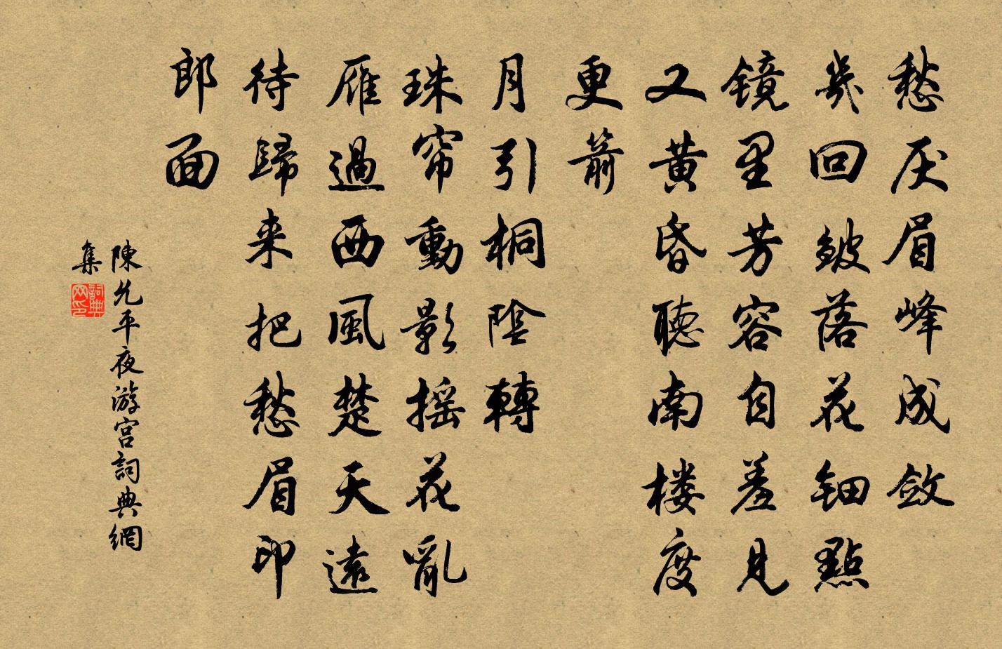 詩詞名句歷史字典書法欣賞書法字典國語詞典說文解字康熙字典古漢語字典標 題 作 者 詩 句 夜遊宮作者:陳允平 朝代:宋代夜遊宮原文愁厭眉峰成斂。幾回皺、落花鈿點。鏡里芳容自羞見。又黃昏,聽南樓,度更箭。月引桐陰轉。珠簾動、影搖花亂。雁過西風楚天遠。待歸來,把愁眉,印郎面。詩詞問答問:夜遊宮的作者是誰?答:陳允平問:夜遊宮寫於哪個朝代?答:宋代問:夜遊宮是什麼體裁?答:詞陳允平夜遊宮書法欣賞夜遊宮書法作品詩詞推薦東庵上方趙蕃〔宋代〕地瘠不宜行,山寒多種松。路窮千折險,庵在最高峰。石溜通泉乳,晴檐喧蜜蜂。客來僧不語,日暮自鳴鐘。述懷(校書娶崔時年已暮崔微有慍色賦詩述懷)崔氏〔唐代〕不怨盧郎年紀大,不怨盧郎官職卑。自恨妾身生較晚,不及盧郎年少時。寄題林景思雪巢六言三首范成大〔宋代〕何處溫泉火井,誰家熊席狐裘。堂燕几番炎熱,冰蠶一繭綢繆。龍池二絕王令〔宋代〕滿目塵埃白日陰,皇天無命且深沉。終當力卷滄溟水,來作人間十日霖。清心鏡 棄家馬鈺〔元代〕解名韁,敲利鑽。愛海恩山,一齊識破。棄家緣、路遠三千,似孤雲野鶴。有勝心,忒煞大。今日對眾,須當說過秀野亭范端杲〔宋代〕高著春山最蔚藍,截然屹立白雲端。小亭為愛依青壁,野色當窗指點看。光孝病中聞予與在天封亦冒雪見過曹勛〔宋代〕老病維摩方丈開,天風破冷舞瓊瑰。滿山皓色作和氣,知是道人沖雪來。金鄉張氏園亭石延年〔宋代〕亭館連城敵謝家,四時園色斗明霞。窗迎西渭封侯竹,地接東陵隱士瓜。樂意相關禽對語,生香不斷樹交花。縱游因發諸縣催科行移口占呈東卒王邁〔宋代〕共乘駕犯炎雲,入手文書費解紛。搜見底囊供北餫,作無麪餅飽南軍。銅山欲乞從今賜,金浦何為異昔聞。分得塵二月晦文天祥〔宋代〕塞上明妃馬,江頭漁父船。新讎誰共雪,舊夢不堪圓。遺恨常千古,浮生又一年。何時暮春者,還我浴沂天。頌古十五首釋慧遠〔宋代〕換捶胸明哭老爺,棺材未出死屍斜。不如掘地深埋卻,管取來年吃嫩茄。折楊柳李白〔唐代〕垂楊拂綠水,搖艷東風年。花明玉關雪,葉暖金窗煙。美人結長想,對此心悽然。攀條折春色,遠寄龍庭前。臨江仙 信州作晁補之〔宋代〕謫宦江城無屋買,殘僧野寺相依。松間藥臼竹間衣。水窮行到處,雲起坐看時。一個幽禽緣底事,苦來醉耳邊啼。好事近(壽黃仲符)王千秋〔宋代〕人物又無雙,餘事錦機閒織。□就兩都新賦,笑一生聯緝。來年秋色起鵬程,一舉上晴碧。須洗玉荷為壽,助穿楊題趙子昂摹唐人二戲馬駒方回〔宋代〕我嘗遠過燕山北,樹木已無草一色。騏驥驊騮動萬匹,互齧交蹄戲跳躑。誰歟畫此雙名駒,似斗非斗相嬉娛。唐人感時一首再用前韻呈元詔久善文彧郭印〔宋代〕我傷天缺無人補,四海嬰兒失其母。北人躍馬渡黃河,請和使者空旁午。二君北去宗族從,國祚千鈞垂一縷。天心暮春有感歐陽修〔宋代〕幽憂無以銷,春日靜愈長。薰風入花骨,花枝午低昂。往來採花蜂,清蜜未滿房。春事已爛漫,落英漸飄揚。蛺蝶念奴嬌黃人傑〔宋代〕山光堂下,恰催花雨過,韶華將半。蝶舞迴風鶯度曲,暖響笙簫庭院。泥軾仙翁,當時此夕,正夢投懷燕。紫髯黃滿江紅(四之四·仙呂調)柳永〔宋代〕匹馬驅驅,搖征轡、溪邊谷畔。望斜日西照,漸沈山半。兩兩棲禽歸去急,對人相併聲相喚。似笑我、獨自向長途寄張珍甫殿院五首李流謙〔宋代〕只有肝嘗露,初無舌悔捫。法行功罪竦,令重闕庭尊。盡變媮諛俗,仍關佞倖門。書生在蓬蓽,此事付能言。名句推薦誠信者,天下之結也。管仲《管子·樞言》 公生明,偏生暗,端愨生通,詐偽生塞,誠信生神,誇誕生惑。荀子《荀子·不苟》 風日薄、度牆啼鳥聲亂。盧祖皋《宴清都·初春》 斜陽外,寒鴉萬點,流水繞孤村。秦觀《滿庭芳·山抹微雲》 冰雪襟懷,琉璃世界,夜氣清如許。黃升《酹江月·夜涼》 木與木相摩則然,金與火相守則流莊子《莊子·雜篇·外物》 北窗高臥,莫教啼鳥驚著。辛棄疾《念奴嬌·賦雨岩》 春思亂,芳心碎。惠洪《千秋歲·半身屏外》 不患人之不己知,患不知人也。孔子弟子《論語·學而篇》 桑柘影斜春社散,家家扶得醉人歸。王駕《社日》