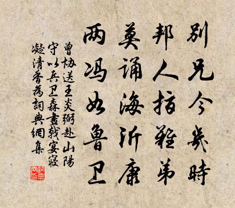 詩詞名句歷史字典書法欣賞書法字典國語詞典說文解字康熙字典古漢語字典標 題 作 者 詩 句 送王炎弼赴山陽守以兵衛森畫戟宴寢凝清香為作者:曾協 朝代:宋代原文別兄今幾時,邦人指難弟。莫誦海沂康,兩馮如魯衛。詩詞問答問:《送王炎弼赴山陽守以兵衛森畫戟宴寢凝清香為》的作者是誰?答:曾協問:該詩寫於哪個朝代?答:宋代書法欣賞送王炎弼赴山陽守以兵衛森畫戟宴寢凝清香為書法作品詩文賞析【原題】:送王炎弼赴山陽守以兵衛森畫戟宴寢凝清香為韻十首詩詞推薦贈衛八處士杜甫〔唐代〕人生不相見,動如參與商。今夕復何夕,共此燈燭光。少壯能幾時,鬢髮各已蒼。訪舊半為鬼,驚呼熱中腸。焉知戲題巫山縣用杜子美韻黃庭堅〔宋代〕巴俗深留客,吳儂但憶歸。直知難共語,不是故相違。東縣聞銅臭,江陵換祫衣。丁寧巫峽雨,慎莫暗朝暉。鐵錫范成大〔宋代〕八環流韻寶枝鳴,古鐵無花紫翠明。莫遣閒人容易振,泉飛石落鬼寰驚。重遊天竺連文鳳〔宋代〕何年飛去竺 * ,下際滄海蟠蛟龍。崛奇詭怪獻萬狀,八國播盪吹不融。千年老藤無根樹,長疑上有仙人住。山空詠史八首鮑宣妻蒲壽宬〔宋代〕幡然棄舊習,布裙牽鹿車。拜姑禮雲畢,提甕汲自如。富貴此一時,何可忘厥初。枯骨頌黃庭堅〔宋代〕清揚巧笑傾人城,驕氣矜色增我慢。無始時來生死趣,八萬苦業所依止。皮膚落盡露拴索,一切虛誑法現前。不見頌古十一首釋有權〔宋代〕我腳何似驢腳,踏著趙州略彴。驚得迦葉皺眉,文殊卻打無著。春日田園雜興東湖散人〔宋代〕物色天成畫不如,東風又到野人廬。蜜蜂辛苦供常課,科斗從橫學古書。小雨杏花村間酒,澹煙楊柳巷巾車。汀洲贈毛仙翁崔郾〔唐代〕存亡去住一壺中,兄事安期弟葛洪。甲子已過千歲鶴,儀容方稱十年童。心靈暗合行人數,藥力潛均造化功。終待浣溪沙(妙高墨梅)惠洪〔宋代〕日暮江空船自流。誰家院落近滄洲。一枝閒暇出牆頭。數朵幽香和月暗,十分歸意為春留。風撩片片是閒愁。論俗詩四首何耕〔宋代〕他侵我界是無良,我與他爭未是長。布施與他三尺地,休夸誰弱又誰強。蝶戀花管鑒〔宋代〕既出院,方見所賦,以“玉山高並兩峰寒”為韻,尚余並字,因為足之樓倚雲屏江瀉鏡。尊俎風流,地與人俱勝。獨坐有懷杜伯高陸游〔宋代〕畫橋通小市,深院欲黃昏。愛月先移燭,留香每閉門。李侯有佳句,樂令善清言。老病貪搘枕,何由共一樽?懷舒州山水呈昌叔王安石〔宋代〕山下飛鳴黃栗留,溪邊飲啄白符鳩。不知此地從君處,亦有他人繼我不。塵土生涯休蕩滌,風波時事只飄浮。相看宮詞楊皇后〔宋代〕泛索坤寧日一羊,自從正位控辭章。好生躬儉超千古,風化宮嬪只淡妝。白蓮花顧逢〔宋代〕種向東林得,此花真箇希。芳心能自潔,玉體靜相依。每訝鷗將浴,猶疑鷺不飛。月明無處認,香氣襲人衣。書林十景詩謝枋得〔宋代〕長虹跨陸登雲衢,會同海宇皆車書。日斜市潰夜喧息,月來雲靜天無疵。水劫金蟇形不術,常生玉兔藥常搗。可憐縣圃酴醾陳造〔宋代〕北園紅紫已蜚塵,始放幽亭爛熳春。疊翠影低珠幰重,洗妝人倦玉容真。薔薇清露疑分派,茉莉評香且外臣。領略讀史八首陳普〔宋代〕王莽當年似姬旦,煬皇前日肖曾參。擔囊揭篋何須逐,盜賊誰無仁義心。夜雨不少住枕上作晁說之〔宋代〕幾年飄泊敢何求,甘作傖公對楚囚。風轉榮光新輦道,雨無時節舊揚州。陸公奏議同誰恨,屈子離騷亦獨愁。歲暮名句推薦臣子恨,何時滅!駕長車,踏破賀蘭山缺。岳飛《滿江紅·寫懷》 男兒少為客,不辨是他鄉。李流芳《黃河夜泊》 路上有飢人,家中有剩飯。佚名《增廣賢文·上集》 梅花雪,梨花月,總相思。張惠言《相見歡·年年負卻花期》 雲開汶水孤帆遠,路繞樑山匹馬遲。高適《東平別前衛縣李寀少府 / 送前衛縣李宷少府》 春山碧樹秋重綠,人在武陵溪。劉基《眼兒媚·秋思》 鵬北海,鳳朝陽。辛棄疾《鷓鴣天·送廓之秋試》 秋到邊城角聲哀,烽火照高台。陸游《秋波媚·七月十六日晚登高興亭望長安南山》 短籬殘菊一枝黃。正是亂山深處、過重陽。呂本中《南歌子·驛路侵斜月》 箴者,針也,所以攻疾防患,喻針石也。劉勰《文心雕龍·銘箴》
