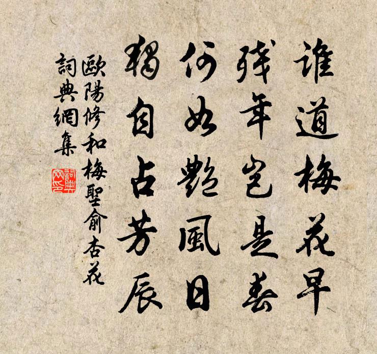 詩詞名句歷史字典書法欣賞書法字典國語詞典說文解字康熙字典古漢語字典標 題 作 者 詩 句 和梅聖俞杏花作者:歐陽修 朝代:宋代和梅聖俞杏花原文誰道梅花早,殘年豈是春。何如艷風日,獨自占芳辰。詩詞問答問:和梅聖俞杏花的作者是誰?答:歐陽修問:和梅聖俞杏花寫於哪個朝代?答:宋代問:歐陽修的名句有哪些?答:歐陽修名句大全歐陽修和梅聖俞杏花書法欣賞和梅聖俞杏花書法作品詩詞推薦別綦毋潛王維〔唐代〕端笏明光宮(一作殿)。歷稔朝雲陛。詔刊延閣書。高議平津邸。適意偶輕人(一作輕微祿)。虛心(一作遇人)西郊三首劉應時〔宋代〕紫槿綠籬愁意深,斜最墟落動秋砧。筆端有口江湖遠,莫寫乾時老子心。北亭李群玉〔唐代〕斜雨飛絲織曉空,疏簾半卷野亭風。荷花向盡秋光晚,零落殘紅綠沼中。八聲甘州(陪筠翁小酌橫山閣)張元乾〔宋代〕倚凌空飛觀,展營丘臥軸恍移時。漸微雲點綴,參橫斗轉,野闊天垂。草樹縈迴島嶼,杳靄數峰低。共此一尊月,宿楚國寺有懷趙嘏〔唐代〕風動衰荷寂寞香,斷煙殘月共蒼蒼。寒生晚寺波搖壁,紅墮疏林葉滿床。起雁似驚南浦棹,陰雲欲護北樓霜。江邊偈六十三首釋道寧〔宋代〕應機不妙,展事難諧。檢點將來,弄巧成拙。句石延年〔宋代〕後庭蘭蕙寒無色,虛閣圖書夕有塵。覽鏡沈佺期〔唐代〕霏霏日搖蕙,騷騷風灑蓮。時芳固相奪,俗態豈恆堅。恍忽夜川里,蹉跎朝鏡前。紅顏與壯志,太息此流年。八月七日被命上會稽沿途所歷拙於省記為韻語魏了翁〔宋代〕篾帆松艇趁潮生,隔岸平疇喚得譍。上到渡頭失歡喜,泥行十里是西興。用王司理韻送別二首洪咨夔〔宋代〕亨衢方四十,滿謂乃翁如。為底澼洸藥,依然城旦書。光塵風物裹,訊息事情初。束起東西玉,功名富貴余。靜坐偶成舒岳祥〔宋代〕日午風休樹不嘩,蝕殘香篆伴南華。忽聞霜鳥如春鳥,閒想蘆花作柳花。林文節紹聖日記後帖贊岳珂〔宋代〕進築之法,古兵法所未有,而始於本朝。予意其欲毀齒而兒不知,所以為是漸取而漸搖。曾不虞乎兵分力疲,反足春夜溫故六言二十首劉克莊〔宋代〕燕山張皇薄伐,艮岳文飾太平。黼賀克復受賞,瓘憂分裂有萌。和道祖韻葛立方〔宋代〕未落天狼未止戈,誰能頻擊唾壺歌。弈棋聊欲消憂耳,飲酒無如作病何。孫紹那憂卿太少,退之莫嘆日無多。菟裘包家山董嗣杲〔宋代〕綺霞蒸日透林梢,一族南山尚姓包。冷水峪邊苔色老,沖雲樓下樹陰高。園鄰古道傳耕籍,台倚青城想拜郊。欲趁峽中行雍陶〔唐代〕兩崖開盡水迴環,一葉才通石罅間。楚客莫言山勢險,世人心更險于山。塹荷池水楊萬里〔宋代〕雨中來看塹池塘,自與畦丁細校量。更放水痕高几許,浮荷猶剩若干長。至東林謁回仙人像李洪〔宋代〕罨畫溪山杳靄中,為尋遺事訪禪宮。回嵓故跡依然在,渭水非熊恍似空。綠薜侵衣餘手澤,遺榴輝壁想仙風。溪邊題廬山晁補之〔宋代〕南康南麓江州北,五百僧房綴蜜脾。儘是廬山佳絕處,不知何處合題詩。久泊餘杭關外水涸不能行晚雨甚快解舟有日矣鄭獬〔宋代〕初看紅芰小開頭,今見青房結子稠。深謝晚雲憐滯客,故飛涼雨送歸舟。名句推薦獨倚危欄,神遊無際,天地猶嫌隘。朱栴《念奴嬌·雪霽夜月中登樓望賀蘭山作》 秋風起兮木葉飛,吳江水兮鱸正肥。張翰《思吳江歌》 馬嘶芳草遠,高摟簾半掩。顧敻《醉公子·岸柳垂金線》 漢家天馬出蒲梢,苜蓿榴花遍近郊。李商隱《茂陵》 玄都觀里桃千樹,花落水空流。元好問《人月圓·玄都觀里桃千樹》 粉色全無飢色加,豈知人世有榮華。杜荀鶴《蠶婦》 念歸林葉換,愁坐露華生。張九齡《西江夜行》 庭花蒙蒙水泠泠,小兒啼索樹上鶯。貫休《春晚書山家屋壁二首》 荷芰風輕簾幕香,繡衣鸂鶒泳回塘,小屏閒掩舊瀟湘。顧敻《浣溪沙·荷芰風輕簾幕香》 心以啟智,智以啟財,財以啟眾,眾以啟賢,賢之有啟,以王天下。姜子牙《六韜·武韜·三疑》