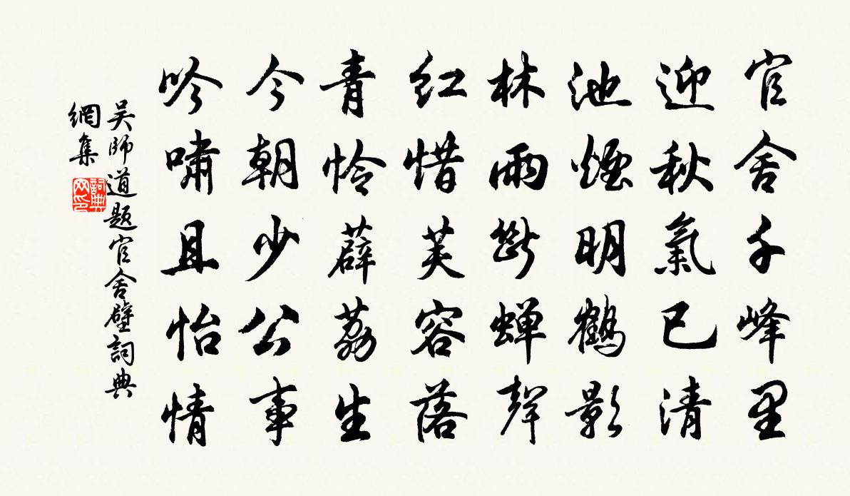 詩詞名句歷史字典書法欣賞書法字典國語詞典說文解字康熙字典古漢語字典標 題 作 者 詩 句 題官舍壁作者:吳師道 朝代:元代題官舍壁原文官舍千峰里,迎秋氣已清。池煙明鶴影,林雨斷蟬聲。紅惜芙容落,青憐薜荔生。今朝少公事,吟嘯且怡情。詩詞問答問:題官舍壁的作者是誰?答:吳師道問:題官舍壁寫於哪個朝代?答:元代問:題官舍壁是什麼體裁?答:五律吳師道題官舍壁書法欣賞題官舍壁書法作品注釋元詩別裁集詩詞推薦品令辛棄疾〔宋代〕迢迢征路。又小舸、金陵去。西風黃葉,淡煙衰草,平沙將暮。回首高城,一步遠如一步。江邊朱戶。忍追憶、分鷓鴣天朱敦儒〔宋代〕通處靈犀一點真。忺隨紫橐步紅茵,箇中自是神仙住,花作簾櫳玉作人。偏澹靜,最尖新。等閒舞雪振歌塵。若教送別惟肖贊府孫應時〔宋代〕如椽老筆健文章,枉對槐間雁鶩行。只共低頭了官事,忽驚舉手勸離觴。百年可落塵埃夢,一瓣曾薰知見香。珍重大淵寄道冠漢鏡各答以一首劉克莊〔宋代〕已掛朝冠了,煩君寄道冠。頭蓬不梳久,發禿欲簪難。簡便烏巾贅,清羸鶴氅寬。兒童怪崖異,便作羽流看。雁足酹江月姬翼〔元代〕夢中駭鹿,戲浮生得失、悲歡離合。見解分明猶是夢,轉轉昏沉難覺。雞口人情,羊腸世路,各自爭頭角。揮鞭舉忍淚吟/採桑子賀鑄〔宋代〕十年一覺揚州夢,雨散雲沈。隔水登臨。揚子灣西夕照深。當時玉管朱弦句,忍淚重吟。辦取沾襟。餖飣西風□□程公辟留客開元飲方惟深〔宋代〕畫錦新坊路稍西,興來攜客就僧扉。樽前倒玉清無比,筆下鏗金妙欲飛。藍輿直須乘月去,榜歌時聽采菱歸。流傳宋中別周、梁、李三子高適〔唐代〕曾是不得意,適來兼別離。如何一尊酒,翻作滿堂悲。周子負高價,梁生多逸詞。周旋梁宋間,感激建安時。白雪秋夕有感二首呈督視參政岳珂〔宋代〕湯湯南紀重喉衿,縱敵來年患已深。七十萬家財與力,六千里地古猶今。薇屯正自憂無給,桑土當思徹未陰。用力和酬秘閣錢少卿夜直見寄次韻楊億〔宋代〕甘瓜朱李郢醪濃,素綆銀床蔭碧桐。賜第舊連丹鳳闕,直廬今在未央宮。承雲仙掌延年露。轉蕙薰弦解慍風。此夕臨江仙 中書右丞王公行台揚州,公於平陽鄉謝醉庵〔元代〕行,歌以送之二首淮海東南佳麗地,古今畫品詩題。羨君去意拂晴霓。腰錢期跨鶴,舞劍豈聞雞。自笑病來成老懶簡同年刁時中俊卿五邁〔宋代〕讀君老宵詩,一讀三太息。君方未第時,憂民真懇側。直筆誅縣官,言言虹貫日。縣官怒共訕,移文加誚斥。君笑同李雪林飲山村周弼〔宋代〕本來無飲興,偶此到溪灘。屋角懸雙瓠,船頭系一竿。塔高風便響,橋峻雨隨乾。莫怕城門閉,行歸亦不難。無題唐寅〔明代〕便縱拼爭反下游,隨波逐浪詎慚愁。庸夫碌碌惟虛滅,烈士昂昂豈罷休。說法雙關如此樂,聽詩萬首向何憂。孤芳昌甫前詩見簡方和去未達間再於岩叟處見後詩陳文蔚〔宋代〕章泉相去每相思,多謝交情不見遺。繾綣方賡前日句,聯翩又讀後來詩。梅方迎臘多投好,菊已凌霜不入時。大抵句高似孫〔宋代〕折得花相伴,消渠酒拍浮。送張逸人二首夏竦〔宋代〕上公詩筆千金重,逋客歸裝一棹輕。莫向青山更招隱,且留賢哲濟蒼生。和楊侍郎初至郴州紀事書情題郡齋八韻劉禹錫〔唐代〕旌節下朝台,分圭從北回。城頭鶴立處,驛樹鳳棲來。舊路芳塵在,新恩馹騎催。里閭風偃草,鼓舞抃成雷。吏散寄黃雲心胡仲弓〔宋代〕竹屋少隊跡,閉門春晝長。天時半晴濕,人意共炎涼。苔蘚侵階綠,荼醾壓架香。冥搜尋杖履,不為看花忙。戲效屏山書齋十詠劉克莊〔宋代〕有時一畫起,有時三絕編。朱絲弦側畔,玉界尺傍邊。名句推薦林斷山明竹隱牆。亂蟬衰草小池塘。蘇軾《鷓鴣天·林斷山明竹隱牆》 千形萬象竟還空,映水藏山片復重。來鵠《雲》 臘盡愁難盡,春歸人未歸。馮夢龍《喻世明言·卷一》 苟不至德,至道不凝焉。子思《中庸·第二十七章》 欲為聖明除弊事,肯將衰朽惜殘年。韓愈《左遷至藍關示侄孫湘》 飛花兩岸照船紅,百里榆堤半日風。陳與義《襄邑道中》 窗間梅熟落蒂,牆下筍成出林。范成大《喜晴》 狗吠深巷中,雞鳴桑樹顛。陶淵明《歸園田居·其一》 家貧出孝子,國亂顯忠臣!佚名《增廣賢文·下集》 假作真時真亦假,無為有處有還無。曹雪芹《紅樓夢·第一回》