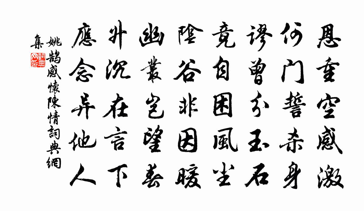 詩詞名句歷史字典書法欣賞書法字典國語詞典說文解字康熙字典古漢語字典標 題 作 者 詩 句 感懷陳情作者:姚鵠 朝代:唐代感懷陳情原文恩重空感激,何門誓殺身。謬曾分玉石,竟自困風塵。陰谷非因暖,幽叢豈望春。升沉在言下,應念異他人。詩詞問答問:感懷陳情的作者是誰?答:姚鵠問:感懷陳情寫於哪個朝代?答:唐代問:感懷陳情是什麼體裁?答:五律姚鵠感懷陳情書法欣賞感懷陳情書法作品注釋全唐詩:卷553-12詩詞推薦九日復口洪咨夔〔宋代〕涼邊未放菊花斑,莫作重陽節物看。就網買魚風露重,推篷舉酒水天寬。箭頭歲月離弦易,局面功名下著難。慚愧卷雪樓岳珂〔宋代〕地靈境勝宅神遊,第一江山卷雪樓。勢擁萬峰淮甸接,氣吞七澤楚天浮。魚龍灂沸雲生檻,鷗鷺波閒月上鉤。畫棟漢書引逸詩先秦無名〔先秦〕四牡翼翼。以征不服。親省邊陲。用事所極。九變復貫。知言之選。將軍王安節第四十七文天祥〔宋代〕激烈傷雄才,直氣橫乾坤。惆悵汗血駒,見此忠孝門。鶯鳴十章寄戚伯瑞彭龜年〔宋代〕有鳴其禽,其鳴維何。有懷其人,我心靡他。寄嚴文炳陳造〔宋代〕故人千里遠,論心未遐棄。不謂江淮隔,尺書雁能寄。春風生展掩,滿慰別後意。陳義凜涼霜,不獨相思字。喜遷鶯(春感)易祓〔宋代〕帝城春晝。見杏臉桃腮,胭脂微透。一霎兒晴,一霎兒雨,正是催花時候。淡煙細柳如畫,雅稱踏青攜手。怎知道青氈帳二十韻白居易〔唐代〕合聚千羊毳,施張百子弮。[司馬遷書云:張空弮。]骨盤邊柳健,色染塞藍鮮。北制因戎創,南移逐虜遷。汰風暮春偶成四首廖行之〔宋代〕春色堂堂去,雲容故故陰。情連芳草遠,愁共碧波深。一雨能多久,鳴鳩只合瘖。杖頭方寂寞,那得濁醪斟。戀情深毛文錫〔唐代〕滴滴銅壺寒漏咽,醉紅樓月。宴余香殿會鴛衾,盪春心。真珠簾下曉光侵,鶯語隔瓊林。寶帳欲開慵起,戀情深。綺羅香陳著〔宋代〕霽曉樓台,斜陽渡口,涼腋新聲初到。占斷清陰,隨意自成宮調。看取次、顫引薰風,想無奈、露餐清飽。有時如風雨中過龍洞閣陸游〔宋代〕飄然醉袖怒人扶,個裡何曾有畏塗。捲地黑風吹慘澹,半天朱閣插虛無。闌邊歸鶴如爭捷,雲表飛仙定可呼。莫怪南歌子秦觀〔宋代〕靄靄凝春態,溶溶媚曉光。何期容易下巫陽。祗恐使君前世、是襄王。暫為清歌駐,還因暮雨忙。瞥然歸去斷人腸贈通禪客釋法薰〔宋代〕龍墀問法動天顏,天贈黃金一萬錢。打得衲僧公驗正,通禪依舊是通禪。桃源憶故人 丹陽屢傳教誨寄答丘處機〔元代〕虛空照耀明如鏡。好弱頭頭皆應。隨逐狀同形影。稍錯還提正。佗人讒報渾虛佞。遠道狂言無證。切告後來休聽。機禪人發心丐田釋正覺〔宋代〕歷歷機梭看轉旋,衲僧手眼有千千。將知白雪上方飯,出自黃雲負郭田。溉灌流金溪口月,耕犁卷幕隴頭煙。和泥憶秦娥仇遠〔宋代〕秋乍覺。露涼頓覺羅衾薄。羅衾薄。黃昏庭院,水風簾幕。闌乾待月花時約。愁長夢短渾忘卻。渾忘卻。南山猿鶴小雨陸游〔宋代〕百穀畏秋陽,常恐膏澤吝。大哉天公仁,霢霂來有信。苹汀水未長,藥隴土先潤。新涼生葛衣,老憊亦小振。水運行王建〔唐代〕西江運船立紅幟,萬棹千帆繞江水。去年六月無稻苗,已說水鄉人餓死。縣官部船日算程,暴風惡雨亦不停。在生任安道生日項安世〔宋代〕九分才是一分春,從此看春更七旬。行世功名初髮腳,出門富貴即隨身。棋逢要路方高著,馬得亨沖定軼塵。伏櫪名句推薦四海無閒田,農夫猶餓死。李紳《古風二首 / 憫農二首》 泰山嵯峨夏雲在,疑是白波漲東海。李白《早秋單父南樓酬竇公衡》 天秋木葉下,月冷莎雞悲。李白《秋思》 未覺池塘春草夢,階前梧葉已秋聲。朱熹《偶成》 年少辭家從冠軍,金鞍寶劍去邀勛。王涯《塞下曲二首·其二》 滿街楊柳綠絲煙,畫出清明二月天。韋莊《丙辰年鄜州遇寒食城外醉吟五首》 樓上黃昏欲望休,玉梯橫絕月中鉤李商隱《代贈二首》 西園何限相思樹,辛苦梅花候海棠。元好問《鷓鴣天·候館燈昏雨送涼》 權,然後知輕重;度,然後知長短。孟子《孟子·梁惠王章句上·第八節》 一半黃梅雜雨晴,虛嵐浮翠帶湖明,閒雲高鳥共身輕。鄭文焯《浣溪沙·從石樓石壁往來鄧尉山中》