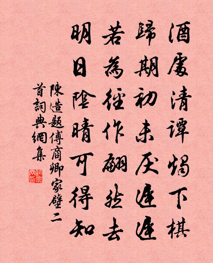 詩詞名句歷史字典書法欣賞書法字典國語詞典說文解字康熙字典古漢語字典標 題 作 者 詩 句 題傅商卿家壁二首作者:陳造 朝代:宋代題傅商卿家壁二首原文酒處清譚燭下棋,歸期初未厭遲遲。若為徑作翩然去,明日陰晴可得知。詩詞問答問:題傅商卿家壁二首的作者是誰?答:陳造問:題傅商卿家壁二首寫於哪個朝代?答:宋代陳造題傅商卿家壁二首書法欣賞題傅商卿家壁二首書法作品詩詞推薦禪人並化主寫真求贊釋正覺〔宋代〕髮際點白,眼眶含青。情枯歷歷,智照靈靈。形骸如槁木,蹤跡肖流萍。月明四海犀通暈,春在百華蜂採馨。次韻楊信仲見貽郊居二首郭印〔宋代〕平生不喜入州閭,林下江邊謾卜居。解榻延賓同笑語,杜門教子讀詩書。最憐舍後蔬盈圃,只欠庭前水繞除。官路賀葉樞密得孫姜特立〔宋代〕鸞鳳難為種,尋常羽族繁。共期公入相,又見子生孫。衣缽傳親手,箕裘付後昆。韋平今遠矣,袞袞屬高門。恭進明堂大禮慶成詩馬廷鸞〔宋代〕鉅典崇邦祀,精禋展國陽。泰元神授筴,癸亥日宣光。藝祖郊天始,高皇受命長。後庚基再造,先甲迓殊祥。率育再次韻答陳居仁二首陳造〔宋代〕丁年也辦刺天蜚,幾夢西垣與北扉。未簉時英書汗簡,已煩溪友寄當歸。桑榆境界寧辭冷,芹藻杯盤可得肥。說似夢李白誦竹枝詞三疊黃庭堅〔宋代〕竹竿坡面蛇倒退,摩圍山腰胡孫愁。杜鵑無血可續淚,何日金雞赦九州。雪仇遠〔宋代〕忽驚小窗白,開戶雪如此。去年臘前無,一白從此始。霏霏甚可愛,落落勢未已。炯炯眼界明,沾沾田畯喜。靜聞江行嚴羽〔宋代〕暝色蒹葭外,蒼茫旅眺情。殘雪和雁斷,新月帶潮生。天到水中盡,舟隨樹杪行。離家今幾宿,厭聽棹歌聲。久不領衡州舅氏書以長句問動靜趙蕃〔宋代〕寥闊書題久不聞,可憐魚雁動成群。未傳春興衡陽紙,長憶江東日暮雲。見說風帆京口泊,又雲山色敬亭分。莫言詠史三司馬光〔宋代〕不事王侯者,修然鄭子真。開田谷口美,荷鍤白渠春。德化移鄉曲,聲光動縉紳。一時鐘鼎貴,磨滅彼何人。感遇二十五首張耒〔宋代〕腹心主包藏,爪齒以自衛。折衝須豪英, * 用君子。遐哉三五朝,此道無不備。晏嬰才愧管,齊景不霸世。商子示長安君王安石〔宋代〕少年離別意非輕,老去相逢亦愴情。草草杯盤供笑語,昏昏燈火話平生。自憐湖海三年隔,又作塵沙萬里行。欲問山水畫唐寅〔明代〕樹合泉頭圍綠陰,屋橫澗上結黃茅。日長來此消閒興,一局楸棋對手敲。頌古二十一首釋鼎需〔宋代〕{左鹹右鳥}{左鹹右鳥}鳥,守空池。魚從腳底過,{左鹹右鳥}{左鹹右鳥}總不知。賀新郎(代壽東屏)佚名〔宋代〕綠長階蓂九。近黃鐘、薰晴愛日,漸添宮繡。乾鵲檐頭聲聲喜,催與東屏祝壽。怪一點、星明南斗。玉燕當年儲瑞六朝門三廢帝周曇〔唐代〕明莊節閔並罹殃,命在朱高二悖王。已嘆一年三易換,更嗟毆辱下東廊。題太平興國宮張漢彥〔宋代〕神仙所居真福地,帝遣仙官下人世。開元聖主夢潛通,九天使者何靈異。絳節霓旌射紫霄,風吹仙袂還飄飄。群官鳳棲梧(送子廉侄南下)程垓〔宋代〕九月重湖寒意早。目斷黃雲,冉冉連衰草。慘別臨江愁滿抱。酒尊時事都相惱。聞道吳天訊息好。鴛鴦西池,咫尺大慧禪師贊釋智遇〔宋代〕前無釋迦,後無達磨。罵雨罵風,祗要做大。黑漆竹篦胡打亂打,是佛是魔劈面便唾,因芘天陳其咎。衡陽梅陽,千葉梅楊公遠〔宋代〕千葉梅開一樣清,向人含笑似多情。化工只么寧多巧,碎剪瓊瑤細簇成。名句推薦佇聽寒聲,雲深無雁影。周邦彥《關河令·秋陰時晴漸向暝》 佳游不可得,春風惜遠別。李白《登梅岡望金陵贈族侄高座寺僧中孚》 錦里開芳宴,蘭缸艷早年。盧照鄰《十五夜觀燈》 治國者,必以奉法為重。羅貫中《三國演義·第九十六回》 眾生必死,死必歸土:此之謂鬼。戴聖《禮記·祭義》 雲橫秦嶺家何在?雪擁藍關馬不前。韓愈《左遷至藍關示侄孫湘》 人煙寒橘柚,秋色老梧桐。李白《秋登宣城謝朓北樓》 故人應念,杜鵑枝上殘月。文天祥《酹江月·和友驛中言別》 無稽之言,不見之行,不聞之謀,君子慎之。荀子《荀子·正名》 登泰山而小天下。孟子《孟子·盡心章句上·第二十四節》
