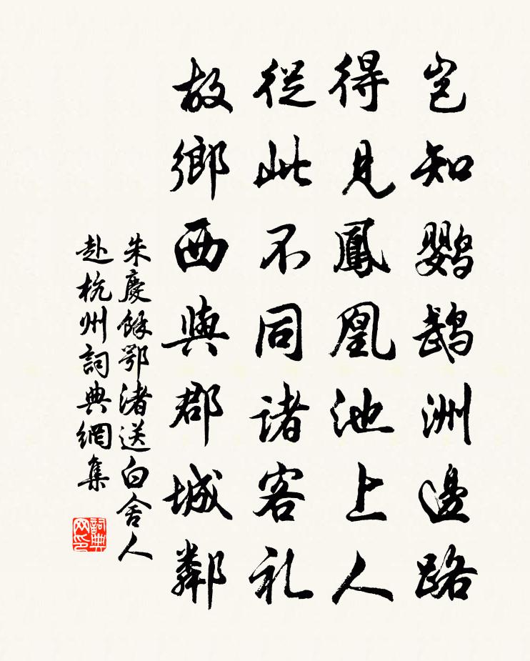 詩詞名句歷史字典書法欣賞書法字典國語詞典說文解字康熙字典古漢語字典標 題 作 者 詩 句 鄂渚送白舍人赴杭州作者:朱慶餘 朝代:唐代鄂渚送白舍人赴杭州原文豈知鸚鵡洲邊路,得見鳳凰池上人。從此不同諸客禮,故鄉西與郡城鄰。詩詞問答問:鄂渚送白舍人赴杭州的作者是誰?答:朱慶餘問:鄂渚送白舍人赴杭州寫於哪個朝代?答:唐代朱慶餘鄂渚送白舍人赴杭州書法欣賞鄂渚送白舍人赴杭州書法作品注釋全唐詩:卷514-60詩詞推薦和周顯先韻二首辛棄疾〔宋代〕暖日晴風晚蝶忙,平林先著夜來霜。寒花畢竟亡聊甚,野菜畦邊慘澹黃。午夜登嶓山范成大〔宋代〕癉暑嚴夜裝,乘涼躡危嶠。猿依黑林號,鬼閃青炬嘯。驚鳥動危葉,吟蟲滿荒草。泉聲遠相隨,山色近如杳。夢猶重九對酌曾豐〔宋代〕豫章高處是龍沙,前歲曾陪醉孟嘉。短白幸余頭上發,柔黃今載廣南花。出遊陸游〔宋代〕來往人間不計年,一枝筇竹雪垂肩。掃除身外閒名利,師友書中古聖賢。支遁山前饒石水,葛洪井畔慘風煙。小痴題象山縣棲霞觀應真亭簡住持張弱士宋伯仁〔宋代〕萬玉叢中屋四檐,柳花時候笑掀髯。誰將海上山千點,紀作人間畫一縑。藥灶未寒丹可煉,春風猶力酒宜添。透瓶送秦仲防通判樓鑰〔宋代〕題輿再到海東涯,嗜學深於入幕時。一字未通終不置,五行俱下尚嫌遲。情親端有卜鄰意,別後空勞望月思。老我封州鄭剛中〔宋代〕莫道封州是小州,封州雖小客何愁。荔枝受暑色方好,茉莉背風香更幽。得醉便眠尋夢蝶,俗行還立看沙鷗。向非喜表公往楚王城齊己〔唐代〕已聞人舍地,結構舊基平。一面湖光白,鄰家竹影清。應難尋輦道,空說是王城。誰信興亡跡,今來有磬聲。句張釜〔宋代〕新詩滿眼費平章。百字令/念奴嬌東岡〔宋代〕排雲拓月,向天上移下,神仙華屋。畫棟飛檐千萬落,黼黼城南喬木。出谷鶯遷,趨庭燕爾,袍綰登科綠。嫦娥分雜歌謠辭。漁父歌和凝〔唐代〕白芷汀寒立鷺鷥,蘋風輕翦浪花時。煙冪冪,日遲遲,香引芙蓉惹釣絲。相和歌辭。長門怨二首李白〔唐代〕天回北斗掛西樓,金屋無人螢火流。月光欲到長門殿,別作深宮一段愁。桂殿長愁不記春,黃金四屋起秋塵。夜懸荊州新秋病起雜題一十五首病起見庭莎齊己〔唐代〕病起見庭莎,綠階傍竹多。繞行猶未得,靜聽復如何。蟋蟀幽中響,蟪蛄深處歌。不緣田地窄,剩種任婆娑。新刺襪徐夤〔唐代〕素手春溪罷浣紗,巧裁明月半彎斜。齊宮合贈東昏寵,好步黃金菡萏花。五仟觀二首古成之〔宋代〕撥破浮塵入紫煙,五羊壇上訪神仟。人間自覺無閒地,城裡誰知有洞天。竹葉影繁籠藥圃,桃花香煖映芝田。吟余過雍秀才居賈島〔唐代〕夏木鳥巢邊,終南嶺色鮮。就涼安坐石,煮茗汲鄰泉。鍾遠清霄半,蜩稀暑雨前。幽齋如葺罷,約我一來眠。頌古十九首釋法全〔宋代〕天高地厚尋常事,海闊山重更要論。霹靂震摧山鬼窟,獨攜霜劍定乾坤。重五同尹少稷觀江中競渡陸游〔宋代〕楚人遺俗閱千年,簫鼓喧呼斗畫船。風浪如山鮫鱷橫,何心此地更爭先。六州佚名〔宋代〕皇撫極,明德貫乾坤。信星列,卿雲爛,輝亘紫微垣。思報貺、明詔祠宮,練時搜曠典,紫畤觚壇,昭孝德、親御休日不出張耒〔宋代〕久厭衣冠塵土浸,賜休何苦馬駸駸。窮冬積雪春不雨,昨日殘紅今綠陰。卻掃不知門外事,安禪深得靜中心。讀書名句推薦聖人之治民也,先治者強,先戰者勝。韓非及後人《韓非子·心度》 我來一長嘆,知是東溪蓮。白居易《京兆府栽蓮》 予若洞庭葉,隨波送逐臣。李白《送郄昂謫巴中》 山光忽西落,池月漸東上。孟浩然《夏日南亭懷辛大》 疏影橫斜水清淺,暗香浮動月黃昏。林逋《山園小梅·其一》 唯願當歌對酒時,月光長照金樽里。李白《把酒問月·故人賈淳令予問之》 好事不出門,壞事傳千里。佚名《增廣賢文·上集》 牧童歸去橫牛背,短笛無腔信口吹。雷震《村晚》 子規啼,不如歸,道是春歸人未歸。關漢卿《大德歌·春》 寫不成書,只寄得、相思一點。張炎《解連環·孤雁》