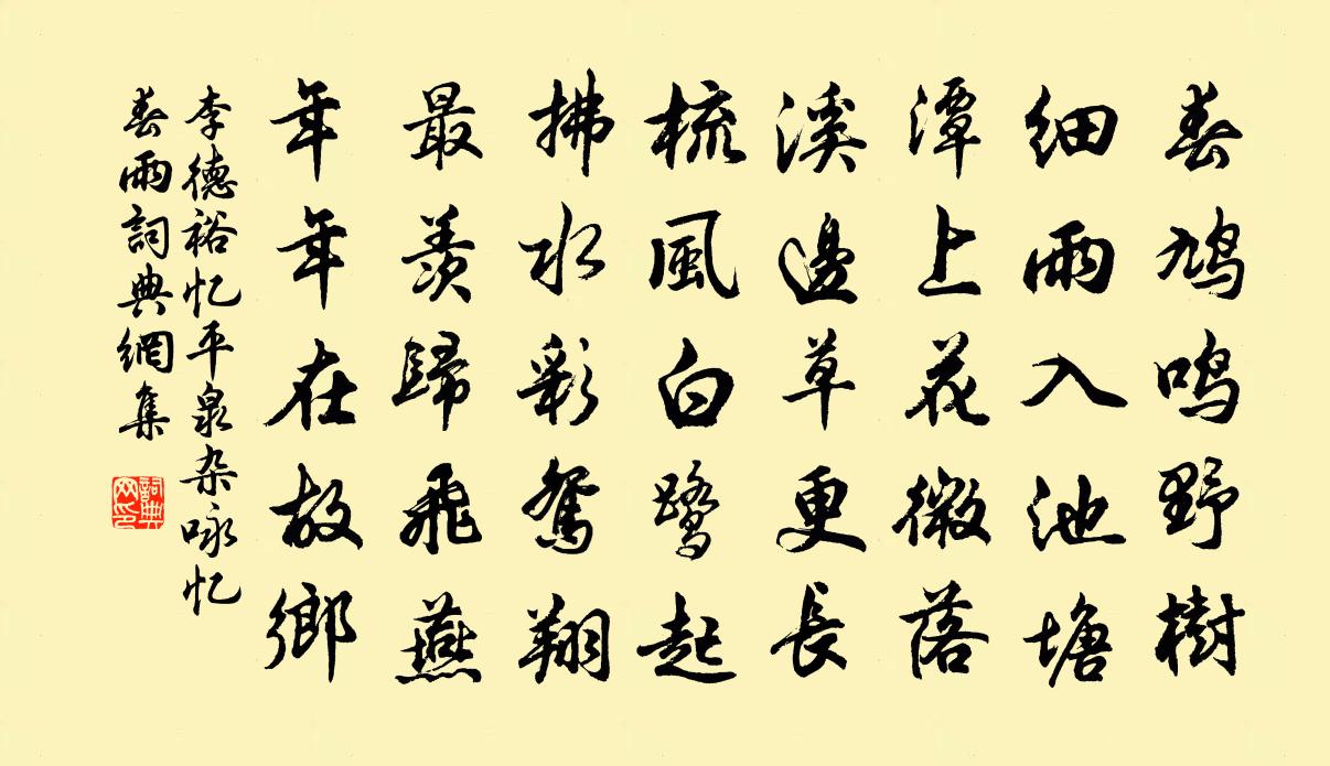 詩詞名句歷史字典書法欣賞書法字典國語詞典說文解字康熙字典古漢語字典標 題 作 者 詩 句 憶平泉雜詠憶春雨作者:李德裕 朝代:唐代憶平泉雜詠憶春雨原文春鳩鳴野樹,細雨入池塘。潭上花微落,溪邊草更長。梳風白鷺起,拂水彩鴛翔。最羨歸飛燕,年年在故鄉。詩詞問答問:憶平泉雜詠憶春雨的作者是誰?答:李德裕問:憶平泉雜詠憶春雨寫於哪個朝代?答:唐代李德裕憶平泉雜詠憶春雨書法欣賞憶平泉雜詠憶春雨書法作品注釋全唐詩:卷475-122詩詞推薦宿應庵次季承韻趙蕃〔宋代〕只思借榻尋僧屋,不悟山行亦已深。異日重來應記路,斷塍窮處轉松林。黃正言為邑宰累罷郡送行姜特立〔宋代〕人生皆有別,此別良不同。不作兒女戀,慘然見顏容。郭奕追叔子,後山逐蘇公。二賢間世士,二客有古風。不畏贈鄔文伯曾豐〔宋代〕詩與時投未救飢,君詩況復不投時。紛紛噲等揶揄甚,堇堇顏徒從臾之。雅頌國風歸雋永,簞瓢陋巷付讎夷。更充次水簾洞韻白玉蟾〔宋代〕天上真珠真下垂,更無鉤箔惹塵埃。青鸞白鶴從教入,紫詔黃封不用來。夜月只為蘇鄺照,晚風端與葛黃開。縱饒木蘭花歐陽炯〔唐代〕兒家夫婿心容易,身又不來書不寄。閒庭獨立鳥關關,爭忍拋奴深院裡。悶向綠紗窗下睡,睡又不成愁已至。今年飲仙閣華岳〔宋代〕槽頭壓盡春山綠,槽下真珠瀉醽醁。騷人一笑傾蓋盤,滿面春風漲紅玉。少陵得此不欲言,乃指八子為中仙。主人夜坐一齋偶成錢時〔宋代〕出態炎涼反覆易,交情貴賤死生殊。雙眸炯炯碧天闊,霽月光風夜讀書。寄韓卷院南澗常伯之子姜特立〔宋代〕每思南澗一悽然,不見風騷二十年。子厚猶能記先友,審言且喜有家傳。蜩螗聲亂無遺響,山水人亡有絕弦。海內讀戚公恕進卷張耒〔宋代〕世方尚纖柔,子獨不可揉。人皆喜呶呶,子語不出口。巉然即之高,俗子競嘲詬。我嘗要之難,快使暴其有。乃知有感葛立方〔宋代〕將軍塞上夸三箭,學士堂中記八磚。正眼觀來都是幻,月明群蟻在花氈。乳爵蘇泂〔宋代〕乳爵機心淺,逢人自不飛。闊疏羅網事,愛惜羽毛稀。一物知天理,他年任布衣。相忘容苟免,吾與汝無違。靈岩禪寺蔣允中〔宋代〕曉入靈岩寺,靈蹤一一穿。天聰鑿混沌,龍鼻滴潺湲。不雨山長濕,微風谷競喧。參旗開障日,鰲柱仰擎天。雁異讀子虛賦陳洎〔宋代〕聽辭深悵不同時,及到同時位大卑。爭似唐皇將頗牧,禁中言下用無疑。漁家傲歐陽玄〔元代〕二月都城春動野。引龍灰向銀床畫。士女城西爭買架。看馳馬。官家引佛官蘭若。水暖天鵝紛欲下。鷹房奏獵催車水調歌頭孫銳〔宋代〕漁釣有遺逸,天子寵元真。賜之奴僕,得隨媯艷下神京。幾度苹汀蓼岸,不問金鉤無餌,談笑取冰鱗。珍重主人意將別巫峽,贈南卿兄瀼西果園四十畝杜甫〔唐代〕苔竹素所好,萍蓬無定居。遠遊長兒子,幾地別林廬。雜蕊紅相對,他時錦不如。具舟將出峽,巡圃念攜鋤。正月羅元通輓詩楊萬里〔宋代〕奏賦曾三比,興能競二南。如何雙桂子,枉著拜親衫?舊事余詩酒,何人續笑談?生前孝友在,代石為公鑱。季子廟石祖文〔宋代〕夫子南遊不到吳,殷勤題識寄嗟吁。干戈擾擾憐諸夏,季子流風過耳無。道傍水閣姚勉〔宋代〕一川澄不動,山色浸分明。噪晚鴉寒甚,窺魚鷺瘦生。人家江閣好,天下釣翁清。想此幽居者,何知有利名。題山中井泉薛嵎〔宋代〕井口依山缺,更無沙礫渾。相傳海眼出,久視石碑存。定案星辰位,不多穿鑿痕。旱年人盡汲,汲盡復源源。名句推薦孤村芳草遠,斜日杏花飛。寇準《江南春·波渺渺》 不愁屋漏床床濕,且喜溪流岸岸深曾幾《蘇秀道中》 劇辛樂毅感恩分,輸肝剖膽效英才。李白《行路難三首》 義膽包天,忠肝蓋地,四海無人識。施耐庵《念奴嬌·天南地北》 年年春日異鄉悲,杜曲黃鶯可得知。韋莊《江外思鄉》 綠葉素榮,紛其可喜兮。屈原《九章》 守身不敢妄為,恐貽羞於父母王永彬《圍爐夜話·第三四則》 綠陰青子老溪橋。羞見東鄰嬌小。吳文英《西江月·賦瑤圃青梅枝上晚花》 自古明王聖帝,猶須勤學,況凡庶乎!顏之推《顏氏家訓·勉學篇》 人語西風,瘦馬嘶殘月。王國維《蝶戀花·滿地霜華濃似雪》
