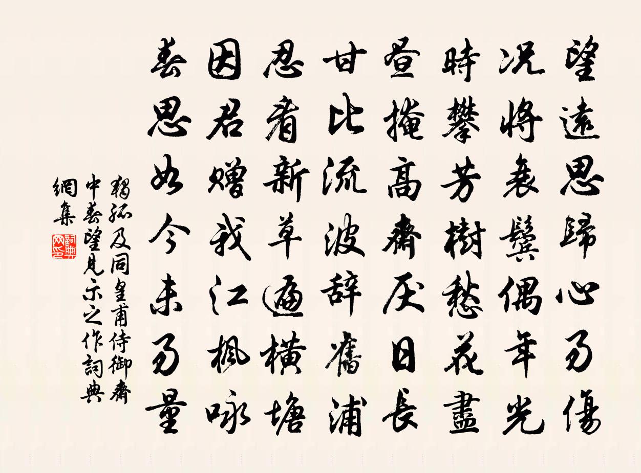 詩詞名句歷史字典書法欣賞書法字典國語詞典說文解字康熙字典古漢語字典標 題 作 者 詩 句 同皇甫侍御齋中春望見示之作作者:獨孤及 朝代:唐代原文望遠思歸心易傷,況將衰鬢偶年光。時攀芳樹愁花盡,晝掩高齋厭日長。甘比流波辭舊浦,忍看新草遍橫塘。因君贈我江楓詠,春思如今未易量。詩詞問答問:《同皇甫侍御齋中春望見示之作》的作者是誰?答:獨孤及問:該詩寫於哪個朝代?答:唐代問:該詩是什麼體裁?答:七律書法欣賞同皇甫侍御齋中春望見示之作書法作品注釋全唐詩:卷247_41詩詞推薦閔冢梅堯臣〔宋代〕盜發廣陵冢,及扉開石樞。中環走徹道,高闊可通車。五尺銅鑄人,執兵冠服朱。壁石刻位號,列侍幽宮隅。殿將送王子文宰昭武真德秀〔宋代〕百諫或繞指,粹白俄成緇。有初諒非難,其難在終之。道心眇絲粟,易為群物移。不有精一功,誰能勝惟危。子今句釋警玄〔宋代〕寶殿無人不侍立,不種梧桐免鳳來。聞歌二絕葛立方〔宋代〕月明如鏡酒如空,響谷清聲出漢宮。怪得中庭紅葉墮,琉璃帳底唱迴風。和蘇適春雪八首張耒〔宋代〕白帝陰兵嚴羽衛,漢皇老傅振鬚眉。撒鹽飛絮渾粗俗,盡撥塵言賦好詩。【雙調】壽陽曲 厭紛李愛山〔元代〕離京邑,出鳳城,山林中隱名埋姓。亂紛紛世事不欲聽,倒大來耳根清淨。 懷古項羽爭雄霸,劉邦起戰伐,白奪舊館韓偓〔唐代〕前歡往恨分明在,酒興詩情大半亡。還似牆西紫荊樹,殘花摘索映高塘。送曾蒼山姚勉〔宋代〕平生共飲西江水,今日相逢南浦雲。玉潔日光湖上宰,與君有舊是斯文。種柳宋自遜〔宋代〕短研深煨倒插宜,明年便有綠垂垂。只因因造化容易,不見歲寒冰雪時。湖州歌九十八首 其二十五汪元量〔宋代〕風雨聲中聽櫂歌,山炰野饌奈愁何。雪花淮白甜如蜜,不減江珧滋味多。真宗皇帝南牙謝訪狀贊岳珂〔宋代〕自虎闈之教廢,分絕堂陛。偉聖皇之訂禮,得古意於胄齒。南牙既啟,有煜朱邸。鏘鏘佩履,謁刺填委。不愛尺紙夜感自遣(一作失志夜坐思歸楚江,又作苦學吟)孟郊〔唐代〕夜學曉未休,苦吟神鬼愁。如何不自閒,心與身為讎。死辱片時痛,生辱長年羞。清桂無直枝,碧江思舊遊。再和十首劉克莊〔宋代〕君憶東湖不久歸,我思陳跡恍難追。殷勤為報鶯花說,止有詩情似舊時。題石潭觀音院用王樞密庶愚丘正宗韻二首趙蕃〔宋代〕所至滔滔不問津,故知此地往來頻。從今更識林間寺,再到不愁無主人。句高似孫〔宋代〕魚帶淞江月盈缶,雋處依稀開蟹斗。黃伯益官舍賞梅范成大〔宋代〕一杯何處洗愁顏,黃法曹家玉樹寒。翠袖捻香留客看,春風都在小闌乾。太傅杜相公有答兗州待制之句其卒章雲獨無風歐陽修〔宋代〕南都已見成新集,東魯休嗟未作詩。霖雨曾為天下福,甘棠何止郡人思。元劉事業時無取,姚宋篇章世不知。二美和顏長官百詠客路朱繼芳〔宋代〕送窮不去奈窮何,山有荊榛水有波。萬物得時人自老,梁鴻頭白五噫歌。許介之約過清溪道上有成戴復古〔宋代〕行盡白雲際,乘槎過水西。稻田秋後雀,茅舍午時雞。野飯自不惡,村醪亦可攜。聞鍾欲投宿,何處是招提。頌古釋道顏〔宋代〕大唐國內無禪師,禮拜歸堂更不疑。堪笑河陽新婦子,不如臨濟小廝兒。名句推薦別浦今朝暗,羅帷午夜愁李賀《七夕》 江上雪,獨立釣漁翁。李綱《望江南·江上雪》 江亭暇日堪高會,醉諷離騷不解愁邊貢《午日觀競渡》 天與短因緣,聚散常容易。晏幾道《生查子·狂花頃刻香》 帝王之道,以寬仁為大。令狐德棻《周書·本紀·卷四》 朔方正月雪澌澌,單于策馬至京西沈約《昭君辭》 驛路侵斜月,溪橋度曉霜。呂本中《南歌子·驛路侵斜月》 微風起,清芬醞藉,不減酴醿。李清照《多麗·詠白菊》 曉迎秋露一枝新,不占園中最上春。杜牧《紫薇花》 願君多採擷,此物最相思。王維《相思》