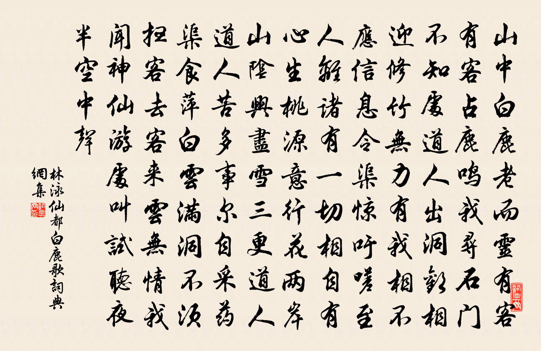 詩詞名句歷史字典書法欣賞書法字典國語詞典說文解字康熙字典古漢語字典標 題 作 者 詩 句 仙都白鹿歌作者:林泳 朝代:宋代仙都白鹿歌原文山中白鹿老而靈,有客有客占鹿鳴。我尋石門不知處,道人出洞歡相迎。修竹無力有我相,不應信息令渠驚。吁嗟至人離諸有,一切相自有心生。桃源意行花兩岸,山陰興盡雪三更。道人道人苦多事,爾自採藥渠食萍。白雲滿洞不須掃,客去客來雲無情。我聞神仙遊處叫,試聽夜半空中聲。詩詞問答問:仙都白鹿歌的作者是誰?答:林泳問:仙都白鹿歌寫於哪個朝代?答:宋代林泳仙都白鹿歌書法欣賞仙都白鹿歌書法作品詩詞推薦過徐稚山居顧禧〔宋代〕曲徑秋高竹影斜,多君此日淡浮華。笛聲遠落幽人淚,月色清宜孺子家。世事盡勞五斗米,我來常醉一園花。不須項羽廟李山甫〔唐代〕為虜為王盡偶然,有何羞見漢江船。停分天下猶嫌少,可要行人贈紙錢。示張直溫林之奇〔宋代〕築山必使高,鑿井必使深。百正戒淺近,盛德羞浮沉。焉有尺寸枝,能棲垂天禽。焉有升斗泉,能容橫江鱘。借茲瑞香潘牥〔宋代〕愛極愁風雨,移根入畫檐。色過袍樣紫,香帶蜜脾甜。密葉團團護,幽枝歲歲添。芬芳無著處,一月在書籤。清明日溫庭筠〔唐代〕清娥畫扇中,春樹鬱金紅。出犯繁花露,歸穿弱柳風。馬驕偏避幰,雞駭乍開籠。柘彈何人發,黃鸝隔故宮。好事近黃公度〔宋代〕湖上送殘春,已負別時歸約。好在故園桃李,為誰開誰落。還家應是荔支天,浮蟻要人酌。莫把舞裙歌扇,便等閒虎丘釋永頤〔宋代〕山色吳門少,行人愛此游。天高雲閣晚,石裂劍池秋。虎去空陵變,僧棲古塔幽。上方曾眺遠,落日駐扁舟。送崔度還吳 度故人禮部員外國輔之子李白〔唐代〕幽燕沙雪地,萬里盡黃雲。朝吹歸秋雁,南飛日幾群。中有孤鳳雛,哀鳴九天聞。我乃重此鳥,彩章五色分。胡為支提宏老請贊釋妙倫〔宋代〕搭一隻手,揮三尺鐵。天下衲僧,望風膽裂。豈料豐乾院裡撞著個匾頭魔孽,盡把家私俱漏洩。卻向玉融側童峰前河瀆神(女誡效花間體)辛棄疾〔宋代〕芳草綠萋萋。斷腸絕浦相思。山頭人望翠雲旗。蕙香佳酒君歸。惆悵畫檐雙燕舞。東風吹散靈雨。香火冷殘簫鼓。尋真夕對趙崇鉘〔宋代〕春雲弄月黃金絲,春山草木皆仙姿。松根對坐日西夕,群峰當前列青壁。鏗鏗虛壑含古音,靜聽宛是商山吟。洞石放鷺鷥齊己〔唐代〕潔白雖堪愛,腥膻不那何。到頭從所欲,還汝舊滄波。句諶祜〔宋代〕馬悲仙仗過,雁入海門斜。省慈明禪師還而作偈釋谷泉〔宋代〕相別而今又斗年,不知誰共對談禪。一般秀色湘山里,汝自匡徒我自眠。題畫蘭鄭起〔宋代〕向來俯首問羲皇,汝是何人到此鄉。未有畫前開鼻孔,滿天浮動古馨香。呻吟陸游〔宋代〕呻吟半歲掩柴扉,性命惟存氣力微。夙業豈能逃馬麥,窮居賴是慣牛衣。濁清且復分賢聖,今昨誰能論是非!一段聞庾七左降因詠所懷白居易〔唐代〕我病臥渭北,君老謫巴東。相悲一長嘆,薄命與君同。既嘆還自哂,哂嘆兩未終。後心誚前意,所見何迷濛。人生清平樂呂勝己〔宋代〕紅塵久住。仙馭凌波去。本似行雲無定處。那更臘殘風雨。瑤芳片片輕飛。但留青子欒枝。孤負歲寒幽意,如今卻迎春樂楊 * 〔宋代〕沈吟暗想狂蹤跡。親曾作、燕堂客。賞春風、共醉垂楊陌。雲鬢嚲、金釵側。對酒何曾辭大白。十年後、音塵俱息食化趙崇鉘〔宋代〕海食多詭心,豢食令人魯。山中食薺人,幽吟肺腸苦。名句推薦東籬把酒黃昏後,有暗香盈袖。李清照《醉花陰·薄霧濃雲愁永晝》 翻空白鳥時時見,照水紅蕖細細香。蘇軾《鷓鴣天·林斷山明竹隱牆》 聚散匆匆,雲邊孤雁,水上浮萍。劉過《柳梢青·送盧梅坡》 雖至親亦忍絕,縱為惡亦不讓。來俊臣《羅織經·事上卷第二》 秋送新鴻哀破國,晝行飢虎齧空林。鄭思肖《二礪》 落梅庭榭香,芳草池塘綠。晏幾道《生查子·落梅庭榭香》 張而不弛,文武弗能也;弛而不張,文武弗為也。一張一弛,文武之道也。戴聖《禮記·雜記下》 桃李風前多嫵媚,楊柳更溫柔。辛棄疾《武陵春·桃李風前多嫵媚》 君子無入而不自得焉。子思《中庸·第十四章》 東風漸綠西湖柳,雁已還、人未南歸。周密《高陽台·送陳君衡被召》