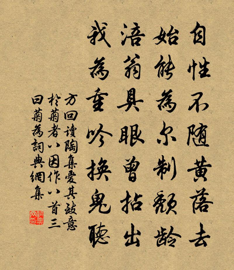 詩詞名句歷史字典書法欣賞書法字典國語詞典說文解字康熙字典古漢語字典標 題 作 者 詩 句 讀陶集愛其致意於菊者八因作八首三曰菊為作者:方回 朝代:宋代原文自性不隨黃落去,始能為爾制頹齡。涪翁具眼曾拈出,我為重吟換鬼聽。詩詞問答問:《讀陶集愛其致意於菊者八因作八首三曰菊為》的作者是誰?答:方回問:該詩寫於哪個朝代?答:宋代書法欣賞讀陶集愛其致意於菊者八因作八首三曰菊為書法作品詩文賞析【原題】:讀陶集愛其致意於菊者八因作八首·三曰菊為制頹齡詩詞推薦驀山溪劉處玄〔元代〕紅蓮池畔,不讓游山景。鬧里卻無心,身似藕出泥花靜。壺天妙趣,別有四時春,真應物,寶光明,今古誰人省。酬答張安撫伯玉先生薛師點〔宋代〕寡交率天性,積疴攻妙藥。乾祿念烝嘗,著書恣談謔。永矢離畏途,何況縻好爵。感子胡人意,屏吏延鈴閣。時剖鷺鷥二首齊己〔唐代〕日日滄江去,時時得意歸。自能終潔白,何處誤翻飛。晚立銀塘闊,秋棲玉露微。殘陽葦花畔,雙下釣魚磯。雪裡贈術士劉衡鑑方逢辰〔宋代〕高目下耳赫如鑒,福善禍淫平如衡。顏癯胡夭跖胡壽,秀氏乃富憲乃貧。伯道無兒湯有後,造物豈是鑒不明。孔明和本齋止酒牟巘五〔宋代〕白家老瓦慣從游,和氣如春不汝郵。近日更誰嫌外酒,夢成燥吻吸青丘。金錢花盧肇〔唐代〕輪郭休夸四字書,紅窠寫出對庭除。時時買得佳人笑,本色金錢卻不如。爇心香 詠鶴馬鈺〔元代〕雖處雞群,如鳳**。自丁令、化現如斯。霜毛朱頂,玉羽瓊肌。唼太湖萍,潭鼻粟,唳雲霓。朝戲芝田,夕飲瑤和甲辱秋夜讀書有感韻孫應時〔宋代〕物結相尋來,世事不足嘆。侯早知春秋,宿鳥各昏旦。百年相勞苦,且復加餐飯。堂堂白日在,擾擾浮雲散。詩書次韻王得之游淨明題易安二絕張嵲〔宋代〕銅駝陌上須臾樂,金穴侯家瞬息歡。爭似蓋頭茅一把,老僧終日百般安。招真詞康與之〔宋代〕白鶴巢兮丹井空,蓬山杳兮煙霞蒙。陵谷變兮今古,木葉下兮秋風。飛仙去兮朝太微,黃冠野服兮以游以嬉。餐霞彭州歌汪元量〔宋代〕彭州昔號小成都,城市繁華錦不如。尚有遺儒頭雪白,見人猶自問詩書。彭州又曰牡丹鄉,花月人稱小雒陽。自笑空師欲游岳往訪山寺趙汝鐩〔宋代〕聞師游岳去,打急訪高岑。躡屐若來晚,挑包不可尋。山寒梅意悄,林茂鳥聲深。行住無非道,何須枉古囊。別友釋文珦〔宋代〕十年蹤跡與君同,今日魂銷執手中。自是交深難話別,不關秋雨又秋風。季弟黃岩任滿大人挈家眾先要作詩見示恭和元孫應符〔宋代〕心處中虛治五官,特來能應固非難。移忠益本居家孝,閱暑知曾歷歲寒。父子賡歌真內樂,弟兄分職賴居安。何妨念奴嬌(梅)趙長卿〔宋代〕水邊籬落獨橫枝,冉冉風煙岑寂。踏雪尋芳村路永,竹屋西頭遙識。蕙草香銷,小桃紅未,醉眼驚春色。離愁何處酬張繼皇甫冉〔唐代〕悵望南徐登北固,迢遙西塞恨東關。落日臨川問音信,寒潮唯帶夕陽還。初秋感事三首劉克莊〔宋代〕遍閱同參入涅槃,傍觀盡怪老僧頑。有詩傳世天機淺,無史藏山筆鉞閒。夢境瞿莊更喚醒,醉鄉陶阮夾扶還。吾廬望霽陸游〔宋代〕夜雨勿厭空階聲,天公欲作明朝晴。明朝甲子最畏雨,榜舟入市聞古語。今年雨陽俱及時,麥已入倉雲四垂。雨來示張直溫林之奇〔宋代〕築山必使高,鑿井必使深。百正戒淺近,盛德羞浮沉。焉有尺寸枝,能棲垂天禽。焉有升斗泉,能容橫江鱘。借茲短歌行釋文珦〔宋代〕憶蜍游中林,鳥鳴蘭蕙芳。重來豈雲久,草木倏已黃。乙鳥始辭去,群鴻復南翔。天道有代謝,人生安得常。促促名句推薦此曲有意無人傳,願隨春風寄燕然,憶君迢迢隔青天。李白《長相思三首·其二》 大凡朋友須箴規指摘處少,誘掖獎勸意多,方是。王陽明《傳習錄·卷下·門人陳九川錄》 喜無以賞,怒無以殺管仲《管子·版法》 隰桑有阿,其葉有幽。佚名《隰桑》 五更疏欲斷,一樹碧無情。李商隱《蟬》 眇眇孤舟逝,綿綿歸思紆。陶淵明《始作鎮軍參軍經曲阿作》 千虛不如一實。馮夢龍《警世通言·卷三》 山中無甲子,寒盡不知年。吳承恩《西遊記·第一回》 不信樓頭楊柳月,玉人歌舞未曾歸。謝枋得《蠶婦吟》 故人應念,杜鵑枝上殘月。文天祥《酹江月·和友驛中言別》