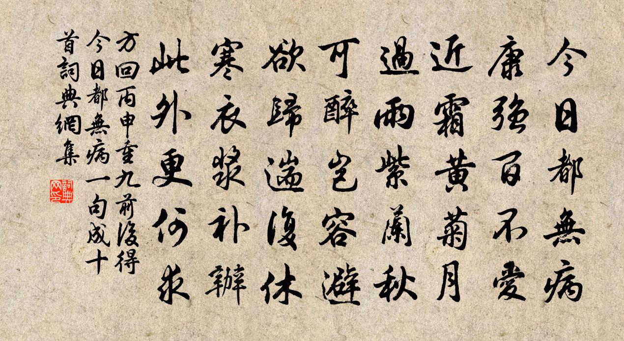 詩詞名句歷史字典書法欣賞書法字典國語詞典說文解字康熙字典古漢語字典標 題 作 者 詩 句 丙申重九前後得今日都無病一句成十首作者:方回 朝代:宋代原文今日都無病,康強百不愛。近霜黃1/1菊月,過雨紫蘭秋。可醉豈容避,欲歸遄復休。寒衣漿補辦,此外更何求。詩詞問答問:《丙申重九前後得今日都無病一句成十首》的作者是誰?答:方回問:該詩寫於哪個朝代?答:宋代書法欣賞丙申重九前後得今日都無病一句成十首書法作品詩詞推薦戛銅碗為龍吟歌皎然〔唐代〕逸僧戛碗為龍吟,世上未曾聞此音。一從太尉房公賞,遂使秦人傳至今。初戛徐徐聲漸顯,樂音不管何人辨。似出冬日放言二十一首張耒〔宋代〕淵明非無心,似以酒忘憂。如以藥愈疾,未佳寧免憂。我直好飲耳,與世本悠悠。人間有何事,奚足煩杯甌。題汪水雲詩卷開先長老〔宋代〕水流雲散海天涯,與子長游亦可嘉。歸馬跡漫燕嶠雪,啼鵑血染楚城花。乾坤浩蕩空雙眼,南北迢遙事一家。三疊臨江仙蘇軾〔宋代〕細馬遠馱雙侍女,青巾玉帶紅靴。溪山好處便為家。誰知巴峽路,卻見洛城花。面旋落英飛玉蕊,人間春日初斜。和趙南塘離支五絕劉克莊〔宋代〕卻貢無因送上天,漫山如錦但堪憐。羅浮所產真奴隸,只為曾逢玉局仙。內外吟邵雍〔宋代〕衣冠不整,謂之外惰。行義不修,謂之內惰。內外俱惰,何人不唾。淮西池濠石銘佚名〔唐代〕井底一竿竹,竹色深綠綠。雞未肥,酒未熟,障車兒郎且須縮。次韻答張迪功坐上見貽張將赴南都任二首陳與義〔宋代〕千首能輕萬戶侯,誦君佳句解人憂。夢闌塵里功名晚,笑罷尊前歲月流。世事無窮悲客子,梅花欲動憶吾州。明朝閒中鄭剛中〔宋代〕須知造物有恩深,遺我閒中見物心。掠水高低鷗自在,過花先後燕相尋。門前父老忽聞語,種罷今年常值陰。秋熟哭同舍崔員外韋莊〔唐代〕卻到同游地,三年一電光。池塘春草在,風燭故人亡。祭罷泉聲急,齋余磬韻長。碧天應有恨,斜日吊松篁。送路遵謁孔宣公石介〔宋代〕薄田五頃餘,才足共王租。慈母八十四,發白牙齒疏。服非帛不湲,半冬地褲褥。食非肉不飽,杯案惟一蔬。南陔梅林分韻得舊字杜謹言〔宋代〕去城十里南郊外,突兀老梅餘十輩。玉雪為骨冰為魂,氣象不與凡木對。我來窮冬煙雨晦,把酒從公對公酹。人言水精王建〔唐代〕映水色不別,向月光還度。傾在荷葉中,有時看是露。奉使益州至長安發鍾陽驛盧照鄰〔唐代〕躋險方未夷,乘春聊騁望。落花赴丹谷,奔流下青嶂。葳蕤曉樹滋,滉漾春江漲。平川看釣侶,狹徑聞樵唱。蝶戲自訟王安石〔宋代〕孔子見南子,子路為不怡。欲從公山氏,勃鬱見色辭。道如天之蒼,萬物不能緇。弟子尚不信,況余乏才資。明知先天易吟三十首方回〔宋代〕高下乾坤位,東西日月門。正身當午立,一點認心源。次韻閻甥伯溫池上八首晁補之〔宋代〕黃冠一奇士,教我漱華池。茅檐夕堅坐,見月柳間低。水蟲時一出,細浪作鱗差。流觀起百慮,內視失群疑。菖蒲澗陳岩〔宋代〕膜外浮雲不較多,只將無事養天和。生來懶覓仙人藥,九節菖蒲奈我何。再和久旱望雨韻李彌遜〔宋代〕高田黃欲枯,下田青欲變。三更轤轆聲,挈水急於電。污池魚不游,坎井蛙自見。助苗更辭勞,人力詎能偏。那憂寄西弟六首劉黻〔宋代〕向上工夫肯憚難,須知簣上可為山。若還志力無迴轉,直透龍門亦等閒。名句推薦女蘿發馨香,菟絲斷人腸。李白《古意》 讓利精於取利,逃名巧於邀名。陳繼儒《小窗幽記·集靈篇》 村喜禾花實,峰看嶺岫重。趙汝愚《雨後送李將軍還祠偕同寅飲一杯亭》 碧海年年,試問取、冰輪為誰圓缺?納蘭性德《琵琶仙·中秋》 夢回芳草思依依,天遠雁聲稀。李煜《喜遷鶯·曉月墜》 荷笠帶斜陽,青山獨歸遠。劉長卿《送靈澈上人》 富貴必從勤苦得,男兒須讀五車書。杜甫《柏學士茅屋》 畫圖恰似歸家夢,千里河山寸許長。辛棄疾《鷓鴣天·送元濟之歸豫章》 禍在於好利;害在於親小人尉繚《尉繚子·十二陵》 花開不並百花叢,獨立疏籬趣未窮。鄭思肖《畫菊》