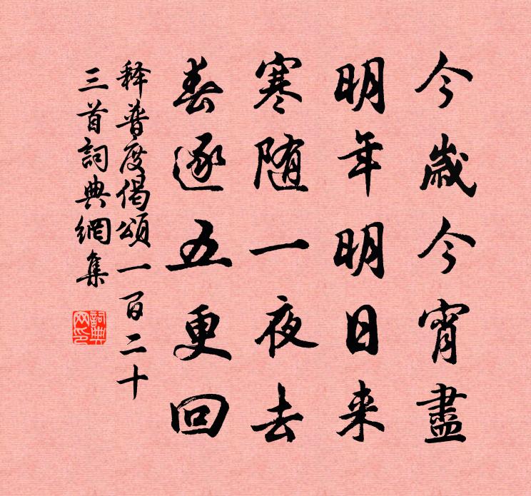 詩詞名句歷史字典書法欣賞書法字典國語詞典說文解字康熙字典古漢語字典標 題 作 者 詩 句 偈頌一百二十三首作者:釋普度 朝代:宋代偈頌一百二十三首原文今歲今宵盡,明年明日來。寒隨一夜去,春逐五更回。詩詞問答問:偈頌一百二十三首的作者是誰?答:釋普度問:偈頌一百二十三首寫於哪個朝代?答:宋代釋普度偈頌一百二十三首書法欣賞偈頌一百二十三首書法作品詩詞推薦題吳參議達觀齋袁燮〔宋代〕朱公胸次清絕塵,吳公當日心相親。風流蘊藉接前輩,寥寥斯世能幾人。達觀名齋深有意,欲把前修相警厲。只今答陳莆田投贈二首劉克莊〔宋代〕恬退已邀鷗入社,畸孤羞使鴆為媒。聞新令尹彈琴治,有遠方人負耒來。雷邑地偏難舞袖,坳堂水淺易膠杯。一枝柳枝辭十二首徐鉉〔唐代〕陌上朱門柳映花,簾鉤半卷綠陰斜。憑郎暫駐青聰馬,此是錢塘小小家。水墨松石方乾〔唐代〕三世精能舉世無,筆端狼藉見功夫。添來勢逸陰崖黑,潑處痕輕灌木枯。垂地寒雲吞大漠,過江春雨入全吳。蘭堂寒食雨三首仇遠〔宋代〕監官州牧趣修圍,里正喧呼急報飢。店舍無煙雞犬靜,山村桃李已空枝。千秋歲(生日)周紫芝〔宋代〕小春時候。晴日吳山秀。霜尚淺,梅先透。波翻醽醁盞,霧暖芙蓉繡。持壽酒。仙娥特地回雙袖。試問春多少。恩答梅聖俞大雨見寄歐陽修〔宋代〕夕雲若頹山,夜雨如洪渠。俄然見青天,焰焰升蟾蜍。◇忽陰氣生,四面如吹噓。狂雷走昏黑,驚電照夔魖。搜尋草堂寺詩陳堯咨〔宋代〕□□□跡□禪關,□殿清虛檜影間。客□□臨來此境,僧□興廢指前山。醉聞溪溜吟懷□,坐對嵐峰世慮閒。他日呈曾蒲澗提刑黃庚〔宋代〕詩自茶山後,如公世所稀。特來參活字,應肯授玄機。寒澗孤松老,秋雲獨鶴飛。台山千萬丈。望望未能歸。題李尊師松樹障子歌杜甫〔唐代〕老夫清晨梳白頭,玄都道士來相訪。握髮呼兒延入戶,手提新畫青松障。障子松林靜杳冥,憑軒忽若無丹青。陰崖范泉州輓詞二首韓元吉〔宋代〕淡墨標名早,飛騰僅石渠。學傳外家蘊,論合古人余。議本楓宸疏,評和相第書。忠言與危行,青史未應虛。湖上寓居雜詠 其七姜夔〔宋代〕布衣何用揖王公,歸向蘆根濯軟紅。自覺此心無一事,小魚跳出綠萍中。頌古五十七首釋道昌〔宋代〕舌頭不出口,三三成九九。算到香台還,彼此落人後。金陵汪元量〔宋代〕只見空城不見台,客行搔首重徘徊。風雲舊日龍南渡,宇宙新秋雁北來。三國衣冠同草莽,六朝宮殿總塵埃。交遊贈曾士倬用許廣文韻李昴英〔宋代〕里閈如君苦績文,幾年良玉困炎昆。鶚書快甚催隨計,鶴髮忻然慰倚門。袍綠光華應分有,汗青久遠要名存。江頭越王感應大士贊釋大觀〔宋代〕海山嶄絕,海濤舂撞。海風披拂,海雲飄揚。仰慧日之破暗兮誰其迷照,觀普門之不鑰兮去不至方。感應道交,叵偈頌一百零二首釋慧遠〔宋代〕電卷星馳作者知,倒施逆用猛提撕。霜華寶劍當風按,忿怒那咤斫額窺。琴王昌齡〔唐代〕孤桐秘虛鳴,樸素傳幽真。仿佛弦指外,遂見初古人。意遠風雪苦,時來江山春。高宴未終曲,誰能辨經綸。偈頌一百三十六首釋惟一〔宋代〕今朝結制,制如何結。內不放出,外不放入。壁立千仞,千仞壁立。【商調】望遠行_紫燕金鶯弄佚名〔元代〕紫燕金鶯弄也喉舌,我這裡妝點得。西園內紅英兒翠重疊。梅香你與我掩上門兒著,瘦龐兒不耐春風烈。霎時間花名句推薦迢迢牽牛星,皎皎河漢女。佚名《迢迢牽牛星》 寒泉貯、紺壺漸暖,年事對、青燈驚換了。吳文英《花犯·謝黃復庵除夜寄古梅枝》 明月樓高休獨倚。酒入愁腸,化作相思淚。范仲淹《蘇幕遮·懷舊》 吾以為古之善者則述之,今之善者則作之,欲善之益多也。墨子《墨子·46章 耕柱》 春風試手先梅蕊,頩姿冷艷明沙水。趙令畤《菩薩蠻·春風試手先梅蕊》 只有天在上,更無山與齊寇準《詠華山》 雁盡書難寄,愁多夢不成。沈如筠《閨怨二首·其一》 雁過也,正傷心,卻是舊時相識。李清照《聲聲慢·尋尋覓覓》 留連光景惜朱顏,黃昏獨倚闌。李煜《阮郎歸·呈鄭王十二弟》 鎖離愁,連綿無際,來時陌上初熏。韓縝《鳳簫吟·鎖離愁》