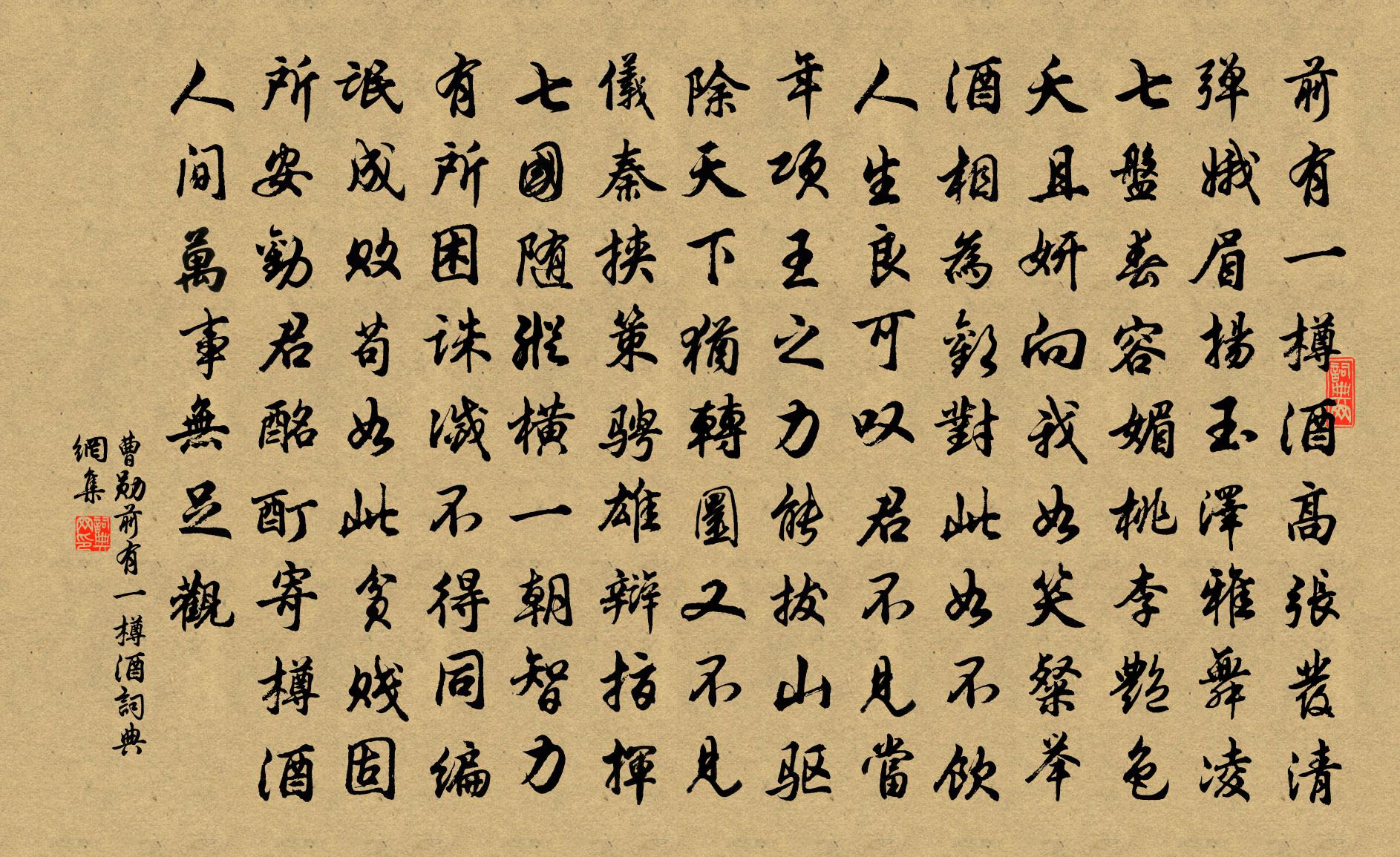 詩詞名句歷史字典書法欣賞書法字典國語詞典說文解字康熙字典古漢語字典標 題 作 者 詩 句 前有一樽酒作者:曹勛 朝代:宋代前有一樽酒原文前有一樽酒,高張發清彈。娥眉揚玉澤,雅舞凌七盤。春容媚桃李,艷色夭且妍。向我如笑粲,舉酒相為歡。對此如不飲,人生良可嘆。君不見當年項王之力能拔山,驅除天下猶轉圜。又不見儀秦挾策騁雄辯,指揮七國隨縱橫。一朝智力有所困,誅滅不得同編氓。成敗苟如此,貧賤固所安。勸君酩酊寄樽酒,人間萬事無足觀。詩詞問答問:前有一樽酒的作者是誰?答:曹勛問:前有一樽酒寫於哪個朝代?答:宋代曹勛前有一樽酒書法欣賞前有一樽酒書法作品詩詞推薦哭東萊呂先生孫應時〔宋代〕文獻承家大,規模與世公。典刑身任重,權度我時中。六合清游氣,諸儒輔翼功。生賢竟何意,霜雹隕春風。春墅崔道融〔唐代〕蛙聲近過社,農事忽已忙。鄰婦餉田歸,不見百花芳。奉和襲美吳中言懷寄南海二同年陸龜蒙〔唐代〕曾見凌風上赤霄,盡將華藻赴嘉招。城連虎踞山圖麗,路入龍編海舶遙。江客漁歌沖白荇,野禽人語映紅蕉。庭中新年五首蘇軾〔宋代〕曉雨暗人日,春愁連上元。水生挑菜渚,煙濕落梅村。小市人歸盡,孤舟鶴踏翻。猶堪慰寂寞,漁火亂黃昏。北渚轉調鬥鵪鶉王哲〔元代〕一個靈明,作仙子材。響徹瑤宮,*金自開。為忒玲瓏出蓬萊。降下來。謫在凡間,托生俗胎。只恐身便,灑色氣虞美人王哲〔元代〕四郎須是安爐灶。莫把身心鬧。玲瓏便是本來真。氣精養住,便得好精神。汞鉛得得知顛倒。方見無名道。今宵飲虞美人何〔宋代〕分香帕子揉藍膩。欲去殷勤惠。重來直待牡丹時。只恐花知、知後故開遲。別來看盡閒桃李。日日闌乾倚。催花無六么令晏幾道〔宋代〕日高春睡,喚起懶裝束。年年落花時候,慣得嬌眠足。學唱宮梅便好,更暖銀笙逐。黛蛾低綠。堪教人恨,卻似江十二月二日夜夢與客並馬行黃河上息於古驛陸游〔宋代〕並轡徐驅百里中,雲開太華翠摩空。是間合有神靈在,七十餘年墮犬戎。一字至七字詩竹韋式〔唐代〕竹。臨池,似玉。裛露靜,和煙綠。抱節寧改,貞心自束。渭曲偏種多,王家看不足。仙杖正驚龍化,美實當隨鳳秋興吳龍起〔宋代〕定是憑高易得愁,客懷牢落怕登樓。不知昨夜梧桐雨,添得闌乾幾許秋。己卯十月一日至燕越五日罹狴犴有感而賦文天祥〔宋代〕久矣忘榮辱,今茲一死生。理明心自裕,神定氣還清。欲了男兒事,幾無妻子情。出門天宇闊,一笑暮雲橫。塔銘釋如珙〔宋代〕病叟今年六十六,死日將至,火化好,土化好。西堂唯庵貫和尚云:古鄮山中有片荒地,因疊石為塔,為銘曰:天高士詠壺丘子吳筠〔唐代〕壺丘道為量,玄虛固難知。季鹹曜淺術,禦寇初深疑。至人忘禍福,感變靡定期。太沖杳無朕,元化誰能知。寄仲寶上人連文鳳〔宋代〕一笑簫韶曲未終,清風杖錫欲何從。不隨輕絮飄流水,且作間雲過別峰。昭慶寺前鴉繞樹,餘杭山下鶴歸松。人來闕下元夕令領寄大有張詠〔宋代〕月華瀟灑始徘徊,時起平津雅宴開。照座玉山皆俊彩,驚人綺句盡仙才。秋風未泛鴟夷楫,浮世皆登郢隗台。的被淳熙五年四月二日,直宿玉堂,懷舊二絕句范成大〔宋代〕桂海冰天老歲華,直廬重上玉皇家。當年曾識青青鬢,惟有東牆一架花。送高錄參美任姚勉〔宋代〕高安之民椎且質,空濛惡聲頭上筆。獨惟猾吏可怕人,架鷹騰霄柙虎出。貪官乞錢吏手中,庸官仰筆描吏容。獄情和曾谹父春半書懷王洋〔宋代〕今日前溪好,晴空事事明。草長顏色重,鳧暖去來輕。游女矜高髻,書生厭生檠。懸簞雖過午,碧澗煮芹羹。山水畫唐寅〔明代〕水色山光明几上,松陰竹影度窗前。焚香對坐渾無事,自與詩書結靜緣。名句推薦道吾好者是吾賊,道吾惡者是吾師。佚名《增廣賢文·上集》 梁園日暮亂飛鴉,極目蕭條三兩家。岑參《山房春事二首》 日光寒兮草短,月色苦兮霜白。李華《弔古戰場文》 弟妹蕭條各何在,干戈衰謝兩相催!杜甫《九日五首·其一》 雲山行處合,風雨興中秋。高適《送魏八》 今夫飛蓬遇飄風而行千里,乘風之勢也。商鞅《商君書·禁使》 井蛙不可以語于海者,拘於虛也;夏蟲不可以語於冰者,篤於時也莊子《莊子·外篇·秋水》 責人之心責己,恕己之心恕人。佚名《增廣賢文·上集》 月黑雁飛高,單于夜遁逃。盧綸《和張僕射塞下曲·其三》 斜風細雨不須歸。蘇軾《浣溪沙·漁父》