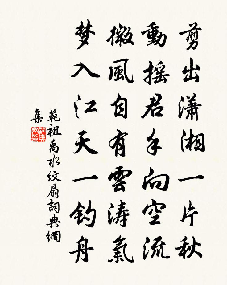詩詞名句歷史字典書法欣賞書法字典國語詞典說文解字康熙字典古漢語字典標 題 作 者 詩 句 水紋扇作者:范祖禹 朝代:宋代水紋扇原文剪出瀟湘一片秋,動搖君手向空流。微風自有雲濤氣,夢入江天一釣舟。詩詞問答問:水紋扇的作者是誰?答:范祖禹問:水紋扇寫於哪個朝代?答:宋代范祖禹水紋扇書法欣賞水紋扇書法作品詩詞推薦謁武肅王廟一絕呈汪帥卿錢時〔宋代〕干戈五紀亂如煙,吳越生成八十年。遺像塵昏碑露立,三間敗屋獨蕭然。東遊遠歸韋莊〔唐代〕扣角乾名計已疏,劍歌休恨食無魚。辭家柳絮三春半,臨路槐花七月初。江上欲尋漁父醉,日邊時得故人書。青雲閿鄉寓居十首釣竿吳融〔唐代〕曾拋釣渚入秦關,今卻持竿傍碧灘。認得舊溪兼舊意,恰如羊祜識金環。壬午二月桃方盛開雪積其上光輝紅潤不可形狀吳儆〔宋代〕夭桃先已 * ,青女猶爭造化功。應與騷人嫌太赤,故將鉛粉注深紅。贈何道人白玉蟾〔宋代〕冠褐滿天下,幾個能賢賢。忽來龍虎山,結這粥飯緣。方丈最高處,幽居今幾年。一雙岩電眼,識盡地行仙。甘露寺梅堯臣〔宋代〕曾非遠城郭,寂爾隔囂氛。尚有南朝樹,能留北固雲。川濤觀海若,霜磬入江濆。衛國丹青在,孤堂綠桂薰。偈頌六十八首釋法薰〔宋代〕秘魔老兒,擎個叉子,不肯放下。靈山這裹,淨躶躶,赤灑灑,沒可把。費文達除夔漕作此賀之三首李流謙〔宋代〕吉音一紙疾郵傳,白帝城頭勸著鞭。楚樹已沾新雨露,蜀江行換好風煙。政須急拯溝中瘠,不用多流地上錢。一節採桑子·畫船載酒西湖好歐陽修〔宋代〕畫船載酒西湖好,急管繁弦,玉盞催傳,穩泛平波任醉眠。行雲卻在行舟下,空水澄鮮,俯仰留連,疑是湖中別有雁山總題此山本朝方顯戴復古〔宋代〕此地古無聞,誰封萬石君。山林才整整,來往早紛紛。兩派龍湫水,千峰雁盪雲。東西十八寺,紀載欠碑文。漁家傲歐陽修〔宋代〕乞巧樓頭雲幔卷。浮花催洗嚴妝面。花上蛛絲尋得遍。顰笑淺。雙眸望月牽紅線。奕奕天河光不斷。有人正在長生鷓鴣劉延世〔宋代〕冥冥花朵隔遙山,掠水飛來立釣磯。靜處欲留看不足,翠光點破夕陽歸。別賦賞花一首楊億〔宋代〕仙山靈沼五城西,曉日花光照彩霓。露濯冰蠶鋪瑞錦,風吹水麝拆香臍。芳葩散採添蜂蜜,紅片狂飄雜燕泥。曾認和小圃趙希逢〔宋代〕淵明從日涉,董子不窺園。行樂從吾好,安恬亦性根。我今勤抱瓮,花發應開樽。安得恢餘地,群珍剩闡坤。偈傾一百六十九首釋智朋〔宋代〕是藥非藥,信手拈來。 * 活人,風生八極。任是文殊維摩,也少這一服不得。題青城山范賢觀唐求〔唐代〕數里緣山不厭難,為尋真訣問黃冠。苔鋪翠點仙橋滑,松織香梢古道寒。晝傍綠畦薅嫩玉,夜開紅灶撚新丹。鐘聲雨花台張湯〔宋代〕不譚仁義只譚空,一著參差在箇中。台上繽紛花正雨,城邊一陣已西風。君王自有君王業,何事區區翻貝葉。雨花山中崔大夫有書相問(一作崔大夫有書問余山中)秦系〔唐代〕客在煙霞里,閒閒逐狎鷗。終年常裸足,連日半蓬頭。帶月乘漁艇,迎寒綻鹿裘。已於人事少,多被掛冠留。素業太常寺觀舞聖壽樂徐元鼎〔唐代〕舞字傳新慶,人文邁舊章。沖融和氣洽,悠遠聖功長。盛德流無外,明時樂未央。日華增顧眄,風物助低昂。翥鳳次韻和玉汝對月見懷西軒梅堯臣〔宋代〕坐見沙頭月,復憐衣上輝。正如從我飲,還欲照君歸。相逐影徒是,共嗟歡已非。夜深依岸落,寒色入傷違。名句推薦孤煙村際起,歸雁天邊去。孟浩然《南歸阻雪》 亞夫營畔柳濛濛,隋主堤邊四路通。汪遵《楊柳》 煙塵犯雪嶺,鼓角動江城。杜甫《歲暮》 行路難,不在水,不在山,只在人情反覆間。白居易《太行路》 人老去西風白髮,蝶愁來明日黃花。張可久《折桂令·九日》 戰戰慄栗,日慎一日,苟慎其道,天下可有。韓非及後人《韓非子·初見秦》 澄江平少岸,幽樹晚多花。杜甫《水檻遣心二首》 世間最難得者兄弟。程登吉《幼學瓊林·卷二·兄弟》 相逢一醉是前緣,風雨散、飄然何處。蘇軾《鵲橋仙·七夕》 以小人尚民而威,以非所取於民而巧,是傷國之大災也。荀子《荀子·王霸》