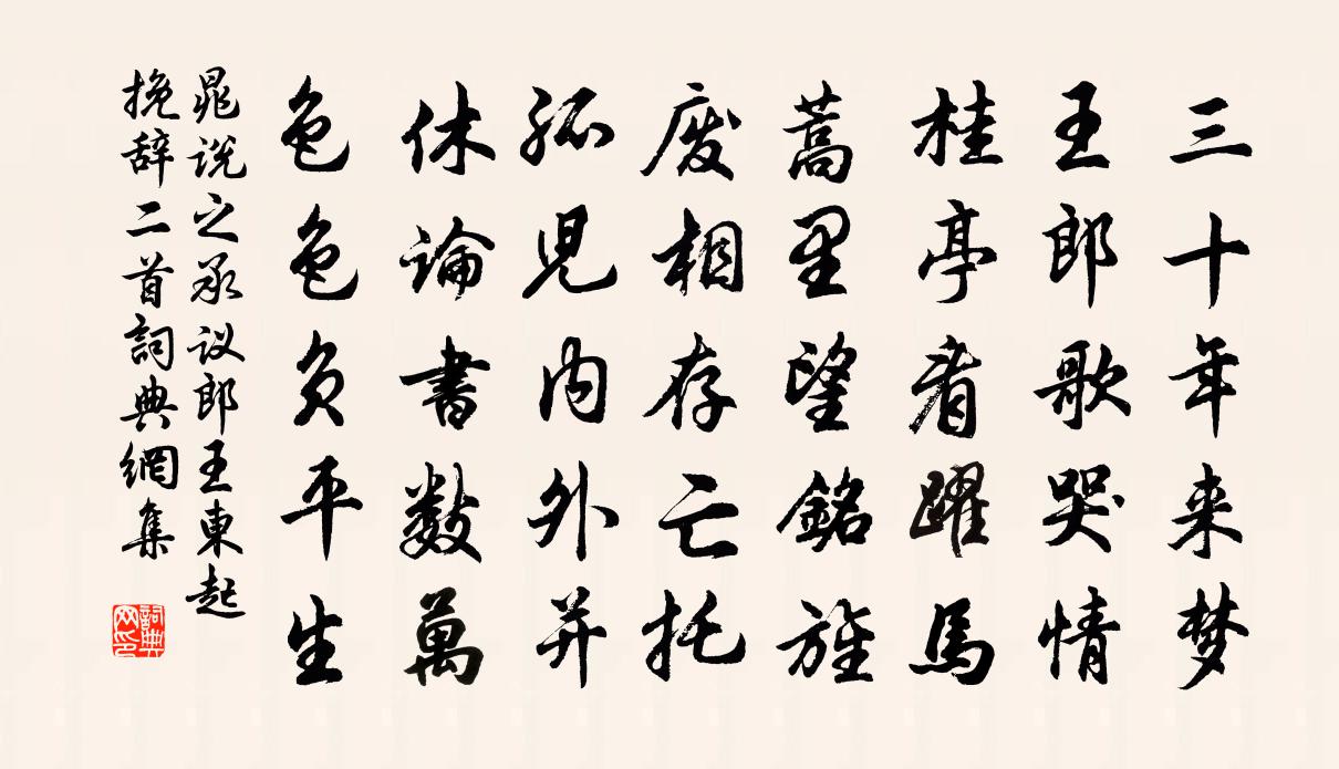 詩詞名句歷史字典書法欣賞書法字典國語詞典說文解字康熙字典古漢語字典標 題 作 者 詩 句 承議郎王東起輓辭二首作者:晁說之 朝代:宋代承議郎王東起輓辭二首原文三十年來夢,王郎歌哭情。桂亭看躍馬,蒿里望銘旌。廢相存亡托,孤兒內外並。休論書數萬,色色負平生。詩詞問答問:承議郎王東起輓辭二首的作者是誰?答:晁說之問:承議郎王東起輓辭二首寫於哪個朝代?答:宋代晁說之承議郎王東起輓辭二首書法欣賞承議郎王東起輓辭二首書法作品詩詞推薦仙岩行白玉蟾〔宋代〕醉攜七尺霜前行,雲錦山前灣幾曲。溪頭秋雨添寒綠,蛟龍冷浸一壺玉。蓼花錦岸紅欲流,稻田高下鋪棋局。碧岩還劉處士先令公功名錄陳洎〔宋代〕當年力戰盪妖氛,十萬雄師四七勛。將略妙欺班定遠,家聲高過李將軍。銘圖魏鼎文猶在,筆勒燕山蹟尚分。今日呈陳平仲華岳〔宋代〕達人安分樂平生,不與陰陽造化爭。漢節有人恭且止,楚盤無客遂當行。薦公地栗三杯酒,分我天香一味羹。大抵墨歌寄林明叔王邁〔宋代〕贈君古墨三寸許,君知此墨從來處。溧陽石化幾千年,鋼鐵臼經三萬杵。昔我得之於異人,使我拾襲藏為珍。我今大衍易吟四十首方回〔宋代〕小畜過無坎,胡為以雨雲。互觀藏兌澤,止水亦興雲。清和吟邵雍〔宋代〕清而不和,隘而多鄙。和而不清,慢而鮮禮。既和且清,義無定體。時行則行,時止則止。醇叟崇道之喪未得往哭聞窀穸有期輒賦二章以張栻〔宋代〕晚歲渾無事,端居只自如。冰霜澆塊磊,日月老蘧篨。山寺留題墨,晴窗罷卷書。從今行岳路,忍復過公廬。劉後溪和雁湖即事詩十絕見示次韻洪咨夔〔宋代〕金穀人家大謬悠,春江自理送窮舟。漁人拍手從旁笑,淡飯粗衣過即休。游武夷作棹歌呈晦翁十首辛棄疾〔宋代〕玉女峰前一櫂歌,煙鬟霧髻動清波。遊人去後楓林夜,月滿空山可奈何。赴蘇州至常州,答賈舍人白居易〔唐代〕杭城隔歲轉蘇台,還擁前時五馬回。厭見簿書先眼合,喜逢杯酒暫眉開。未酬恩寵年空去,欲立功名命不來。一別周愚卿以二蘇先生李公擇共同體魯直秦少游直趙蕃〔宋代〕蘇李是吾師,黃秦實嗣之。愛其吟可老,得自買傾資。有本皆如是,斯文不在茲。因知乃翁意,遺子以鎡基。水調歌頭王灼〔宋代〕台絕頂,望明月山二十里許,有懷美人,歸作此詞。山附縣郭,仲文居其下,公才居亦近之。賈浪仙詩云:“長江題謝太尉養素堂曹勛〔宋代〕樂山雅望意雍容,養素璇題振道風。剩貯琴書供嘯詠,更新窗戶不青紅。數峰吳越登臨外,千里江山指顧中。玉碾酴釄韓維〔宋代〕平生為愛此香濃,爺面常迎落架風。每至春歸有遺恨,典刑猶在酒杯中。謾成章甫〔宋代〕時事何年定,吾生半時休。僧居才解夏,邊壘又防秋。遠水朝滄海,斜陽傍小樓。西風吹畫角,歸思滿扁舟。蜀道難·其一蕭綱〔南北朝〕建平督郵道,魚復永安宮。若奏巴渝曲,時當君思中。初識茶花陳與義〔宋代〕伊軋籃輿不受催,湖南秋色更佳哉。青裙玉面初相識,九月茶花滿路開。仲宣樓陳杰〔宋代〕一雨真成五月秋,十年重上仲宣樓。崢嶸歲月欺人事,浩蕩乾坤入客愁。孫劉氣力三分盡,蜀漢山川百戰收。可是沁園春 丙午登多景樓和吳履齋韻李曾伯〔宋代〕天下奇觀,江浮兩山,地雄一州。對晴煙抹翠,怒濤翻雪,離離塞草,拍拍風舟。春去春來,潮生潮落,幾度斜陽潮陽尉鄭太玉夢至泉側飲之甚甘明日得之東山唐康〔宋代〕入道肯著相,出神得佳泉。起尋定中境,偶在山之巔。四人蹋{抗扌換喬}{抗扌換虛},數里聞潺湲。循聲到巉名句推薦知過必改,得能莫忘。周興嗣《千字文·全文》 裊裊兮秋風,洞庭波兮木葉下。屈原《九歌·湘夫人》 夜合花開香滿庭,夜深微雨醉初醒。竇叔向《夏夜宿表兄話舊》 且看欲盡花經眼,莫厭傷多酒入唇。杜甫《曲江二首》 誰憐散髻吹笙,天涯芳草關情。納蘭性德《清平樂·孤花片葉》 氣性不和平,則文章事功,俱無足取王永彬《圍爐夜話·第四十則》 嗟萬事難忘,惟是輕別。周邦彥《浪淘沙慢·曉陰重》 萬里浮雲卷碧山,青天中道流孤月。李白《答王十二寒夜獨酌有懷》 天階夜色涼如水,臥看牽牛織女星。杜牧《秋夕》 庭院深深深幾許,楊柳堆煙,簾幕無重數。歐陽修《蝶戀花·庭院深深深幾許》