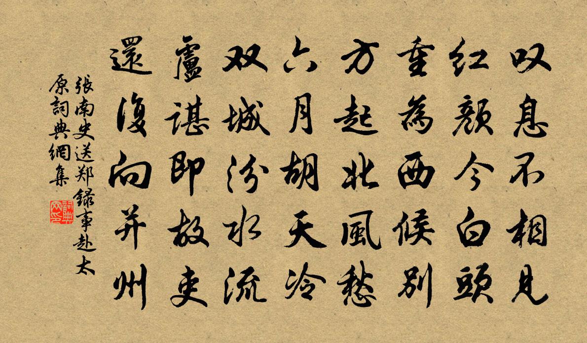 詩詞名句歷史字典書法欣賞書法字典國語詞典說文解字康熙字典古漢語字典標 題 作 者 詩 句 送鄭錄事赴太原作者:張南史 朝代:唐代送鄭錄事赴太原原文嘆息不相見,紅顏今白頭。重為西候別,方起北風愁。六月胡天冷,雙城汾水流。盧諶即故吏,還復向并州。詩詞問答問:送鄭錄事赴太原的作者是誰?答:張南史問:送鄭錄事赴太原寫於哪個朝代?答:唐代問:送鄭錄事赴太原是什麼體裁?答:五律張南史送鄭錄事赴太原書法欣賞送鄭錄事赴太原書法作品注釋全唐詩:卷296_5詩詞推薦題謝氏山居任希夷〔宋代〕風流誰自謝家安,不愛蒼生只愛閒。今日雲孫仍不惡,一間茅屋尚東山。漁家傲梵琦〔元代〕聽說西方無量樂。凡夫淺智難圖度。隨有願度無不獲。何勞縈。珠衣綺饌黃金宅。地似掌平尤廣博。八功德水非穿拄杖陸游〔宋代〕放翁拄杖具神通,蜀棧吳山興未窮。昨夜夢中行萬里,蓮華峰上聽松風。寒食雨三首仇遠〔宋代〕梨花白白柳條青,閉閣焚香奈雨聲。聞道清明明日是,江南風土只宜晴。船子和尚贊釋智遇〔宋代〕煙水寒,扁舟小,華亭江上相尋討。負命劈口一橈,點頭處狼藉不少。父子怯相酬,誰道翻身早。出黃蘆,入紅蓼登景德塔王安石〔宋代〕放身千仞高,北望太行山。邑屋如螘蟻,蔽虧塵霧間。念此屋中人,當復幾人閒。雞鳴起四散,暮夜相與還。物物登樓傅若金〔元代〕樓上西風吹畫屏,樓前秋思滿都亭。金河水去涓涓碧,瓊島雲來冉冉青。近見蕭何成第宅,舊聞汲黯在朝廷。明時胡笳曲九拍文天祥〔宋代〕午夜漏聲催曉箭,寒盡春生洛陽殿。漢主山河錦繡中,可惜春光不相見。自胡之反持干戈,一生抱恨空咨嗟。我已亂後途中李山甫〔唐代〕亂離尋故園,朝市不如村。慟哭翻無淚,顛狂覺少魂。諸侯貪割據,群盜恣併吞。為問登壇者,何年答漢恩。武威送劉單判官赴安西行營,便呈高開府岑參〔唐代〕熱海亘鐵門,火山赫金方。白草磨天涯,湖沙莽茫茫。夫子佐戎幕,其鋒利如霜。中歲學兵符,不能守文章。功業江城子元好問〔金代〕旗亭誰唱渭城詩。酒盈卮。兩相思。萬古垂楊,都是折殘枝。舊見青山青似染,緣底事,澹無姿。情緣不到木腸兒春日俳體方回〔宋代〕氣至時來物不違,小園閒步見天機。荷錢欲出鳴蛙出,柳絮才飛乳燕飛。屋少地寬何不可,家貧春好未全非。莫欺房君珊瑚散李商隱〔唐代〕不見姮娥影,清秋守月輪。月中閒杵臼,桂子搗成塵。華清詞顧雲〔唐代〕祥雲皓鶴盤碧空,喬松稍稍韻微風。絳節影來,朱幡響丁東,相公清齋朝蕊宮。太上符籙龍蛇蹤, * 侍香童酬諸同官見和三首胡寅〔宋代〕蘭塘清暑瞰稀稠,早見排房結子羞。照水華燈宜獨夜,薰香翠被欲爭秋。潛珍不薦霓裳步,凝佇誰同漢女游。欲種隴頭吟曹勛〔宋代〕烏落黃雲塞草秋,隴頭之水東西流,水聲嗚咽鳴啾啾。馬聞思舊櫪,人聞思舊丘,年年征戰無時休。無時休,誰能清心鏡馬鈺〔元代〕修行人,休失錯。仔細尋思,外樂不如內樂。靜清中、真樂真歡,笑靨生花萼。無憂愁,無染著。神氣沖和,心無資中八首范祖禹〔宋代〕武侯祠廟遍空山,萬古名重宇宙間。昔日南人皆稽首,至今歌舞聚夷蠻。山之高三章張玉孃〔宋代〕汝心金石豎, * 冰雪潔。擬結百歲盟,忽成一朝別。朝雲暮雨心去來,千里相思共明月。峰頂孔武仲〔宋代〕苦霰悲風作斧斤,千秋松竹損精神。似聞犬吠白雲外,猶有秦時避世人。名句推薦去年今日臥燕台,銅鼓中宵隱地雷王守仁《元夕二首》 美功不伐,貴位不善佚名《孔子家語·弟子行》 雲中誰寄錦書來,雁字回時,月滿西樓。李清照《一剪梅·紅藕香殘玉簟秋》 但夢想、一枝瀟灑,黃昏斜照水周邦彥《花犯·小石梅花》 有鳥鷙立,羽翼張。柳宗元《唐鐃歌鼓吹曲十二首·其四》 數聲風笛離亭晚,君向瀟湘我向秦。鄭谷《淮上與友人別》 五月天山雪,無花只有寒。李白《塞下曲六首·其一》 飛鴻過也。萬結愁腸無晝夜。蔣氏女《減字木蘭花·題雄州驛》 橫眉冷對千夫指,俯首甘為孺子牛。魯迅《自嘲》 青綾被,莫憶金閨故步晁補之《摸魚兒·東皋寓居》