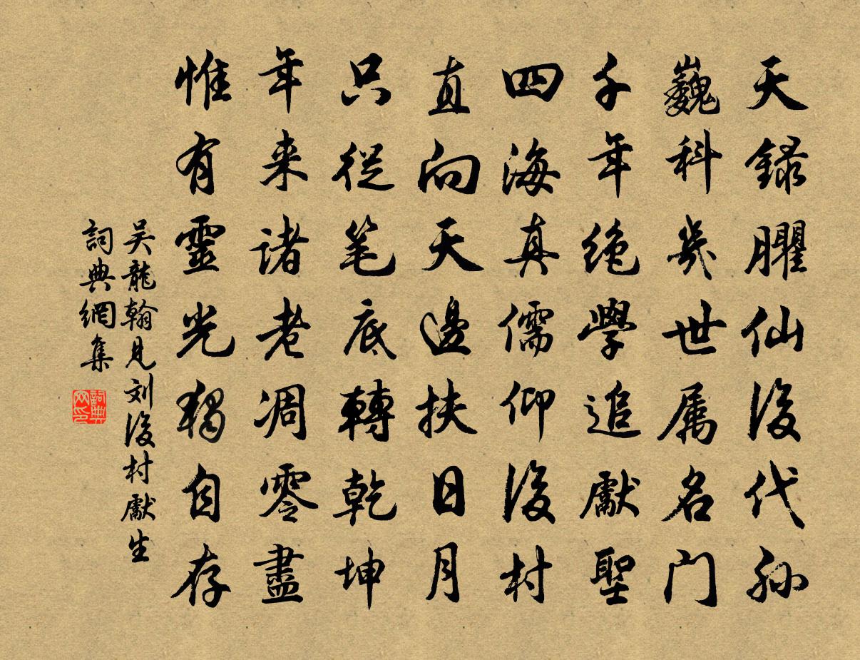 詩詞名句歷史字典書法欣賞書法字典國語詞典說文解字康熙字典古漢語字典標 題 作 者 詩 句 見劉後村先生作者:吳龍翰 朝代:宋代見劉後村先生原文天錄臞仙后代孫,巍科幾世屬名門。千年絕學追先聖,四海真儒仰後村。直向天邊扶日月,只從筆底轉乾坤。年來諸老凋零盡,惟有靈光獨自存。詩詞問答問:見劉後村先生的作者是誰?答:吳龍翰問:見劉後村先生寫於哪個朝代?答:宋代吳龍翰見劉後村先生書法欣賞見劉後村先生書法作品詩詞推薦重到西湖蘇泂〔宋代〕都下重來百事非,故人相見少相知。絕憐水減西湖瘦,更喜兵強北虜衰。奉和襲美贈魏處士五貺詩五瀉舟陸龜蒙〔唐代〕樣自桐川得,詞因隱地成。好漁翁亦喜,新白鳥還驚。沙際擁江沫,渡頭橫雨聲。尚應嫌越相,遺禍不遺名。寄陳居士曹勛〔宋代〕君住西山我住東,杖藜時復得相從。欣欣未見飄飄舉,楚楚先經面面松。仙事既無妻子累,丹爐自有鬼神供。來春西塞風雨蘇軾〔宋代〕斜風細雨到來時,我本無家何處歸。仰看雲天真蒻笠,旋收江海入蓑衣。雪中懷槐坡丹品林石澗〔宋代〕昔同詩伴結清游,亂折梅花當酒籌。十二闌乾風雪裡,玉人扶醉下西樓。懷江村何宏甫自贛上寄林檎戴復古〔宋代〕人好物亦好,交深誼轉深。他鄉如對面,異體實同心。未得平安報,相思長短吟。無從回去馬,有便寄來禽。月夕陸游〔宋代〕我昔隱天台,夜半游句曲。弄月過垂虹,萬頃一片玉。煙艇起菱唱,水風吹釣絲,更欲小徙倚,恐失初平期。今年習家池大堤錢易〔宋代〕清風習池上,落日峴山西。使君來問俗,聽唱白銅鞮。亡嫂靖十君蒲氏輓詞二首蘇轍〔宋代〕家風足圖史,婦德儼苹蘩。湯沐從夫寵,冠衣席弟恩。克家傳眾子,有後慶多孫。追養心何極,增封禮尚存。吏上宋祁〔宋代〕吏上重門鑰,樓喧疊鼓撾。翠沈遙嶺樹,紅斂暝叢花。杼促蟲聲急,眉拖月魄斜。煩心銷熱盡,不待鎮嘉瓜。【雙調】蝶戀花_悟迷楊柳樓周文質〔元代〕悟迷楊柳樓台春蕭索,庭院深沉,不把相思鎖。睡去猶然有夢合,愁來無處容身躲。【喬牌兒】想秦樓金縷歌,風七夕真山民〔宋代〕世上痴兒女,爭趨乞巧筵。婦鳩甘抱拙,不謅鵲橋仙。祈雨歌白玉蟾〔宋代〕天地聾,日月瞽,人間亢旱不為雨。山河憔悴草木枯,天上快活人訴苦。待吾騎鶴下扶桑,叱起倦龍與一斧。奎星迎仙致政王修職輓詞林亦之〔宋代〕晦德香泉下,秋風知幾回。襟懷如阮達,門閥自唐來。立馬曾交語,寒蛩重一哀。生前雙錦軸,亦足慰蒼苔。田父吟五首葉茵〔宋代〕群來野雀繞林梢,三五人家住水坳。翁媼語人年歲好,屋山添得一層茅。喜晴王炎〔宋代〕雲上山椒鳴竹雞,愁行客路踏青泥。窮人也得天調護,乞與新晴可杖藜。依韻奉和經略司徒侍中上巳會興慶池強至〔宋代〕千載蘭亭後,風流宛目前。竹昏煙冉冉,花泣露漣漣。筆落詩推將,杯行酒有仙。水邊佳麗少,春草謾芊綿。以孟夏唱酬陳子高詩寄季承並借窮愁志及其兄趙蕃〔宋代〕莫嗔不寄一行書,半百光陰伏枕余。寂寞瓶儲同靖節,荒涼壁立類相如。君今為況復何似,秋盡想應成定居。獲稻賦得九華松管筆孔武仲〔宋代〕松枝為管京邑無,山翁持贈最勤渠。千年自飽幽澗雪,一日忽快南窗書。但知來處已瀟灑,況復毫端精有餘。茅齊謁白帝廟張俞〔宋代〕孤山扞江口,上有白帝祠。橫視天下險,萬流皆俯窺。古殿鎖神物,悲風出陰帷。天昏瓦棟折,狐鼠亦生威。優巫名句推薦暮雨相呼失,寒塘欲下遲。崔塗《孤雁二首·其二》 記得去年今夕,釃酒溪亭,淡月雲來去。文徵明《念奴嬌·中秋對月》 亂雲低薄暮,急雪舞迴風。杜甫《對雪》 湖南為客動經春,燕子銜泥兩度新。杜甫《燕子來舟中作》 君是南山遺愛守,我為劍外思歸客。蘇軾《滿江紅·江漢西來》 柳花驚雪浦,麥雨漲溪田。李賀《南園十三首》 春去秋來也,愁心似醉醺。歐陽炯《巫山一段雲·春去秋來也》 料因循誤了,殘氈擁雪,故人心眼。張炎《解連環·孤雁》 財以成者,扶而埋之;後得生者,而久禁之。墨子《墨子·22章 節用(下)》 勸我早還家,綠窗人似花。韋莊《菩薩蠻·紅樓別夜堪惆悵》