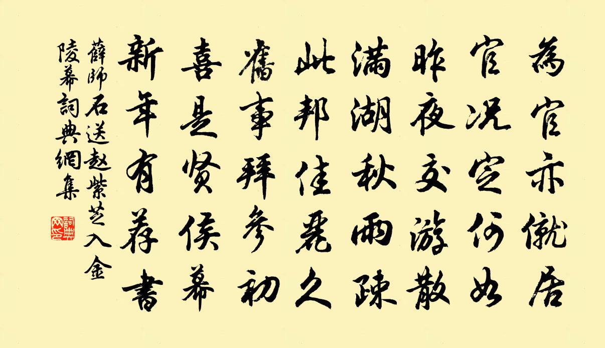 詩詞名句歷史字典書法欣賞書法字典國語詞典說文解字康熙字典古漢語字典標 題 作 者 詩 句 送趙紫芝入金陵幕作者:薛師石 朝代:宋代送趙紫芝入金陵幕原文為官亦僦居,官況定何如。昨夜交遊散,滿湖秋雨疎。此邦佳麗久,舊事拜參初。喜是賢侯幕,新年有薦書。詩詞問答問:送趙紫芝入金陵幕的作者是誰?答:薛師石問:送趙紫芝入金陵幕寫於哪個朝代?答:宋代薛師石送趙紫芝入金陵幕書法欣賞送趙紫芝入金陵幕書法作品詩詞推薦送陶十赴杭州攝掾劉長卿〔唐代〕莫嘆江城一掾卑,滄洲未是阻心期。浙中山色千萬狀,門外潮聲朝暮時。和揭尉冬至韻項安世〔宋代〕自古珍斯日,留機與世窺。不因冬有至,誰識道之涯。一點陽初動,千山木未知。此時俄已復,端的更由誰。酬張長史詩孔稚珪〔南北朝〕同貧清風館。共素白雲室。雲韓維〔宋代〕抱石情雖久,為霖意若何。天心如見用,風力不消多。冷濕朝仙洞,寒迷宿島窠。飛揚終得路,曾入漢皇歌。奉和魯望漁具十五詠。網皮日休〔唐代〕晚掛溪上網,映空如霧縠。閒來發其機,旋旋沈平綠。下處若煙雨,牽時似崖谷。必若遇鯤鮞,從教通一目。寄張仲謀次韻黃庭堅〔宋代〕風力蕭蕭吹短衣,茅檐霜日淡暉暉,天寒塞北雁行落,歲晚大梁書信稀。湖稻初舂雲子白,家雞正有藁頭肥。割鮮建炎丞相成國呂忠穆公退老堂詩二首康執權〔宋代〕公居臨海亦經年,每恨淹留阻執鞭。異縣忽聞登帥閫,此身那得侍賓筵。古今誰似功名老,出入榮持將相權。從此即事陸游〔宋代〕生來骨相本酸寒,天遣沙頭把釣竿。但稱山人擫耳帽,敢希楚客切雲冠。維摩暢林居(一作題維摩暢上人房)李洞〔唐代〕諸方游幾臘,五夏五峰銷。越講迎騎象,蕃齋懺射鵰。冷筇和雪倚,朽櫟帶雲燒。從此西林老,瞥然三萬朝。減字浣溪沙(十五之十四)賀鑄〔宋代〕清淺陂塘藕葉乾。細風疏雨鷺鷥寒。半垂簾幕倚闌乾。惆悵竊香人不見,幾回憔悴後庭蘭。行雲可是渡江難。送從子淵宰浦江樓鑰〔宋代〕誰雲宦路足嶇嶔,送子之官獨放心。廉介有餘無矯亢,謙恭已甚自崇深。安輿何用資三釜,慶問時能抵萬金。公退官定後戲贈(時免河西尉,為右衛率府兵曹)杜甫〔唐代〕不作河西尉,淒涼為折腰。老夫怕趨走,率府且逍遙。耽酒須微祿,狂歌托聖朝。故山歸興盡,回首向風飆。和顏長官百詠漁父朱繼芳〔宋代〕不踏長安十二門,鸕鶿飛處數家村。停橈試向灘頭問,莫是嚴光末世孫。和張二十五游白龍溪甘水谷郊居雜詠七首范祖禹〔宋代〕石徑人行少,山雲袖拂看。水流情共遠,天闊望隨寬。笙磬珍禽響,龍蛇怪蔓盤。洛川回首處,煙靄暮漫漫。烏江廣聖寺虛樂亭賀鑄〔宋代〕避雨孤篷泊柳陰,潮回溪曲稻花深。有時白鷺窺魚下,竟日青蛙伴我吟。酒敵無人情落漠,雲鄉何處老侵尋。誅茅浪淘沙(九日會飲分得雁字)趙鼎〔宋代〕霜露日淒涼。北雁南翔。驚風吹起不成行。弔影蒼波何限恨,日暮天長。為爾惜流光。還是重陽。故人何處艤危牆感皇恩 下晉州臥病中,謝故人相訪王惲〔元代〕暴下晉州城,茫然心曲。臥對風軒數竿竹。暑光不受,似我腰圍□束。病機還自忖、非寒燠。力仕難任,居頭不足石季平題李南畫石之傍日疊石為山已是一重公鄭剛中〔宋代〕筆畫與石疊,二者均是假。惟彼此間山,如疊亦如畫。要當論夫空,萬物同一馬。隨緣判此公案時,不知筆作麽生淑妃閣端午帖子夏竦〔宋代〕蕤賓布序逢良月,條達延祥記令辰。仰奉椒塗宣內治,永昭芳譽冠虞嬪。次韻太學黃博士冕仲同考試作晁補之〔宋代〕日邊傳詔天街暮,草草西城車馬聚。官曹一見故情親,宴語識君心志古。成安長孺澶淵守,昔君羈游所為主。我窮名句推薦昨夜更闌酒醒,春愁過卻病。李璟《應天長·一鉤初月臨妝鏡》 昔年多病厭芳尊,今日芳尊惟恐淺。錢惟演《木蘭花·城上風光鶯語亂》 笑拈芳草不知名,乍凌波、斷橋西堍。吳文英《西子妝慢·湖上清明薄游》 夜發清溪向三峽,思君不見下渝州。李白《峨眉山月歌》 盡信書,則不如無書。孟子《孟子·盡心章句下·第三節》 山不在高,有仙則名水不在深,有龍則靈劉禹錫《陋室銘》 隋堤上、曾見幾番,拂水飄綿送行色。周邦彥《蘭陵王·柳》 三載重陽菊,開時不在家。文森《九日》 雪虐風饕愈凜然,花中氣節最高堅。陸游《落梅》 春山暖日和風,闌乾樓閣簾櫳,楊柳鞦韆院中。白樸《天淨沙·春》