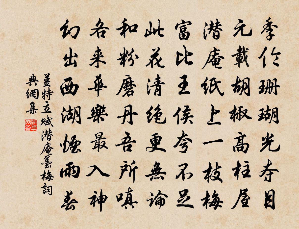 詩詞名句歷史字典書法欣賞書法字典國語詞典說文解字康熙字典古漢語字典標 題 作 者 詩 句 賦潛庵墨梅作者:姜特立 朝代:宋代賦潛庵墨梅原文季倫珊瑚光奪目,元載胡椒高柱屋。潛庵紙上一枝梅,富比王侯夸不足。此花清絕更無論,和粉磨丹吾所嗔。各來華樂最入神,幻出西湖煙雨春。詩詞問答問:賦潛庵墨梅的作者是誰?答:姜特立問:賦潛庵墨梅寫於哪個朝代?答:宋代姜特立賦潛庵墨梅書法欣賞賦潛庵墨梅書法作品詩詞推薦南鄉子朱埴〔宋代〕花柳隔重扃。送過鞦韆笑語聲。檐鵲也嗔人起晚,天晴。孤負東風趁踏青。細細砑紅綾。小字相思寫不成。心上可僧問四賓主因而有頌頌之釋重顯〔宋代〕如何是賓中主。雲兆分其五,又曰引。〔頌〕賓中之主,玄沙猛虎。半合半開,唯自相許。新樓詩二十首靈汜橋李紳〔唐代〕靈汜橋邊多感傷,分明湖派繞回塘。岸花前後聞幽鳥,湖月高低怨綠楊。能促歲陰惟白髮,巧乘風馬是春光。何須游劉寺次林子長郎中韻王炎〔宋代〕琳琅觸目聚潛郎,假日相攜入酒鄉。小憑筍輿穿野徑,卻尋蕭寺涉修廊。意行塵外襟懷爽,身坐梅邊笑語香。頭白送鄭丈媚孚先改秩用廣西諸公韻陳宓〔宋代〕間關萬里游嶺海,誰知丈夫志有在。古賢足跡滿四方,豈但青編勤摭採。胸多聞見益崔嵬,節歷險夷終不改。山川途中有懷駱賓王〔唐代〕眷然懷楚奏,悵矣背秦關。涸鱗驚照轍,墜羽怯虛彎。素服三川化,烏裘十上還。莫言無皓齒,時俗薄朱顏。和梅聖俞杏花歐陽修〔宋代〕誰道梅花早,殘年豈是春。何如艷風日,獨自占芳辰。訪友野外趙汝鐩〔宋代〕雨意方濃改作晴,杖藜野外訪柴荊。爭尋桑葉占蠶熟,退立田塍避犢行。風過沙平收鳥跡,煙濃寺沒但鐘聲。小童捧硯姬空翠二首許月卿〔宋代〕看山車放慢,遇水馬爭先。須信一年景,無如三月天。露花如此好,煙柳十分員。客醉不須去,竹床相對眠。哭費拾遺征君姚合〔唐代〕服儒師道旨,糲食臥中林。誰識先生事,無身是本心。空山流水遠,故國白雲深。日夕誰來哭,唯應猿鳥吟。南池雜詠五首寒山皎然〔唐代〕侵空撩亂色,獨愛我中峰。無事負輕策,閒行躡幽蹤。眾山搖落盡,寒翠更重重。皇后閣端午貼子詞五首真德秀〔宋代〕虎垂朱萬戶,槐龍舞玉墀。晝長無一事,祗誦二南詩。送周六赴濠州戶曹二首張耒〔宋代〕從來悟道不由書,覿面相呈已有餘。麈尾花飛終不近,濠梁古鬼解揶揄。江南弄周巽〔元代〕春意動。池塘初解凍。花間啼鳥驚人夢。綺戶微開曙色明。沉香火暖曉寒輕。夭桃半吐傳芳訊,新鶯百囀感中情。次韻起岩喜雪范成大〔宋代〕吹成一雪便吹殘,風伯無端豈坐慳。夜報飛花平瓦壟,曉驚疏雨落檐間。休教凍解魚龍水,更待誠通虎豹關。準擬雙頭蓮(雙調)周邦彥〔宋代〕一抹殘霞,幾行新雁,天染雲斷,紅迷陣影,隱約望中,點破晚空澄碧。助秋色。門掩西風,橋橫斜照,青翼未來有懷聶尉五首白玉蟾〔宋代〕劍浦猶殘堠,螺江始問津。向來風浪惡,回首謝靈均。頌古三十三首釋師觀〔宋代〕一著高一著,一步闊一步。五百年間生,指出這條路。這條路,十聖三賢皆罔措。觀華夷圖曹松〔唐代〕落筆勝縮地,展圖當晏寧。中華屬貴分,遠裔占何星。分寸辨諸岳,斗升觀四溟。長疑未到處,一一似曾經。鷓鴣天(壽徐主簿)郭應祥〔宋代〕前數重陽後小春。中間十日是生辰。二年穩作棲鸞客,百里誰非賀燕人。無一事,擾天真。年登八八愈精神。句稽名句推薦幾度東風吹世換,千年往事隨潮去。戴復古《滿江紅·赤壁懷古》 問元戎早晚,鳴鞭徑去,解天山箭。元好問《水龍吟·從商帥國器獵於南陽同仲澤鼎玉賦此》 松江上,念故人老矣,甘臥閒雲。吳文英《沁園春·送翁賓暘游鄂渚》 故人溪上,掛愁無奈,煙梢月樹。史達祖《留春令·詠梅花》 重重疊疊上瑤台,幾度呼童掃不開。蘇軾《花影》 世事悠悠渾未了,年光冉冉今如許。吳潛《滿江紅·送李御帶珙》 旅館寒燈獨不眠,客心何事轉悽然。高適《除夜作》 世情薄,人情惡,雨送黃昏花易落。唐婉《釵頭鳳·世情薄》 落葉聚還散,寒鴉棲復驚。李白《三五七言 / 秋風詞》 弗愛弗利,親子叛父。劉安及其門客《淮南子·繆稱訓》