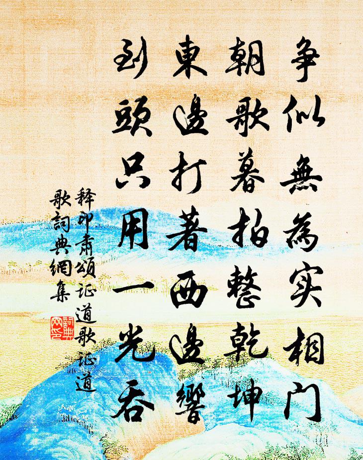 詩詞名句歷史字典書法欣賞書法字典國語詞典說文解字康熙字典古漢語字典標 題 作 者 詩 句 頌證道歌證道歌作者:釋印肅 朝代:宋代頌證道歌證道歌原文爭似無為實相門,朝歌暮拍整乾坤。東邊打著西邊響,到頭只用一光吞。詩詞問答問:頌證道歌證道歌的作者是誰?答:釋印肅問:頌證道歌證道歌寫於哪個朝代?答:宋代釋印肅頌證道歌證道歌書法欣賞頌證道歌證道歌書法作品詩詞推薦鐘山春遊任希夷〔宋代〕柳邊淮水一般綠,花底鐘山分外青。閒趁遊絲不行遠,夕陽才過已疏星。頌古五十三首釋文禮〔宋代〕階頭放下劫初鈴,相撲呼它馬使名。五棒打來無雪處,卻言渠不是官行。偈公六十五首釋鹹傑〔宋代〕滿目紛紛呈瑞雪,填溝塞壑誰辨別。文殊無處頓渾身,普賢失卻真妙訣。烏鴉變作白頭鴉,鐵樹翻成銀線結。報諸薦福寺次許師詠竹裘萬頃〔宋代〕浮雲蹤跡任西東,翰墨場中且用功。時對此君喔七字,也勝痴坐辯幡風。偈二十七首釋守淨〔宋代〕談玄說妙,撒屎撒尿。行棒行喝,將鹽止渴。立主立賓,花擘宗乘。楚塞樓劉長源〔宋代〕出峽朝天第一州,使君重敞最高樓。蜀江雪浪初平處,楚國金城欲盡頭。武林山十詠飛來峰梅詢〔宋代〕竺慧指此峰,飛來自靈鷲。猿鳥曾未知,煙嵐尚依舊。興亡謾千古,天地豈關紐。祇恐舟壑移,他年卻西走。廣四愁寄李譓賀鑄〔宋代〕夜如何其夜未央,斗星燦兮河蒼涼。微月入牖窺曲房,候蟲刺促鳴我床。離憂欻來煎人腸,夜如何其夜何長。綠琴喜劉主簿歸劉黻〔宋代〕同是青藜一祖來,晚成天欲成其才。家裡傳虎榜承渥,人說犧經舊屢魁。春色風流都羨柳,歲寒事業莫過梅。誰憐寄趙信州一叔二首趙蕃〔宋代〕官梅親手種,山閣聽僧修。授簡慚吾事,登高企勝流。葭莩元有托,桑梓近臨州。愧我資身拙,從公但食謀。謁金門周密〔宋代〕花不定。燕尾翦開紅影。幾點露香蜂趕趁。日遲簾幕靜。試把翠蛾輕暈。愁滿寶台鸞鏡。屈指一春將次盡。歸期猶再次韻魏了翁〔宋代〕眇觀千載苦無人,窺見一毫先有我。雋敏既為文采誤,高明又被玄虛鎖。鐵幢浦王安石〔宋代〕憶昨初為海上行,日斜來往看潮生。如今身是西歸客,回首山川覺有情。馴犀-感為政之難終也白居易〔唐代〕馴犀馴犀通天犀,軀貌駭人角駭雞。海蠻聞有明天子,驅犀乘傳來萬里。一朝得謁大明宮,歡呼拜舞自論功。五年為牟德范題石湖遺墨意有未盡復賦五首方回〔宋代〕青春日月羈塵鞅,朱夏乾坤熾暑爐。略對風檐紬古卷,閒愁吹得一星無。潼關道中晁補之〔宋代〕塵土長安古道深,潼關依舊接桃林。使君驄馬來何後,道士青牛去莫尋。春半河山猶寂莫,日長坑阪正崎嶔。平生詠鶴周端臣〔宋代〕覓來雛鶴養經年,認得呼名傍客前。放去幾隨雲過海,歸來一片雪翻天。翎梳修竹林間日,影照寒梅澗下泉。眷戀舟次橫河呈孫季和通守蘇泂〔宋代〕冉冉歸雲不自閒,紛紛暮靄已依山。時光盡入髭鬚里,行色元非草樹間。舊臘新正能幾許,粗衣糲飯試諸難。吾生有山堂曾幾〔宋代〕江南家家窗,何處無遠岫。唯有謝玄暉,眼中揖其秀。景定甲子夏五三日王希夷兄有弄璋之慶是時希金履祥〔宋代〕七日已叨湯餅客,幾時親賞寧馨兒。有崇佛子於今見,王氏多佳自古寄。培養慶源惟一善,流傳家學有餘師。異時名句推薦出耒在明晨,山寒易霜霰。王守仁《謫居糧絕請學於農將田南山詠言寄懷》 到頭來,依舊是風塵骯髒違心愿。曹雪芹《紅樓夢·第五回》 即從巴峽穿巫峽,便下襄陽向洛陽。杜甫《聞官軍收河南河北》 君子不自大其事,不自尚其功戴聖《禮記·表記》 醉舞梁園夜,行歌泗水春杜甫《寄李十二白二十韻》 亂碧萋萋,雨後江天曉。梅堯臣《蘇幕遮·草》 長安故人別後,料征鴻聲里,畫闌憑偏。王月山《齊天樂·夜來疏雨鳴金井》 卻嫌脂粉污顏色,淡掃蛾眉朝至尊。張祜《集靈台·其二》 因思杜陵夢,鳧雁滿回塘。溫庭筠《商山早行》 何事東君,解將芳思,巧綴一斛春冰。朱晞顏《一萼紅·盆梅》