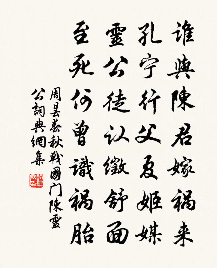 詩詞名句歷史字典書法欣賞書法字典國語詞典說文解字康熙字典古漢語字典標 題 作 者 詩 句 春秋戰國門陳靈公作者:周曇 朝代:唐代春秋戰國門陳靈公原文誰與陳君嫁禍來,孔寧行父夏姬媒。靈公徒認徵舒面,至死何曾識禍胎。詩詞問答問:春秋戰國門陳靈公的作者是誰?答:周曇問:春秋戰國門陳靈公寫於哪個朝代?答:唐代周曇春秋戰國門陳靈公書法欣賞春秋戰國門陳靈公書法作品注釋全唐詩:卷728-33詩詞推薦畫馬篇(同諸公宴睢陽李太守,各賦一物)高適〔唐代〕君侯櫪上驄,貌在丹青中。馬毛連錢蹄鐵色,圖畫光輝驕玉勒。馬行不動勢若來,權奇蹴踏無塵埃。感茲絕代稱妙送柴大諫赴闕張士遜〔宋代〕一萬餘家留戀意,二三十里管弦聲。惠加潼水流難盡,鞭指金門望轉清。後苦寒行二首杜甫〔唐代〕南紀巫廬瘴不絕,太古以來無尺雪。蠻夷長老怨苦寒,崑崙天關凍應折。玄猿口噤不能嘯,白鵠翅垂眼流血。安得趙深甫年七十有親九十貧無以養索賦魏了翁〔宋代〕囝思郎罷久無炊,父曰子行胡不歸。負米上堂寬頻索,不妨逿地戲兒衣。題曾景山通判壽衍堂楊萬里〔宋代〕人家具慶已燕喜,人家重慶更奇偉。宜春台上賢治中,妙齡斫桂廣寒宮。親年九十身六二,芝蘭玉樹森庭砌。上堂醉落魄/一斛珠管鑒〔宋代〕寒欺酒力。一番風雨花如摘。酴醿不與群花敵。笑吐清香,獨自殿春色。春愁惟酒消除得。何妨常滿坐中客。因花次韻杏花三首王安石〔宋代〕心憐紅蕊與移栽,不惜年年糞壤培。風雨無時誰會得,欲教零亂強催開。范才元參議求酒於延使君邀予同賦謹次其韻張元乾〔宋代〕桑落冷篘玉,菊籬霜著天。飄零河朔飲,悵望竹林賢。烏有防前轍,青州貴下田。使君能遣騎,端為喚魚船。南柯子(丙申重九)黃升〔宋代〕蘭佩秋風冷,茱囊曉露新。多情多感怯芳辰。強折黃花來照、碧粼粼。落帽參軍醉,空樽靖節貧。世間那復有斯人春早選寓長安二首薛能〔唐代〕疏拙自沉昏,長安豈是村。春非閒客事,花在五侯門。道僻惟憂禍,詩深不敢論。揚雄若有薦,君聖合承恩。舊論寄題張正國斗齋陳文蔚〔宋代〕貶值大廈室廬窘,之子數椽天地寬。醉里揮毫詩膽大,不懸金印老江乾。武陵春(賡何顯夫小舟有景)盧炳〔宋代〕紅荻黃蘆秋已老,妝點楚江頭。更有吳姬撥小橈。來往自妖嬈。款款艤舟臨別岸,短纜系花梢。料得前身是莫愁。秋浦老漁釋文珦〔宋代〕秋浦老漁人不識,清溪數灣船一隻。釣竿垂垂釣絲直,眼光過似豀光碧。得魚歸來不自吃,開籠分與白鷳食。卻來感懷方岳〔宋代〕非乾寵辱不能驚,一付之天莫我攖。舉世忙時贏得懶,是人愛處放教輕。生為柱國身何在,死象祁連冢亦平。千古橫江柯芝〔宋代〕橫江一片碧,攜鶴上漁船。收綸不成下,卻抱釣竿眠。聞松風有感陸游〔宋代〕重位每憂身後罵,虛名不救眼前飢。直須採藥名山去,日夜松風無歇時。題熙軒鄭俠〔宋代〕達人取次總佳宜,瀟灑清軒聊自頤。垣果砌花堪笑語,牖風庭月共希夷。滿堂虛白琴三弄,竟日醺酣酒一卮。別有玉爐三澗雪 謝道友訪及王丹枉〔元代〕魯拙倦貪世利,疏慵唯愛山居。深承道友喜相呼。來結良緣妙趣。但願徐登壽域,更祈重悟虛無。塵勞放下萬緣除壽陽王花燭圖(一作沈佺期詩)宋之問〔唐代〕仙媛乘龍日,天孫捧雁來。可憐桃李樹,更繞鳳凰台。燭照香車入,花臨寶扇開。莫令銀箭曉,為盡合歡杯。午陰小飲袁說友〔宋代〕草樹澗邊青,人稀自掩扃。陰沈端午水,晴映半天星。倦枕敷橫榻,枯藜傍小亭。誰知一杯酒,小醉不嫌醒。名句推薦萬里歸船弄長笛,此心吾與白鷗盟。黃庭堅《登快閣》 去年花里逢君別,今日花開已一年。韋應物《寄李儋元錫》 焚琴煮鶴從來有,惜玉憐香幾個知!馮夢龍《醒世恆言·卷三》 酒極則亂,樂極則悲。司馬遷《史記·滑稽列傳》 不力行,但學文。長浮華,成何人。李毓秀《弟子規·餘力學文》 處富貴之地,要知貧賤的痛癢;當少壯之時,須念衰老的辛酸。洪應明《菜根譚·概論》 尋常百種花齊發,偏摘梨花與白人。元稹《離思五首》 今夜送歸燈火冷,河塘,墮淚羊公卻姓楊。蘇軾《南鄉子·和楊元素時移守密州》 為問元戎竇車騎,何時返旆勒燕然。皇甫冉《春思》 鳳皇舟上楚女,妙舞,雷喧波上鼓孫光憲《河傳·柳拖金縷》