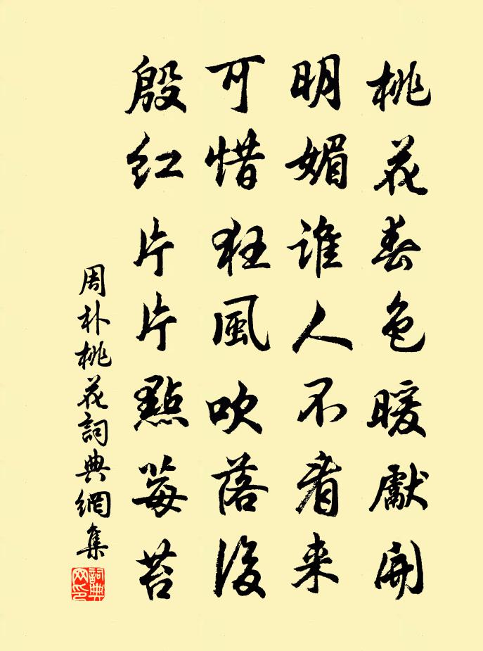 詩詞名句歷史字典書法欣賞書法字典國語詞典說文解字康熙字典古漢語字典標 題 作 者 詩 句 桃花作者:周朴 朝代:唐代桃花原文桃花春色暖先開,明媚誰人不看來。可惜狂風吹落後,殷紅片片點莓苔。詩詞問答問:桃花的作者是誰?答:周朴問:桃花寫於哪個朝代?答:唐代問:桃花是什麼體裁?答:七絕周朴桃花書法欣賞桃花書法作品注釋桃花在漸暖的春色里先於百花綻放,誰能忍住不去看那明媚美麗的顏色?可惜初春的狂風地吹過以後,那美麗的花瓣卻只化成片片血紅的顏色點綴在青苔之上。標籤:詠物,桃花詩詞推薦牡丹芳白居易〔唐代〕牡丹芳,牡丹芳,黃金蕊綻紅玉房。千片赤英霞爛爛,百枝絳點燈煌煌。照地初開錦繡段,當風不結蘭麝囊。仙人溪上遇雨二首崔道融〔唐代〕回塘雨腳如繅絲,野禽不起沈魚飛。耕蓑釣笠取未暇,秋田有望從淋漓。坐看黑雲銜猛雨,噴灑前山此獨晴。忽驚詠木槿樹題武進文明府廳劉庭琦〔唐代〕物情良可見,人事不勝悲。莫恃朝榮好,君看暮落時。詠省壁畫鶴宋之問〔唐代〕粉壁圖仙鶴,昂藏真氣多。鶱飛竟不去,當是戀恩波。金明池·詠寒柳柳如是〔明代〕有悵寒潮,無情殘照,正是蕭蕭南浦。更吹起,霜條孤影,還記得,舊時飛絮。況晚來,煙浪斜陽,見行客,特地定風波 紅梅蘇軾〔宋代〕好睡慵開莫厭遲。自憐冰臉不時宜。偶作小紅桃杏色,閒雅,尚餘孤瘦雪霜姿。休把閒心隨物態,何事,酒生微暈東風第一枝·詠春雪史達祖〔宋代〕巧沁蘭心,偷黏草甲,東風慾障新暖。謾凝碧瓦難留,信知暮寒輕淺。行天入鏡,做弄出、輕鬆纖軟。料故園、不梅花 / 梅王安石〔宋代〕牆角數枝梅,凌寒獨自開。遙知不是雪,為有暗香來。玉台觀杜甫〔唐代〕浩劫因王造,平台訪古游。彩雲蕭史駐,文字魯恭留。宮闕通群帝,乾坤到十洲。人傳有笙鶴,時過此山頭。六醜·薔薇謝後作周邦彥〔宋代〕正單衣試酒,恨客里、光陰虛擲。願春暫留,春歸如過翼。一去無跡。為問花何在,夜來風雨,葬楚宮傾國。釵鈿浣溪沙·幾共查梨到雪霜蘇軾〔宋代〕幾共查梨到雪霜,一經題品便生光,木奴何處避雌黃。北客有來初未識,南金無價喜新嘗,含滋嚼句齒牙香。柳梢青·茅舍疏籬楊無咎〔宋代〕茅舍疏籬。半飄殘雪,斜臥低枝。可更相宜,煙籠修竹,月在寒溪。寧寧佇立移時。判瘦損、無妨為伊。誰賦才情寓言三首·其二李白〔唐代〕搖裔雙彩鳳,婉孌三青禽。往還瑤台里,鳴舞玉山岑。以歡秦娥意,復得王母心。區區精衛鳥,銜木空哀吟。瑤花慢·朱鈿寶玦周密〔宋代〕后土之花,天下無二本。方其初開,帥臣以金瓶飛騎,進之天上,間亦分致貴邸。余客輦下,有以一枝已下共缺十微雨李商隱〔唐代〕初隨林靄動,稍共夜涼分。窗迥侵燈冷,庭虛近水聞。江城子·嫩黃初染綠初描譚宣子〔宋代〕嫩黃初染綠初描,倚春嬌,索春饒。燕外鶯邊,想見萬絲搖。便作無情終軟美,天賦與、眼眉腰。短長亭外短長橋臨江仙·梅李清照〔宋代〕庭院深深深幾許,雲窗霧閣春遲,為誰憔悴損芳姿。夜來清夢好,應是發南枝。玉瘦檀輕無限恨,南樓羌管休吹。野菊王建〔唐代〕晚艷出荒籬,冷香著秋水。憶向山中見,伴蛩石壁里。與東方左史虬修竹篇陳子昂〔唐代〕東方公足下:文章道弊五百年矣。漢魏風骨,晉宋莫傳,然而文獻有可征者。仆嘗暇時觀齊、梁間詩,彩麗競繁,蟾宮曲·詠西湖奧敦周卿〔元代〕西山雨退雲收,縹緲樓台,隱隱汀洲。湖水湖煙,畫船款棹,妙舞輕謳。野猿搦丹青畫手,沙鷗看皓齒明眸。閬苑名句推薦草長鶯飛二月天,拂堤楊柳醉春煙。高鼎《村居》 沉憂能傷人,綠鬢成霜蓬。李白《怨歌行》 女也不爽,士貳其行。士也罔極,二三其德。佚名《氓》 但從今、記取楚樓風,裴台月。辛棄疾《滿江紅·漢水東流》 曉風催我掛帆行,綠漲春蕪岸欲平。查慎行《曉過鴛湖》 去年東武今夕,明月不勝愁。蘇轍《水調歌頭·徐州中秋》 權勢之徒,雖至親亦作威福,豈知煙雲過眼,已立見其消亡王永彬《圍爐夜話·第二二則》 生民之本,要當稼稽而食,桑麻以衣。顏之推《顏氏家訓·治家篇》 仰天大笑出門去,我輩豈是蓬蒿人。李白《南陵別兒童入京》 灞橋煙柳,曲江池館,應待人來。陸游《秋波媚·七月十六日晚登高興亭望長安南山》