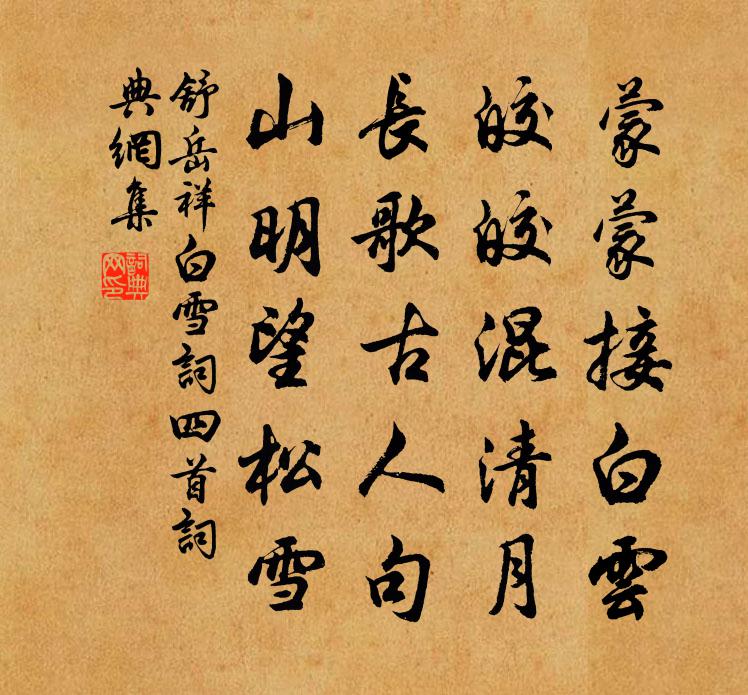 詩詞名句歷史字典書法欣賞書法字典國語詞典說文解字康熙字典古漢語字典標 題 作 者 詩 句 白雪詞四首作者:舒岳祥 朝代:宋代白雪詞四首原文蒙蒙接白雲,皎皎混清月。長歌古人句,山明望松雪。詩詞問答問:白雪詞四首的作者是誰?答:舒岳祥問:白雪詞四首寫於哪個朝代?答:宋代舒岳祥白雪詞四首書法欣賞白雪詞四首書法作品詩詞推薦春暮思平泉雜詠二十首竹徑李德裕〔唐代〕野竹自成徑,繞溪三里余。檀欒被層阜,蕭瑟蔭清渠。日落見林靜,風行知谷虛。田家故人少,誰肯共焚魚。七交七首尹書記歐陽修〔宋代〕師魯天下才,神鋒凜豪雋。逸驥臥秋櫪,意在騤騤迅。平居弄翰墨,揮灑不停瞬。談笑帝王略,驅馳古今論。良工【南呂】四塊玉 閒適關漢卿〔元代〕適意行,安心坐。渴時飲,飢時餐,醉時歌。困來時就向莎茵臥。日月長,天地闊,閒快活。陸處士別業方乾〔唐代〕問道遠相訪,無人覺路長。夜深回釣楫,月影出書床。蟬噪蓼花發,禽來山果香。多時欲歸去,西望又斜陽。太皇太后閣春帖子趙湘〔唐代〕銅霤消殘凍,朱樓拂早霞。傳聲回步輦,來賞小桃花。山居葉茵〔宋代〕朝踏山根雲,暮歸雲中扉。野鳥始驚避,今焉情依依。異哉海上鷗,猜疑未忘機。奉和江沖陶居二十韻汪炎昶〔宋代〕人世紛喧囂,空山自茅棟。煩君固扃鐍,保此曲肱夢。舟中作陸游〔宋代〕蘧蒢作帆三版船,漁燈夜泊閶門邊。煙波四萬八千頃,造物推排作水仙。題孟中丞茅閣元結〔唐代〕小山為郡城,隨水能縈紆。亭亭最高處,今是西南隅。杉大老猶在,蒼蒼數十株。垂陰滿城上,枝葉何扶疏。乃知雨狄遵度〔宋代〕高林風怒雨聲黑,小閣燈背人語闌。誰知雲外月高照,定是葉間鶯最寒。時覺急飄愁未已,似聞徐滴喜初翻。驪駒寄介甫王令〔宋代〕天門廉陛郁巍巍,勢利寧無淡泊譏。誰與跖徒爭有道,好思吾黨共言歸。古人踽踽今何取,天下滔滔昔已非。終見送蘇評事韋應物〔唐代〕季弟仕譙都,元兄坐蘭省。言訪始忻忻,念離當耿耿。嵯峨夏雲起,迢遞山川永。登高望去塵,紛思終難整。虛谷志歸後賦十首方回〔宋代〕四十載錢塘,詩狂復酒狂。湖山空御苑,市井尚宮妝。冶肆淆禪剎,勛門賣節堂。歸來念前事,朽骨果誰香。惜奴嬌王之道〔宋代〕不廝知名,怎奈向、前緣注定。一封書、便成媒娉。千里相從,恰似尋盟合姓。泥濘。尚隔個、轎兒難近。薄薄紗冬末病中作二首貫休〔唐代〕冬風吹草木,亦吹我病根。故人久不來,冷落如丘園。聃龍與摩詰,吁嘆非不聞。顧惟年少時,未合多憂勤。風鍾緣識宋太宗〔宋代〕高山樹葉翠森森,寂靜因中道最深。利得崑崙皆璞玉,不須麗水有真金。澆漓漸變同堯日,薄俗將重理舜琴。禍福梅柟釋文珦〔宋代〕梅柟三四樹,手種近岩房。始見條抽綠,俄驚葉隕黃。物情殊易變,身世豈能常。且盡修心法,休傳卻死方。宮祠滿秩曾幾〔宋代〕雲水天台郡,祠庭我所監。幾年真傲吏,今日是前銜。祿米誰周急,園蔬不療饞。上書端未免,定不達空函。和褒山因老二首王之道〔宋代〕湖上逢師又到家,別來詩句好相夸。休嗟晚菊今迷草,且喜寒梅欲放花。丈室香溫嚴寶坐,將壇風軟擁高牙。相思酬隱者劉桃岡汪元量〔宋代〕食既彈長鋏,囊懸少錯刀。功名須汝輩,詩酒且吾曹。強項貧而樂,揚眉氣自豪。北來魚字密,南去雁書高。擬折名句推薦岱宗夫如何?齊魯青未了。杜甫《望岳》 興盡晚回舟,誤入藕花深處。李清照《如夢令·常記溪亭日暮》 人皆可罪,罪人須定其人。來俊臣《羅織經·問罪卷第十》 百囀千聲隨意移,山花紅紫樹高低。歐陽修《畫眉鳥》 望廬思其人,入室想所歷。潘安《悼亡詩三首》 巴山重疊相逢處。燕子占巢花脫樹。張先《漁家傲·和程公辟贈》 花過雨。又是一番紅素。燕子歸來愁不語。李好古《謁金門·花過雨》 仁則榮,不仁則辱。孟子《孟子·公孫丑章句上·第四節》 梅子黃時日日晴,小溪泛盡卻山行曾幾《三衢道中》 記取西湖西畔,正暮山好處,空翠煙霏。蘇軾《八聲甘州·寄參寥子》