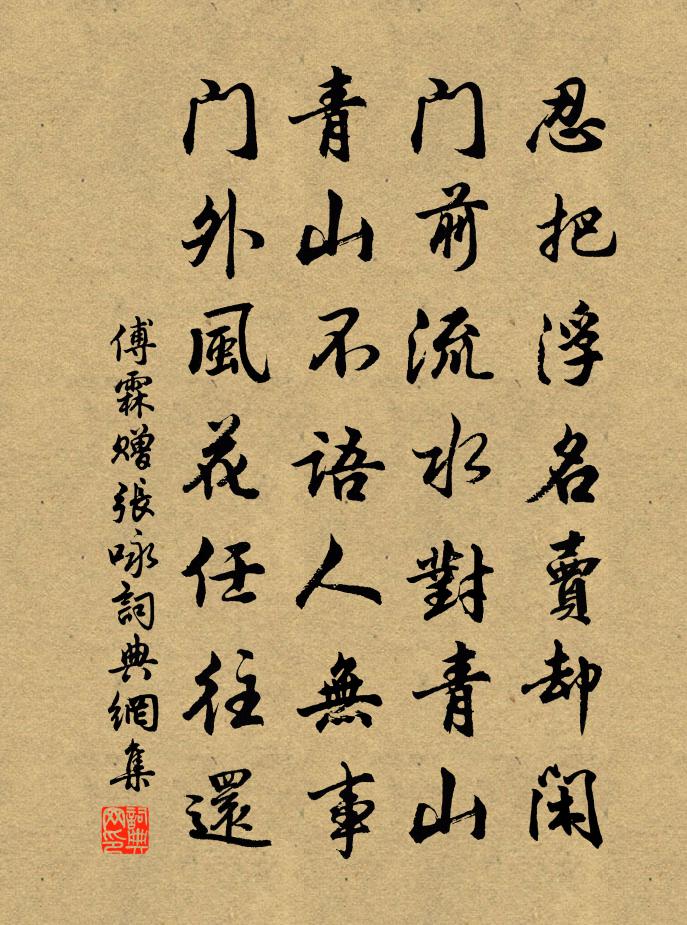 詩詞名句歷史字典書法欣賞書法字典國語詞典說文解字康熙字典古漢語字典標 題 作 者 詩 句 贈張詠作者:傅霖 朝代:宋代贈張詠原文忍把浮名賣卻閒,門前流水對青山。青山不語人無事,門外風花任往還。詩詞問答問:贈張詠的作者是誰?答:傅霖問:贈張詠寫於哪個朝代?答:宋代傅霖贈張詠書法欣賞贈張詠書法作品詩詞推薦鹿丁謂〔宋代〕賦命斯千載,登仙托五雲。發祥呈玉質,標異冠星文。食薦時鳴野,游林或命群。白環何日至,真祖有前聞。視田五首贈八弟無斁晁補之〔宋代〕河流之所濡,一斛泥數斗。我莊當水窮,乃比石田瘦。尚無東陵瓜,況有南山豆。天雨不可期,且復鞭牛後。溪居柳宗元〔唐代〕久為簪組累,幸此南夷謫。閒依農圃鄰,偶似山林客。曉耕翻露草,夜榜響溪石。來往不逢人,長歌楚天碧。菩薩蠻(葉丞相園賞木犀,次韻子師)韓元吉〔宋代〕梧桐葉上秋蕭瑟。畫闌桂樹攢金碧。花底最風流。相逢不上樓。數枝添寶髻。滴滴香沾袂。杯到莫留殘。霧窗疑廣次韻秋日五首姜特立〔宋代〕木落山寒境更幽,世間萬事入搔頭。何人為廣秋聲賦,我欲歸田蚤晚休。說之方憂韓公表大夫疾遽致仕乃蒙傳視送陳州晁說之〔宋代〕能老彼形骸,孰疲此精神。繄其抱病客,只是苦吟身。少出便十首,高興感五辰。嗟予強屬和,汲思如井輪。江上梅花陸游〔宋代〕老年樂事少關身,猶喜尊前見玉人。豈是淒涼偏薄命,自緣纖瘦不禁春。娟娟月上明江練,黯黯天低糝玉塵。絕澗西江月(道調宮)張先〔宋代〕泛泛春船載樂,溶溶湖水平橋。高鬟照影翠煙搖。白紵一聲雲杪。倦醉天然玉軟,弄妝人惜花嬌。風情遺恨幾時消大牆上蒿行曹丕〔魏晉〕陽春無不長成。草木羣類隨大風起。零落若何翩翩。中心獨立一何煢。四時舍我驅馳。今我隱約欲何為。人生居天守居園池雜題天漢台文同〔宋代〕北岸亭館眾,最先登此台。台高望群峰,萬里雲崔嵬。和蘇養直題孫郎中扶疏堂二首曹勛〔宋代〕白項鴉兒趁曉啼,梢梢寒柳出疏籬。未飛臘雪連天白,且看江雲四面垂。寓天台水南四首林憲〔宋代〕夔皋不著書,周召不決科。端坐廟堂上,四海臻泰和。此道固如是,後來文藝多。嗒然空山中,獨抱明良歌。次韻知郡安撫九日南樓宴集范成大〔宋代〕斯民鄒魯更豐年,雅道淒涼見此賢。萬隴登禾新霽色,千村鳴柝舊寒煙。鏘金絕世詩情妙,倚劍凌空隸墨鮮。珍重雒谷諺佚名〔唐代〕謥洞入黃泉。紹興祀岳鎮海瀆四十三首佚名〔宋代〕俎豆紛披,金石繁會。侑以貳尊,匪瀆匪怠。我畫既周,我心孔砑。憺兮容興,彷佛如在。旱後喜雨四首楊萬里〔宋代〕竟夏興雲只苦風,入秋今雨稍宜農。怪來霹靂車枯樹,知向前山起臥龍。運有榮枯行釋文珦〔宋代〕運有榮枯,道有隆污。吉凶福禍,相為乘除。歷覽舊載,變滅紛如。或以貧殘,或以逼誅。莫知其端,為之長吁。閶門外登溪船五首楊萬里〔宋代〕選甚天時晴未晴,舟行終是勝山行。蓬收雨點斜偏好,枕慣波聲夢不驚。幸自車徒小休息,又聞鼓笛鬧將迎。偶然和竇中丞晚入容江作劉禹錫〔唐代〕漢郡三十六,鬱林東南遙。人倫選清臣,天外頒詔條。桂水步秋浪,火山凌霧朝。分圻辨風物,入境聞謳謠。莎岸永豐祝子益和予詩見寄許見訪以長句謝之且賢陳文蔚〔宋代〕反關甘與世情暌,綠遍閒庭草欲齊。何處客來談列岫,有人雪踏自東溪。坐低流欲幾千輩,已見新詩第一題。他日名句推薦唯願當歌對酒時,月光長照金樽里。李白《把酒問月·故人賈淳令予問之》 曲終人不見,江上數峰青。錢起《省試湘靈鼓瑟》 秋寂寞,秋風夜雨傷離索孫道絢《憶秦娥·季溫老友歸樵陽人來閒書因以為寄》 離愁萬種,醉鄉一夜頭白。施耐庵《念奴嬌·天南地北》 人行明鏡中,鳥度屏風裡。李白《清溪行 / 宣州清溪》 芳樹籠秦棧,春流繞蜀城。李白《送友人入蜀》 人能弘道,焉知來者之不如昔也?王通《中說·卷五·問易篇》 一生一代一雙人,爭教兩處銷魂。納蘭性德《畫堂春·一生一代一雙人》 君知妾有夫,贈妾雙明珠。張籍《節婦吟·寄東平李司空師道》 三人行,則損一人;一人行,則得其友。姬昌《周易·損卦》
