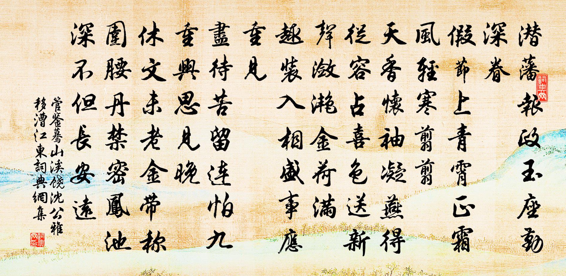 詩詞名句歷史字典書法欣賞書法字典國語詞典說文解字康熙字典古漢語字典標 題 作 者 詩 句 驀山溪(饒沈公雅移漕江東)作者:管鑒 朝代:宋代原文潛藩報政,玉座勤深眷。假節上青霄,正霜風、輕寒翦翦。天香懷袖,凝燕得從容,占喜色,送新聲,瀲灩金荷滿。趣裝入相,盛事應重見。盡待苦留連,怕九重、興思見晚。休文未老,金帶稱圍腰,丹禁密,鳳池深,不但長安遠。詩詞問答問:《驀山溪(饒沈公雅移漕江東)》的作者是誰?答:管鑒問:該詩寫於哪個朝代?答:宋代問:該詩是什麼體裁?答:詞書法欣賞驀山溪(饒沈公雅移漕江東)書法作品詩詞推薦踏莎行何夢桂〔宋代〕夜月樓台,夕陽庭院。都將前事思量遍。當初識面待尋常,爭知識後情如線。只怕梅梢,參橫斗轉。催人歸去天涯次韻程以忠同飲方回〔宋代〕風雲變化世常有,丘壑盤旋誰與同。駕馭孟嘉真得勢,滑稽方朔浪言工。律嚴詩友何妨少,租薄秋田亦幸豐。兩手辭眾偈釋師體〔宋代〕鐵樹開花,雄雞開生。七十二年,搖籃繩斷。寒碧亭何耕〔宋代〕憑欄日日俯清湍,洗竹年年斬惡竿。十頃玻璃秋色靜,一林竿籟曉聲寒。涼風有意生天末,明月無邊照水端。誰謂好事近朱敦儒〔宋代〕回首出紅塵,醒醉更無時節。活計綠蓑青笠,慣批霜沖雪。晚來風定釣絲閒,上下是新月。千里水天一色,看孤鴻水龍吟(雨詞)趙長卿〔宋代〕淡煙輕靄濛濛,望中乍歇凝晴晝。才驚一霎催花,還又隨風過了。清帶梨梢,暈含桃臉,添春多少。向海棠點點,句鄭獬〔宋代〕長亭搔首晚悠悠。挽孫大監二首陳著〔宋代〕憶昨叩溪扃,承聞病莫迎。雲山成永訣,膠漆感平生。紼送老無力,薤歌遙寄聲。何須聞宿草,未死有餘情。董奉山陳師韓〔宋代〕院宇蕭蕭鎖暮煙,昔人曾見此升仙。靜看今日流渠水,應是當年煉藥泉。座上山川疑改舊,林中僧行盡長年。我來陪樞密諸丈游赤松迫於還城阻為寶峰之集情見林季仲〔宋代〕村迥雲連屋,溪晴水繞畦。半生嗟薄宦,隨處愜幽棲。散策尋遺蹟,披塵識舊題。夕陽催上馬,不到寶峰西。相和歌辭前苦寒行二首杜甫〔唐代〕漢時長安雪一丈,牛馬毛寒縮如蝟。楚江巫峽冰入懷,虎豹哀號又堪記。秦城老翁荊揚客,慣習炎蒸歲絺綌。玄冥後九首劉克莊〔宋代〕夜眠便甘菊枕,晨起避凌霄露。信爾雅幾委頓,注本草不宜誤。農家陸游〔宋代〕大布縫袍穩,乾薪起火紅。薄才施畎畝,樸學教兒童。羊要高為棧,雞當細織籠。農家自堪樂,不是傲王公。謝答吳侍郎惠茶二絕句宋庠〔宋代〕貢焙僧岩各有名,手封奇品更丁寧。衰瓮劇飲雖無分,且喜雲腴伴獨醒。送朱南山開蜀閫柴望〔宋代〕殿上傳宣內引官,一封歷歷奏忠肝。八千里路先聲至,百萬都人夾道觀。節度晉公先授鉞,淮陰韓信舊登壇。擎天謝師恩王處一〔元代〕謝師提挈沉淪外。生死難交代。不墮輪迴超法界。諸天運度,化生無相,一點圓明在。盪搖浮世常安泰。閒把瓊芝上元雨陸游〔宋代〕城中酒壚千百所,不憂不售惟憂雨。今年上元燈滿城,曲巷深坊鬧歌舞。天公不借一日晴,風吹燈死雨如傾。家家鎮越堂辭洪咨夔〔宋代〕氣佳哉兮郁蔥,文五色兮虎龍,江胥杵沙為馳道兮,海若斂潮其下風。前羲舒而後翳霳兮,軫獵來自東。孕泰和兮送才元守廣軍歸成都覲省司馬光〔宋代〕皂蓋五驊騮,今來異昔游。簞壺交里舍,饒吹下瀛洲。壽酒行當舉,歸鞭不可留。春光久相待,先在錦江頭。次劉曉窗九日韻十首楊公遠〔宋代〕籬下寒花色自妍,折來泛酒更新鮮。化工底事寧多巧,鑄出黃金滿地錢。名句推薦審知四度,可以定天下,可安一國。佚名《黃帝四經·經法·四度》 一寸相思一寸灰。蘇軾《南鄉子·集句》 草綠裙腰山染黛,閒恨閒愁儂不解文廷式《天仙子·草綠裙腰山染黛》 鳥雀不知郊野好,穿花翻戀小庭中。高珩《春日雜詠》 我住長江頭,君住長江尾。李之儀《卜運算元·我住長江頭》 更無花態度,全有雪精神。辛棄疾《臨江仙·探梅》 明月淨松林,千峰同一色。歐陽修《自菩提步月歸廣化寺》 我醉君復樂,陶然共忘機。李白《下終南山過斛斯山人宿置酒》 傷人一語,利如刀割。佚名《增廣賢文·上集》 況復煩促倦,激烈思時康。杜甫《夏夜嘆》