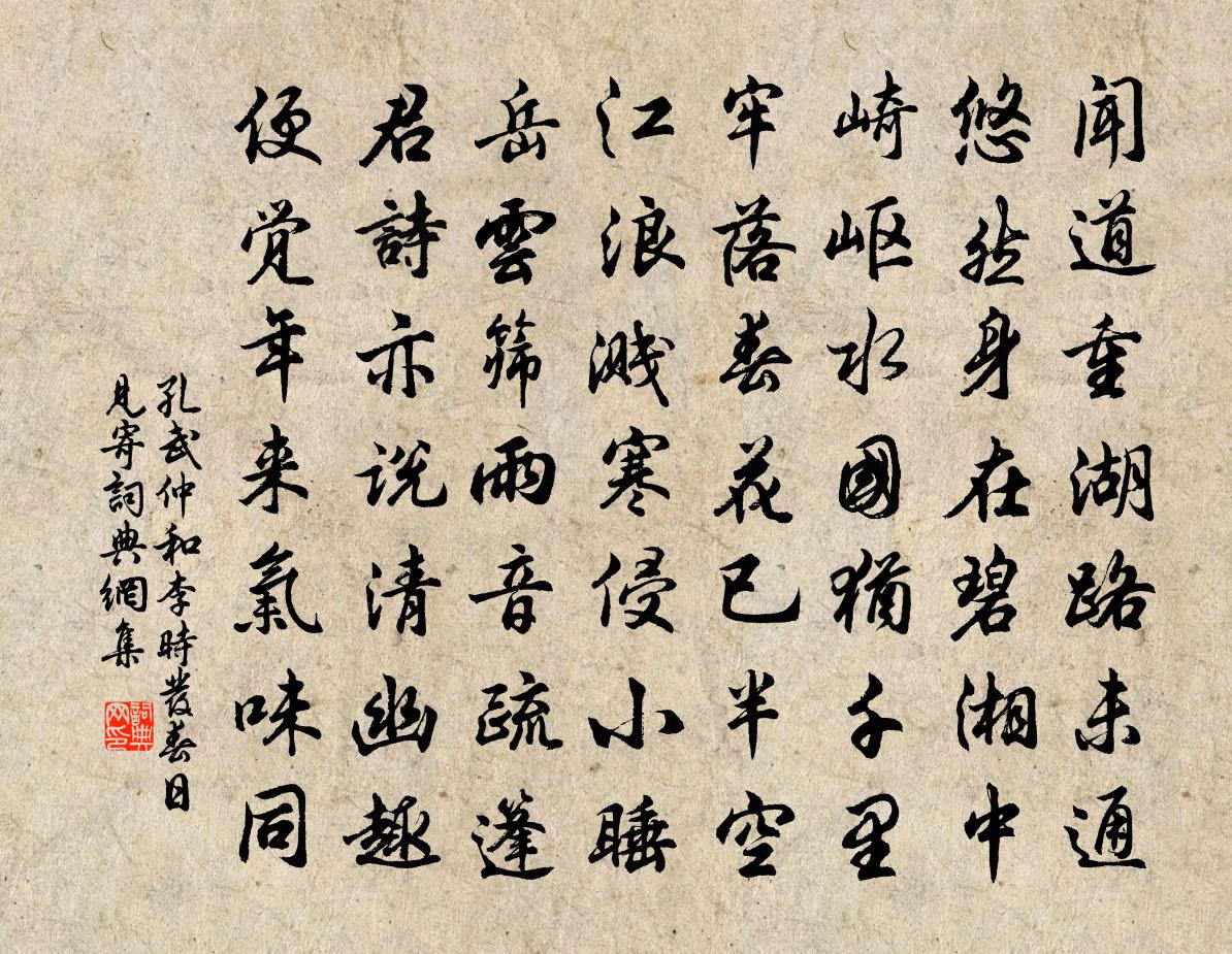 詩詞名句歷史字典書法欣賞書法字典國語詞典說文解字康熙字典古漢語字典標 題 作 者 詩 句 和李時發春日見寄作者:孔武仲 朝代:宋代和李時發春日見寄原文聞道重湖路未通,悠然身在碧湘中。崎嶇水國猶千里,牢落春花已半空。江浪濺寒侵小睡,岳雲篩雨音疏篷。君詩亦說清幽趣,便覺年來氣味同。詩詞問答問:和李時發春日見寄的作者是誰?答:孔武仲問:和李時發春日見寄寫於哪個朝代?答:宋代孔武仲和李時發春日見寄書法欣賞和李時發春日見寄書法作品詩詞推薦石頭城李群玉〔唐代〕伯業隨流水,寒蕪上古城。長空橫海色,斷岸落潮聲。八極悲扶拄,五湖來止傾。東南天子氣,掃地入函京。築室劉子翬〔宋代〕旋剪荊榛出舊蹊,架岩鑿壁啟幽棲。已通鄰圃盡栽竹,更搭飛橋南過溪。蓮社昔夸廬阜勝,漁舟空向武陵迷。宦遊旅次洛城東水亭孟郊〔唐代〕水竹色相洗,碧花動軒楹。自然逍遙風,蕩滌浮競情。霜落葉聲燥,景寒人語清。我來招隱亭,衣上塵暫輕。秋日夔府詠懷奉寄鄭監李賓客一百韻杜甫〔唐代〕絕塞烏蠻北,孤城白帝邊。飄零仍百里,消渴已三年。雄劍鳴開匣,群書滿繫船。亂離心不展,衰謝日蕭然。筋力書懷釋智圓〔宋代〕一錫任西東,孤懷孰與同。吟髭潛變白,人事旋成空。秋閣閒看月,寒窗臥聽鴻。時將寂寥意,深夜寄絲桐。出遊歸臥得雜詩陸游〔宋代〕晚交數子多才傑,誰肯頻來寂寞鄉?但寄好詩三四幅,絕勝共笑億千場。頌古一百首釋智愚〔宋代〕塞北煙塵終載靜,江南花木四時榮。不須特地分疆界,萬里山河似掌平。延平粹廳十詠逍遙閣陳宓〔宋代〕山水有餘靜,都忘城市囂。朱黝本自省,時焉此逍遙。田家即事儲光羲〔唐代〕蒲葉日已長,杏花日已滋。老農要看此,貴不違天時。迎晨起飯牛,雙駕耕東菑。蚯蚓土中出,田烏隨我飛。群合春社日祀事既畢轎中得三絕魏了翁〔宋代〕陰霧冥濛慢鼓鼙,田坡勃窣誤輪蹄。居人閉戶未忺起,太守車前一尺泥。廢宮釋永頤〔宋代〕渺渺笙歌散石筵,霓旌吹斷綱蛛懸。經年不鎖青鸞殿,野鶴飛來玉幾前。水仙蘭洪咨夔〔宋代〕水仙瀟灑伴梅寒,鴻雁行中合數蘭。七里香花陪隸耳,涪翁醉眼被粗瞞。秋日登越王樓獻於中丞李渥〔唐代〕越王曾牧劍南州,因向城隅建此樓。橫玉遠開千嶠雪,暗雷下聽一江流。畫檐先弄朝陽色,朱檻低臨眾木秋。徒學醜奴兒(慶鄧彥鱗生子)廖行之〔宋代〕一春底事多佳氣,非霧非雲。鬱郁氳氳。端為君家誕阿興。慶源袞袞由高密,福有多根。百子千孫。此是元侯嫡耳送樂職方知泗州梅堯臣〔宋代〕長堤凍柳不堪折,窮臘使君單騎行。蘇合輕裘霜莫犯,銅牙大弩吏先迎。山旁楚賈連檣泊,水上禹書寒磬清。試向蕉葉徐夤〔唐代〕綠綺新裁織女機,擺風搖日影離披。只應青帝行春罷,閒倚東牆卓翠旗。出火祀大辰十二首佚名〔宋代〕維莫之春,五陽發舒。日之夕矣,三星在隅。莫量匪幣,莫嘉匪玉。明薦孔明,神光下矚。紀興高質齋〔宋代〕湖上人家萬木村,白雲深護讀書門。年來不管頭顱白,自賀清風酒一樽。偈頌八十七首釋慧開〔宋代〕威鎮戎夷,掃清魔孽。群歸敬,忠心如鐵。破蔡滅金,守黃勦賊。雪百年二帝人雪之恥,成中興四將未成之業。用韻贈傅學士兼述懷思古洪皓〔宋代〕新計警策速如神,又見關中出舜民。正是稠雲方積雪,俄蒙摛藻便為春。蜂擁鶴膝音雖婉,金埒銅山句未貧。故將名句推薦愛人者必見愛也,而惡人者必見惡也。墨子《墨子·16章 兼愛(下)》 佳期大堤下,淚向南雲滿李白《大堤曲》 還怕掩、深院梨花,又作故人清淚。吳文英《無悶·催雪》 最愛東山晴後雪,軟紅光里涌銀山。楊萬里《最愛東山晴後雪》 軍合力不齊,躊躇而雁行。曹操《蒿里行》 孰知不向邊庭苦,縱死猶聞俠骨香。王維《少年行四首》 孤村芳草遠,斜日杏花飛。寇準《江南春·波渺渺》 笑漸不聞聲漸悄,多情卻被無情惱。蘇軾《蝶戀花·春景》 長安大雪天,鳥雀難相覓。張孜《雪詩》 平岡細草鳴黃犢,斜日寒林點暮鴉。辛棄疾《鷓鴣天·陌上柔桑破嫩芽》