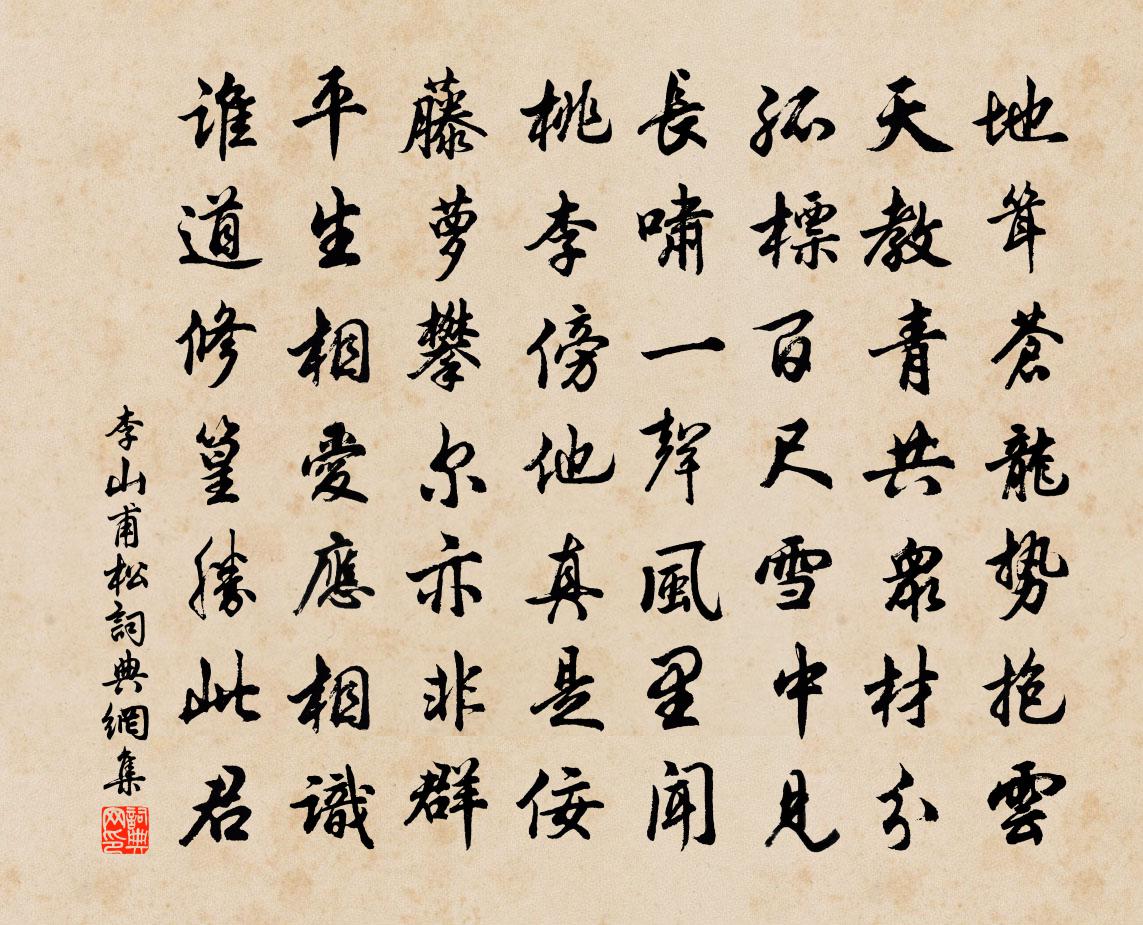 詩詞名句歷史字典書法欣賞書法字典國語詞典說文解字康熙字典古漢語字典標 題 作 者 詩 句 松作者:李山甫 朝代:唐代松原文地聳蒼龍勢抱雲,天教青共眾材分。孤標百尺雪中見,長嘯一聲風裡聞。桃李傍他真是佞,藤蘿攀爾亦非群。平生相愛應相識,誰道修篁勝此君。詩詞問答問:松的作者是誰?答:李山甫問:松寫於哪個朝代?答:唐代問:松是什麼體裁?答:七律李山甫松書法欣賞松書法作品注釋全唐詩:卷643-5詩詞推薦別擬太上皇帝輓歌詞六首范成大〔宋代〕身濟投艱業,時乘撥亂機。荊榛荒帳殿,風雨頮戎衣。有日臨黃道,無星彗紫微。至今淮海上,猶詠六龍飛。言懷仇遠〔宋代〕辛苦移家向溧州,微官只為斗升謀。尋思終是西湖好,且與山僧野老游。照水梅楊公遠〔宋代〕梢橫鶴膝小池東,幾點疎花冷淡中。自是藍妝勻未了,故抬粉面對青銅。減字木蘭花佚名〔宋代〕祥呈香褓。嘗記翁生當己卯。福祿俱添。綠鬢紅顏七十三。芝蘭滿砌。爭著彩衣堂下戲。祝壽無涯。王母襟期醉九兩同心·巍巍劍外杜安世〔宋代〕巍巍劍外,寒霜覆林枝。望衰柳、尚色依依。暮天靜、雁陣高飛。入碧雲際。江山秋色,遣客心悲。蜀道ε嶮行遲彭蠡阻風寄城中故人張弋〔宋代〕欲行行未得,略日滯孤舟。月照山皆近,風吹水倒流。地名人不識,秋景客相愁。憶你惟成夢,遙知獨倚樓。滿江紅(己未四月九日會四明窗)吳潛〔宋代〕飣餖殘花,也隨分、紅紅白白。緣底事,春才好處,又成輕別。芳草淒迷歸路遠,子規更叫黃昏月。倚闌乾、觸處襄陽公宅飲孟浩然〔唐代〕窈窕夕陽佳,丰茸春色好。欲覓淹留處,無過狹斜道。②綺席捲龍鬚,香杯浮瑪瑙。③北林積修樹,南池生別島。和楊鐵庵送子監鎮之任韻五首姚勉〔宋代〕文章世家難,有子夫何憂。吾亦有青氈,未作菟裘謀。駑鞭不及驥,汗喘徒呀齁。願隨君後塵,擊楫江中流。梁王坐上賦無雲雨杜荀鶴〔唐代〕荀鶴初謁朱全忠,雨作而天無行雲,全忠曰:“此謂天泣,知何祥?請作無雲雨詩。”荀鶴乃賦云云,全忠悅。同讀丐辭不允詔書感而有作吳芾〔宋代〕齒豁頭童已暮年,未容歸去亦堪憐。只思舊隱如元亮,寧有新詩似惠連。萬事此生渾已矣,一尊今日且陶然。宦情虞美人賀鑄〔宋代〕粉娥齊斂千金笑。愁結眉峰小。渭城才唱浥輕塵。無奈兩行紅淚、濕香巾。傷心風月南城道。幾縱朱轓到。明年載和黃教授山堂招飲呂聲之〔宋代〕鼎彝事業未渠休,鷗鷺尋盟暫與儔。路入芝岩真絕地,客延蓬島盡名流。不辭一洗陶巾醉,更擬雙飛謝屐游。誰賞人日出遊湖上十首楊萬里〔宋代〕去時數點雨,歸時數片雪。雨雪兩不多,山路雙清絕。少年游歐陽修〔宋代〕綠雲雙嚲插金翹。年紀正妖饒。漢妃束素,小蠻垂柳,都占洛城腰。錦屏春過衣初減,香雪暖凝消。試問當筵眼波從制垣觀閱和韻李曾伯〔宋代〕春風小試被廬蒐。抵掌功名一戰收。萬里關河走孤兔,五更笳鼓肅貔貅。星馳列騎看騰躍,雲合嘉賓樂獻酬。機會頌古二十四首釋勝〔宋代〕心佛物兮俱不是,坐斷舌頭除藥忌。橫拈倒用總由他,活捉魔群穿卻鼻。夜張耒〔宋代〕斗柄闌珊風瑟瑟,銀河錯落露森森。人聲靜後幽蟲急,月色好晴清夜深。倦吟宋伯仁〔宋代〕競病推敲欲嘔心,何如危坐拆桐陰。新蟬咽咽如人意,學我年來抱膝吟。偈頌七十八首釋正覺〔宋代〕不可以色見,不可以聲求。風定花猶落,鳥啼山更幽。四衢明自曉,六戶冷如秋。再坐不疑處,杯中弓影浮。名句推薦滿衣血淚與塵埃,亂後還鄉亦可哀。高啟《送陳秀才還沙上省墓》 白露橫江,水光接天。蘇軾《前赤壁賦》 離恨遠縈楊柳,夢魂長繞梨花。劉迎《烏夜啼·離恨遠縈楊柳》 行人莫問當年事,故國東來渭水流。許渾《鹹陽城東樓 / 鹹陽城西樓晚眺 / 西門》 花影不離身左右,鳥聲只在耳東西。曹雪芹《紅樓夢·第二十八回》 漠漠黃雲,濕透木棉裘。蔣捷《梅花引·荊溪阻雪》 知是人家花落盡,菜畦今日蝶來多。高啟《春暮西園》 賢者在位,能者在職。孟子《孟子·公孫丑章句上·第四節》 城上風光鶯語亂,城下煙波春拍岸。錢惟演《木蘭花·城上風光鶯語亂》 欲窮千里目,更上一層樓。王之渙《登鸛雀樓》