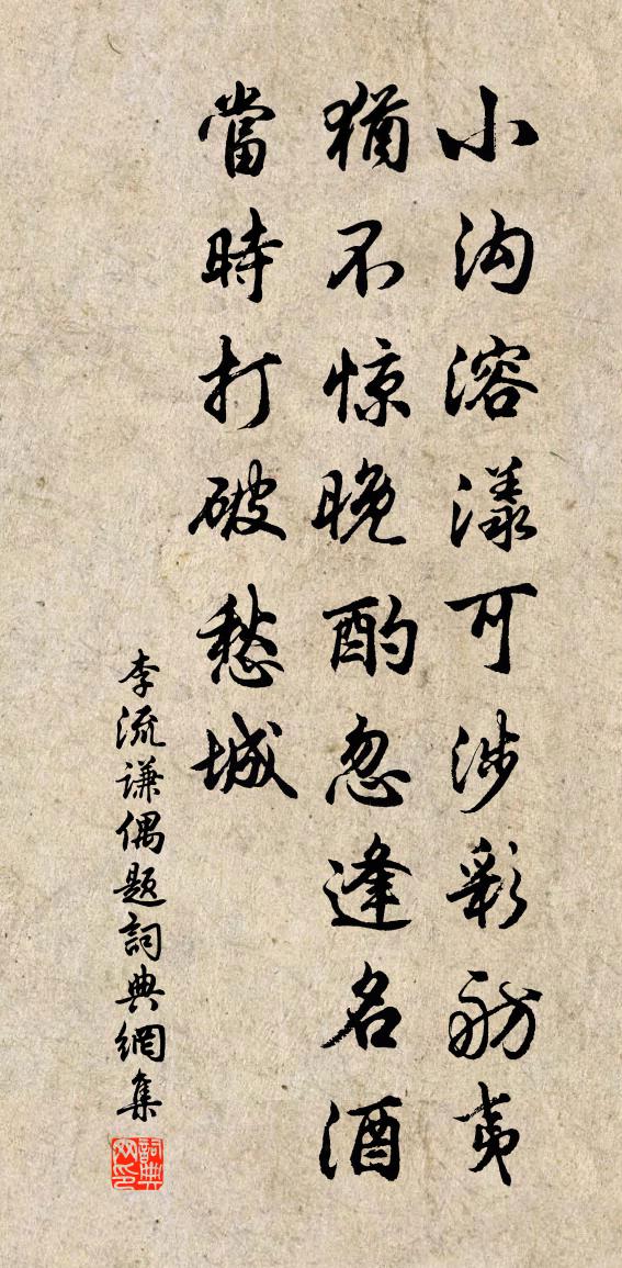詩詞名句歷史字典書法欣賞書法字典國語詞典說文解字康熙字典古漢語字典標 題 作 者 詩 句 偶題作者:李流謙 朝代:宋代偶題原文小溝溶漾可涉,彩舫夷猶不驚。晚酌忽逢名酒,當時打破愁城。詩詞問答問:偶題的作者是誰?答:李流謙問:偶題寫於哪個朝代?答:宋代李流謙偶題書法欣賞偶題書法作品詩詞推薦鄱陽湖四十韻周弼〔宋代〕巨浸連吳越,高躔直鬥牛。玄明開別府,江伯匯支流。象緯元精逼,神奸秘怪裒。番君疏帶礪,彭蠡壯襟喉。赴隙玩殘花楊發〔唐代〕十日濃芳一歲程,東風初急眼偏明。低枝似泥幽人醉,莫道無情似有情。過噴玉泉趙嘏〔唐代〕平生半為山淹留,馬上欲去還回頭。兩京塵路一雙鬢,不見玉泉千萬秋。憶秦娥仇遠〔宋代〕秋乍覺。露涼頓覺羅衾薄。羅衾薄。黃昏庭院,水風簾幕。闌乾待月花時約。愁長夢短渾忘卻。渾忘卻。南山猿鶴寄黃尊師韋應物〔唐代〕結茅種杏在雲端,掃雪焚香宿石壇。靈祇不許世人到,忽作雷風登嶺難。鄉人或病予詩多道蜀中遨樂之盛適春日游鏡湖陸游〔宋代〕嫩日輕雲淡沱天,撲燈過後賣花前。便從水閣杭湖去,捲起朱簾上畫船。次韻和蔚師鑒師春懷戴表元〔宋代〕愁是雲陰喜是晴,春遊保處不關情。黃雞亭館琴三弄,青果杯盤酒數行。滿砌雨新平筍密,隔牆風送落花輕。鑑湖思越人張泌〔唐代〕燕雙飛,鶯百轉,越波堤下長橋。斗鈿花筐金匣恰,舞衣羅薄纖腰。東風澹蕩慵無力,黛眉愁聚春碧。滿地落花無十月旦讀子美北風吹瘴癘羸老思散策之句初寮朱翌〔宋代〕戰休左觸氏,夢破大槐國。肝膽方一家,燕越非異域。是中路坦平,本自無降陟。乾坤有乾坤,無極復無極。海角張灃州輓詩項安世〔宋代〕持橐中朝貴,餐氈異域留。人皆敬先德,我已識君侯。氣節傅三世,才猷著兩州。承家五男子,身後更何求。江行黎廷瑞〔宋代〕卷縴崖形斷,開帆浦意孤。長天低去鳥,落日蘸平湖。渺渺千年夢,悠悠萬化途。倚篷成晤嘆,漁唱在菰蒲。和范景仁王景彝殿中雜題三十八首並次韻其八梅堯臣〔宋代〕前殿臨朝百辟回,後宮廷閣九重開。鳴梢已自金階出,黃屋初迎玉輦來。不問偷桃方朔飽,誰知載戟子云才。群官灞陵亭高蟾〔唐代〕一條歸夢朱弦直,一片離心白羽輕。明日灞陵新霽後,馬頭煙樹綠相迎。梅花喜神譜爛熳二十八枝宋伯仁〔宋代〕赤壁夢醒時,雨灑玄裳濕。聲欲聞於天,故向松梢立。對鏡劉兼〔唐代〕青鏡重磨照白須,白須撚閒意何如。故園迢遞千山外,荒郡淹留四載余。風送竹聲侵枕簟,月移花影過庭除。秋霜晨興書所見葛紹體〔宋代〕等閒日月任西東,不管霜風著鬢蓬。滿地翻黃銀杏葉,忽驚天地告成功。送李益之侍郎致政歸廬山司馬光〔宋代〕水底元無月,衣中自有珠。六塵皆外物,萬法盡迷塗。瀑布寒雲濕,觚稜瑞氣扶。遙知至樂地,不異在京都。靜中好晃逈〔宋代〕靜中好,冥心歸宴寂。齋己不虛吟,靜是真訊息。讀《開元天寶遺事》三首蘇軾〔宋代〕姚宋亡來事事生,一官銖重萬人輕。朔方老將風流在,不取西蕃石堡城。六和塔訪陳右司連文鳳〔宋代〕空山林落欲何歸,渺渺黃塵污客衣。自嘆馮唐今已老,世無劉表孰堪依。爐中丹炎工夫淺,籬下文章氣燄微。幸識名句推薦明月照高樓,流光正徘徊。曹植《七哀》 不虛美,不隱惡司馬光《資治通鑑·唐紀·唐紀十三》 正是江南好風景,落花時節又逢君。杜甫《江南逢李龜年》 平沙芳草渡頭村。綠遍去年痕。洪咨夔《眼兒媚·平沙芳草渡頭村》 憶共錦衾無半縫,郎似桐花,妾似桐花鳳。王士禎《蝶戀花·和漱玉詞》 若待明朝風雨過,人在天涯!春在天涯。虞集《南鄉一剪梅·招熊少府》 今士之用身,不若商人之用一布之慎也。墨子《墨子·47章 貴義》 逕直夫何細!橋危可免扶?楊萬里《寒食上冢》 柳外輕雷池上雨,雨聲滴碎荷聲。小樓西角斷虹明。歐陽修《臨江仙·柳外輕雷池上雨》 淚眼問花花不語,亂紅飛過鞦韆去。歐陽修《蝶戀花·庭院深深深幾許》