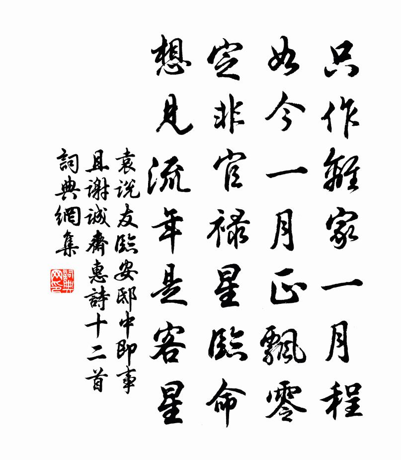 詩詞名句歷史字典書法欣賞書法字典國語詞典說文解字康熙字典古漢語字典標 題 作 者 詩 句 臨安邸中即事且謝誠齋惠詩十二首作者:袁說友 朝代:宋代原文只作離家一月程,如今一月正飄零。定非官祿星臨命,想見流年是客星。詩詞問答問:《臨安邸中即事且謝誠齋惠詩十二首》的作者是誰?答:袁說友問:該詩寫於哪個朝代?答:宋代書法欣賞臨安邸中即事且謝誠齋惠詩十二首書法作品詩詞推薦滿江紅李嬰〔宋代〕荊楚風煙,寂寞近、中秋時候。露下冷、蘭英將謝,葦花初秀。歸燕殷勤辭巷陌,鳴蛩淒楚來窗牖。又誰念、江邊同官游赤松二首姜特立〔宋代〕山輿翠蓋出華顛,白氈衣衫皂作緣。我輩自應三洞主,傍人喚作五通仙。送楊道士歸蔡州王銍〔宋代〕列子風回馭,林宗雨墊巾。花明千嶂晚,雲暖一山春。爐灶聊隨俗,簪裾未稱貧。壺公觀中路,聞道接天津。和微之聽妻彈別鶴操因為解釋其義依韻加四句白居易〔唐代〕義重莫若妻,生離不如死。誓將死同穴,其奈生無子。商陵迫禮教,婦出不能止。舅姑明旦辭,夫妻中夜起。起聞次韻重令升四詠競秀亭朱翌〔宋代〕山 * 士頃留宮,應接煙雲馬不前。君說江南亦如此,我雖未到想當然。客淮南病盧仝〔唐代〕揚州蒸毒似燂湯,客病清枯鬢欲霜。且喜閉門無俗物,四肢安穩一張床。聽杜將軍帳下兒歌仇遠〔宋代〕鞾尖蹴城城未頹,馬箠填河河未瞞。十歲健兒下馬行,兩足胡為自長短。奉和聖制幸韋嗣立莊應制蘇頲〔唐代〕樹色參差隱翠微,泉流百尺向空飛。傳聞此處投竿住,遂使茲辰扈蹕歸。秋閨月權德輿〔唐代〕三五二八月如練,海上天涯應共見。不知何處玉樓前,乍入深閨玳瑁筵。露濃香徑和愁坐,風動羅幃照獨眠。初卷攝相石介〔宋代〕惜無百里地封君,攝相區區道屢伸。少正將身膏斧刃,侏儒流血汙車輪。方令魯國知王法,自此齊侯畏聖人。昔放懷張唐公王安石〔宋代〕直諒多為世所排,有懷長向我前開。暮年惆悵誰知此,南陌東阡獨往來。月上海棠佚名〔宋代〕南枝昨夜先回暖。便臨寒、開花暗香遠。化工忒,把瓊瑤、恣情裁翦。皚皚的、點綴梢頭又遍。橫斜影蘸清溪淺十二月六日大雪曾幾〔宋代〕薄晚蓬山下直餘,笑看六出點衣裾。絮飛簾外無縈絆,花落階前不掃除。松鬣垂身全類我,竹頭搶地最憐渠。短檠書驛壁陸游〔宋代〕猿叫舖前雪欲作,鬼門關頭路正惡。泥深三尺馬蹄弱,霜厚一寸客衣薄。朝行過棧暮渡笮,夜投破驛火煜爚。人生江館野望陳允平〔宋代〕江邊雁過秋,江上暮雲愁。嶺曲山橫轉,潮回水逆流。亂莎行石蟹,殘荻臥沙鷗。黯淡三更月,何人獨倚樓。勸學詩顏真卿〔唐代〕三更燈火五更雞,正是男兒讀書時。黑髮不知勤學早,白首方悔讀書遲。司馬宅白居易〔唐代〕雨徑綠蕪合,霜園紅葉多。蕭條司馬宅,門巷無人過。唯對大江水,秋風朝夕波。王昭君徐鈞〔宋代〕畫工雖巧豈堪憑,妍醜何如一見真。自是君王先錯計,愛將耳目寄他人。贈數學蕭吉卿方回〔宋代〕蓍草占周易,君從簡處尋。運籌見奇偶,落筆判升沉。總悟生時數,誰萌分外心。吾衰今七十,惟有死山林。生查子陸游〔宋代〕還山荷主恩,聊試扶犁手。新結小茅茨,恰占清江口。風塵不化衣,鄰曲常持酒。那似宦遊時,折盡長亭柳。名句推薦有過必悛,有不善必懼左丘明《國語·楚語·藍尹亹論吳將斃》 卻恨悲風時起,冉冉雲間新雁,邊馬怨胡笳。葉夢得《水調歌頭·秋色漸將晚》 舊時王謝堂前燕,飛入尋常百姓家。劉禹錫《烏衣巷》 強中更有強中手,莫向人前滿自誇。馮夢龍《警世通言·卷三》 軍歌應唱大刀環,誓滅胡奴出玉關。徐錫麟《出塞》 君子之學進於道,小人之學進於利。王通《中說·卷二·天地篇》 觀今宜鑑古,無古不成今。佚名《增廣賢文·上集》 羌笛何須怨楊柳,春風不度玉門關。王之渙《涼州詞二首·其一》 別離在今晨,見爾當何秋。韋應物《送楊氏女》 君子以遏惡揚善,順天休命。佚名《易傳·象傳上·大有》