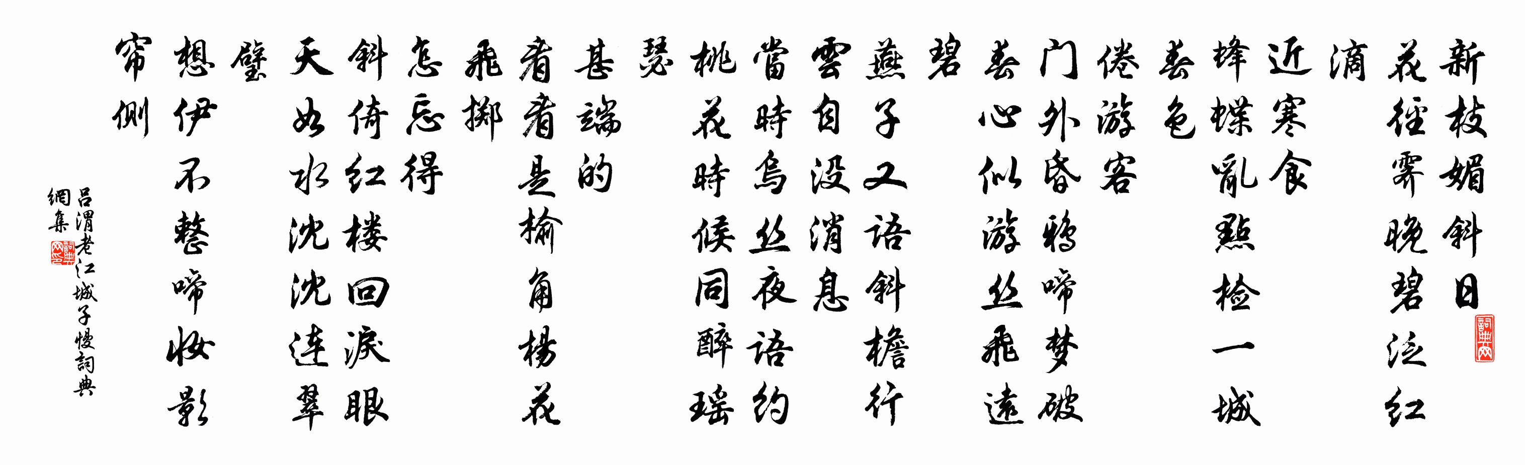 新枝媚斜日。花徑霽、晚碧泛紅滴。