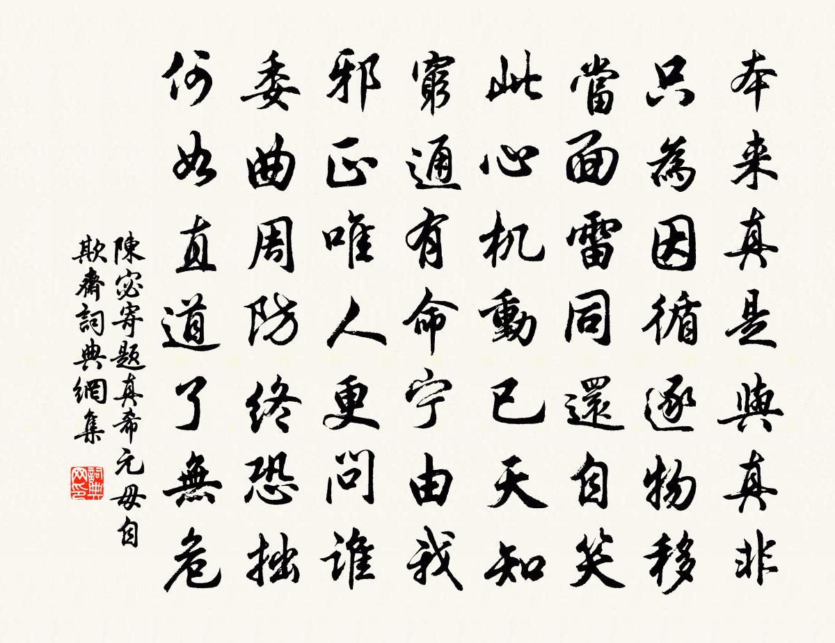 詩詞名句歷史字典書法欣賞書法字典國語詞典說文解字康熙字典古漢語字典標 題 作 者 詩 句 寄題真希元毋自欺齋作者:陳宓 朝代:宋代寄題真希元毋自欺齋原文本來真是與真非,只為因循逐物移。當面雷同還自笑,此心機動已天知。窮通有命寧由我,邪正唯人更問誰。委曲周防終恐拙,何如直道了無危。詩詞問答問:寄題真希元毋自欺齋的作者是誰?答:陳宓問:寄題真希元毋自欺齋寫於哪個朝代?答:宋代陳宓寄題真希元毋自欺齋書法欣賞寄題真希元毋自欺齋書法作品詩詞推薦長樂台曹穎叔〔宋代〕藍挼水谷與秋輝,疑作危棱磴翠微。向晚山僧苦留我,層層寒牖亂雲歸。題方乾舊隱楊翱〔宋代〕雲山旦暮奇,築隱世希續。脫略浮官心,蟬聯先祖躅。門橫嚴子瀨,壁紀桐君籙。應笑泛輕舠,日為官牒束。踏雪尋梅王鎡〔宋代〕探春繞遍玉闌乾,香暗冰痕屐齒寒。怕有花頭遭凍損,枝枝呵手掐來看。送宋鈞秀才落第還鄉韓維〔宋代〕漆雕不肯仕,仲尼悅其然。乃知君子學,躁進非所先。去聖邈千載,茲風復誰傳。趨營不自反,廉恥一以捐。愛君寮前老郎請贊釋普度〔宋代〕心直如弦,性急似箭。翻手覆手,日面月面。零敲碎打破沙盆,我見人見眾生見壽者見。襲美醉中寄一壺並一絕,走筆次韻奉酬陸龜蒙〔唐代〕酒痕衣上雜莓苔,猶憶紅螺一兩杯。正被繞籬荒菊笑,日斜還有白衣來。古樂府用禮禪滅翁韻四鳳引雛洪咨夔〔宋代〕桐春華,竹秋霏,蒼梧雲深人未歸。烏 * 子恣飛啄,夜半飽啼山月落。鸑鷟引孤雛,腸空羽毛薄。為言增擊勿作和孫升之陳與義〔宋代〕姬國余芳代有人,於今公子秀溪濆。處心如水尚書市,能賦臨流靖節君。花島紅雲春句麗,月梅疏影夜香聞。囊開沁園春(次方時父)趙以夫〔宋代〕自笑生來,骨相無奇,壬三甲三。覺紫宸班裡,都忘故步,維摩室內,添個新參。壯也不如,老之將至,今日將軍題羅溪李店二首楊萬里〔宋代〕誰道村郊野味侵,柴扉竹榻草花清。行行且止成佳夢,不減崔張驚夢身。春日雜詠九首李彌遜〔宋代〕軒冕真成寄,江山早見招。懶從春後覺,意別枕邊消。竹色侵書靜,松聲落耳遙。妄心朝霧薄,烏鵲莫相撩。題范蠡五湖圖李曾伯〔宋代〕江湖存魏闕,翰墨寓規箴。君看龍眠畫,當識鴟夷心。郡中上元燈減舊例三之二而又迎送使客七首楊萬里〔宋代〕雪後樓台欲暮時,遊人只道上燈遲。月輪貼在梅花背,錯認梅枝作桂枝。清江引馬致遠〔元代〕西村日長人事少,一個新蟬噪。恰待葵花開,又早蜂兒鬧,高枕上夢隨蝶去了。對食戲詠陸游〔宋代〕癭榼傾桑落,毫杯點雨前。冰梨赬似頰,霜栗大如拳。洗釜烹蔬甲,攜鉏斸荀鞭。餘年只此是,切勿念腥膻。夜雨不睡鄭清之〔宋代〕浮湛世事付洪喬,欹枕迢迢度永宵。雨細無聲檐溜滴,香殘有爐篆煙鎖。翻盆碩鼠全欺暗,繞鬢飛蚊始作嬌。老去岳陽樓晚眺即事疊韻四首高善濂〔宋代〕危樓縹緲倚闌斜,無數殘陽噪亂鴉。過客揚帆沖雪浪,漁人舉網出銀花。子聲落紙間聽奕,舌本留香為別茶。巫峽南鄰蕭寺丞夜話別梅堯臣〔宋代〕憶昨偶相親,相親如舊友。雖言我巷殊,正住君家後。壁里射燈光,籬根分井口。來邀食有魚,屢過貧無酒。明日句宋祁〔宋代〕磨沙漉水莩穀滑,砍柱煮釜風波聲。漏澤院四絕句陳造〔宋代〕粹公頗似廬山遠,美酒還因我輩沽。想得靜看豪飲罷,一燈彌勒伴跏趺。名句推薦別院深深夏席清,石榴開遍透簾明。蘇舜欽《夏意》 世風之狡詐多端,到底忠厚人顛撲不破王永彬《圍爐夜話·第 * 則》 目不能兩視而明,耳不能兩聽而聰。荀子《荀子·勸學》 漢寢唐陵無麥飯,山溪野徑有梨花。趙鼎《寒食》 連雨不知春去,一晴方覺夏深。范成大《喜晴》 風摧寒棕響,月入霜閨悲。李白《獨不見》 春田龜坼苗不滋,猶賴立春三日雪。王士禎《春不雨》 歲暮遠為客,邊隅還用兵。杜甫《歲暮》 宮中彩女顏如花,飄然揮手凌紫霞,從風縱體登鸞車。李白《飛龍引二首·其一》 鶯花昨夢總飄零,一笏姜山似舊青端木國瑚《姜山秦淮海監酒稅處(鶯花昨夢總飄零)》