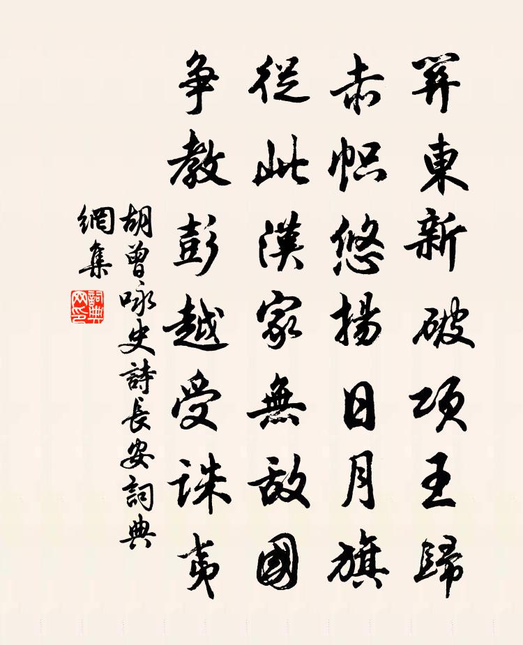 詩詞名句歷史字典書法欣賞書法字典國語詞典說文解字康熙字典古漢語字典標 題 作 者 詩 句 詠史詩長安作者:胡曾 朝代:唐代詠史詩長安原文關東新破項王歸,赤幟悠揚日月旗。從此漢家無敵國,爭教彭越受誅夷。詩詞問答問:詠史詩長安的作者是誰?答:胡曾問:詠史詩長安寫於哪個朝代?答:唐代問:詠史詩長安是什麼體裁?答:七絕胡曾詠史詩長安書法欣賞詠史詩長安書法作品注釋全唐詩:卷647-140詩詞推薦戀繡衾蔣捷〔宋代〕茜金小袖花下行。過橋亭、倚樹聽鶯。被柳線、低縈鬢,紺雲垂、釵鳳半橫。紅薇影轉晴窗晝,漾蘭心、未到繡絣蝶戀花(題愛閣)葛長庚〔宋代〕冷雨疏風涼漠漠。雲去雲來,萬里秋陰薄。笑倚玉闌呼白鶴。煙籠素月青天角。竹影松聲渾似昨。醉膽如天,誰道水次髑髏梅堯臣〔宋代〕不知誰氏子,枯首在沙洲。肉化烏鳶腹,肢殘波浪頭。曾聞南面樂,寧有九原愁。厚葬不為貴,漢官其登丘。和僧房岩桂衛宗武〔宋代〕疊金綴粟映明霞,移下蟾宮一樹花。最好色香俱洗淨,紛紛桂子落袈裟。淮上釋秘演〔宋代〕危橋當古寺,間倚喜同僧。極浦霽秋雨,扁舟明夜燈。風沈人語遠,潮漲月華升。萬事空凝念,其如總未能。奉和同泰寺浮圖詩庾信〔南北朝〕五城鄰北極。百雉壯西崑。鉤陳橫復道。閶闔抵靈軒。千柱蓮花塔。由旬紫紺園。佛影胡人記。經文漢語翻。星窺雜詩李白〔唐代〕白日與明月,晝夜尚不閒。況爾悠悠人,安得久世間。傳聞海水上,乃有蓬萊山。玉樹生綠葉,靈仙每登攀。一食和前韻見寄 其一朱淑真〔宋代〕忽得南來信,殷勤慰我心。新詩憐俊逸,清倫憶俗音。目斷鄉程遠,樓高客恨深。三年重會後,依舊見荊陰。次韻邢敦夫秋懷十首秦觀〔宋代〕驅車陟高丘,郤望大梁圻。馳道入雙闕,勾陳連太微。夷門壯下屬,清洛相因依。美哉吾黨士,皋禼良可希。客自鳳州來言岐雍間事悵然有感陸游〔宋代〕表里山河古帝京,逆胡數盡固當平。千門未報甘泉火,萬耦方觀渭上耕。前日已傳天狗墮,今年寧許佛狸生?會須送賢良陳著作簽書壽州判官司馬光〔宋代〕海隅方萬里,豪俊幾何人。百汰求才盡,三薰得士新。聲華四方聳,器業一朝伸。佗日蒼生望,非徒澤濤春。壬辰七月十六日侵晨真率會,石湖路中書事范成大〔宋代〕白葛烏紗稱老農,溪南溪北水車風。稻頭的皪粘朝露,步入明珠翠綱中。寄題喻叔奇國傅郎中園亭二十六詠水簾楊萬里〔宋代〕秧疇水落荇渠尖,玉石當中碧一奩。石面平鋪波面皺,千花織出水精簾。示王侑翁二首陳著〔宋代〕垂髫已解吟,仿佛學何陰。暗動梅窗喜,遙傳桂種心。染聲毋市井,近拙要山林。耄矣不成句,中閒意自深。八絕詩垂藤蓋王禹偁〔宋代〕古藤何樛蟠,低蔭庶子泉。童童若青蓋,掛在絕壁前。月穿波影碎,露滴岸聲圓。曉籠使君醉,夜覆溪僧禪。昔之游金山寺蔡襄〔宋代〕平日壓塵土,今遊興味長。波濤圍四際,台殿起中央。魚聽晨餐鼓,雲和夕炷香。薰風休遞吹,襟袂不勝涼。玉樓春(至盱眙作)毛滂〔宋代〕長安回首空雲霧。春夢覺來無覓處。冷煙寒雨又黃昏,數盡一堤楊柳樹。楚山照眼青無數。淮口潮生催曉渡。西風菩薩蠻(雪樓賞牡丹席上用楊民瞻韻)辛棄疾〔宋代〕紅牙籤上群仙格。翠羅蓋底傾城色。和雨淚闌乾。沈香亭北看。東風休放去。怕有流鶯訴。試問賞花人。曉妝勻未別盧綸暢當〔唐代〕故交君獨在,又欲與君離。我有新秋淚,非關宋玉悲。江邊送人之衡陽釋文珦〔宋代〕二月江頭送客船,絲絲楊柳散晴煙。生來未識衡陽路,安得相思有夢傳。名句推薦以治氣養生則後彭祖,以修身自名則配堯、禹。宜於時通,利以處窮,禮信是也。荀子《荀子·修身》 從今若許閒乘月,拄杖無時夜叩門。陸游《游山西村》 迴廊一寸相思地,落月成孤倚。納蘭性德《虞美人·銀床淅瀝青梧老》 居移氣,養移體。孟子《孟子·盡心章句上·第三十六節》 穿花蛺蝶深深見,點水蜻蜓款款飛杜甫《曲江二首》 秋菊有佳色,裛露掇其英。陶淵明《飲酒·其四》 此中有真意,欲辨已忘言。陶淵明《飲酒·其五》 為報今年春色好。花光月影宜相照。李清照《蝶戀花·上巳召親族》 居身務期質樸,教子要有義方。朱柏廬《朱子家訓·全文》 日暮長江里,相邀歸渡頭。儲光羲《江南曲四首》