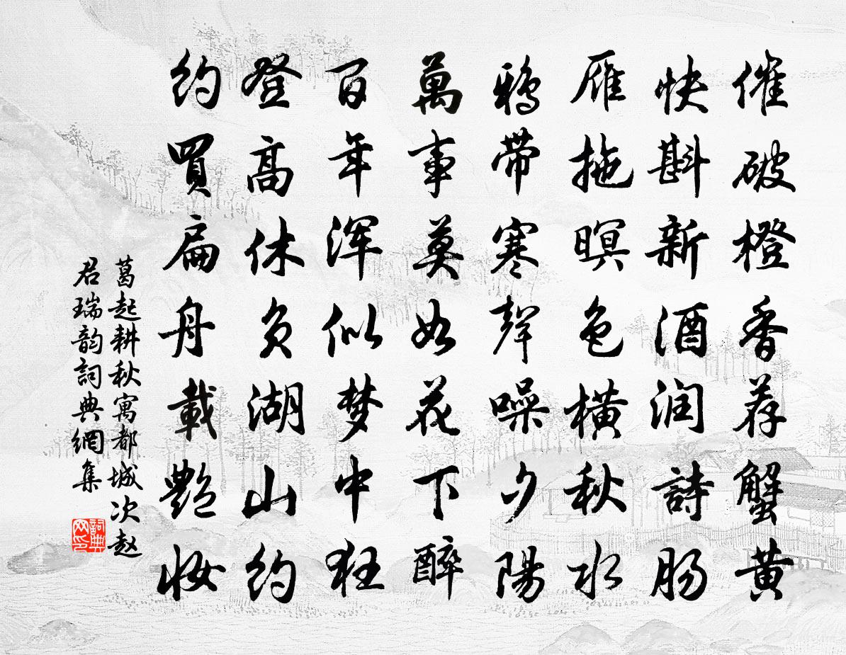 詩詞名句歷史字典書法欣賞書法字典國語詞典說文解字康熙字典古漢語字典標 題 作 者 詩 句 秋寓都城次趙君瑞韻作者:葛起耕 朝代:宋代秋寓都城次趙君瑞韻原文催破橙香薦蟹黃,快斟新酒潤詩腸。雁拖暝色橫秋水,鴉帶寒聲噪夕陽。萬事莫如花下醉,百年渾似夢中狂。登高休負湖山約,約買扁舟載艷妝。詩詞問答問:秋寓都城次趙君瑞韻的作者是誰?答:葛起耕問:秋寓都城次趙君瑞韻寫於哪個朝代?答:宋代葛起耕秋寓都城次趙君瑞韻書法欣賞秋寓都城次趙君瑞韻書法作品詩詞推薦題安成劉伯玉日新亭祖無擇〔宋代〕積善家餘慶,日新亭可雲。詩書盈幾有,道藝喜時聞。兒侄既登學,晨昏在克勤。欲知榮地力,此便是青雲。憶少年(寒食)謝懋〔宋代〕池塘綠遍,王孫芳草,依依斜日。遊絲卷晴晝,系東風無力。蝶趁幽香蜂釀蜜。鞦韆外、臥紅堆碧。心情費消遣,夜船韓偓〔唐代〕野雲低 * 蒼蒼,平波揮目如凝霜。月明船上簾幕卷,露重岸頭花木香。村遠夜深無火燭,江寒坐久換衣裳。誠知偈釋守芝〔宋代〕大愚相接大雄孫,五湖雲水競頭奔。競頭奔,有何門,擊箭寧知枯木存。枯木存,一年還曾兩度春。兩度春,帳里歲寒口占錢時〔宋代〕胸中元自有溪山,更著梅花竹石間。拭目諸公扶帝極,幽人有分一生閒。籠鷹詞柳宗元〔唐代〕淒風淅瀝飛嚴霜,蒼鷹上擊翻曙光。雲披霧裂虹蜺斷,霹靂掣電捎平岡。砉然勁翮翦荊棘,下攫狐兔騰蒼茫。爪毛李與賢來訪,自言所居幽勝,甚似剡溪。因以楊萬里〔宋代〕漫浪江湖天一方,故人不見兩三霜。對床說盡平生話,黃葉聲中秋夜長。短景陸游〔宋代〕短景迫窮冬,日月如鳥過。衡門窘風雨,衰病不可那。疏疏屋茅漏,獵獵窗紙破。鼠豪冒燈出,人倦掩屏臥。中都夜泊陸游〔宋代〕小聚近江乾,中春尚爾寒。釣船隨鷺宿,煙月伴鍾殘。冉冉歲時速,茫茫天地寬。推篷一搔首,無處著悲歡。清平樂毛滂〔宋代〕錦屏夜夜。繡被熏蘭麝。帳卷芙蓉長不下。垂盡銀台蠟灺。臉痕微著流霞。瞢騰越恁穠華。破睡半殘妝粉,月隨雪春日即事九首李廌〔宋代〕藹藹花絮亂,紛紛蜂蝶多。今年春復爾,不飲奈愁何。定風波朱敦儒〔宋代〕紅藥花前欲送春。金鞭柘彈趁芳塵。故傍繡簾挼柳線。恰見。澹梳妝映瘦腰身。閒倚金鋪書悶字。尤殢。為誰憔悴送孫文輔尉新城章甫〔宋代〕我來淮上居,忽忽歲月過。定交誰最久,有唱君必和。棋枰角勝負,文字工切磋。雲山結伴遊,風雨對床臥。那知項羽錢舜選〔宋代〕項羽天資自不仁,那堪亞父作謀臣。鴻門若遂樽前計,又一商君又一秦。時在臨雲寄虎溪侃直山釋行海〔宋代〕白首歸看舊種公,十年相別此相逢。近疎面會因多雨,似隔天涯只一峰。數樹綠煙鋪薜荔,半池紅露泣芙蓉。故鄉早炊新林望見鍾山楊萬里〔宋代〕辭奉鍾山一月前,如何知我北歸軒。不通姓字殷懃甚,忽到新林野店邊。再用韻酬朱制乾憶梅方岳〔宋代〕風挾柳花狂,晴酣海棠睡。玉人山之阿,為爾增嘆喟。春妍老欲仙,敢不一告至。惜哉桃李場,獨醒紛眾醉。賀新郎(甲子端午)劉克莊〔宋代〕過眼光陰駛。憶垂髫、留連節物,逢場遊戲。初試綀衣弄紈扇,斗采菖蒲澗里。今發白、顏蒼如此。艾子蕭郎方用鷗渚亭次韻茂洪西湖三詩張鎡〔宋代〕出城猶記四年前,朝看西湖到暮煙。自有南湖相暖熱,可曾頻過六橋邊。又和南塘十首劉克莊〔宋代〕密疏多不定,來往少曾停。穿幌非陰燐,窺窗若曙星。微能破幽暗,高欲傍青冥。忽起江湖思,微茫隔遠汀。名句推薦脫衣換得商山酒,笑把離騷獨自傾。王禹偁《清明日獨酌》 帳底吹笙香吐麝,更無一點塵隨馬。蘇軾《蝶戀花·密州上元》 城裡夕陽城外雪,相將十里異陰晴。王守仁《次韻陸僉憲元日春晴》 煙橫水際,映帶幾點歸鴉,東風銷盡龍沙雪。賀鑄《石州引·薄雨初寒》 漫江碧透,百舸爭流。 * 《沁園春·長沙》 烽火連三月,家書抵萬金。杜甫《春望》 一夕輕雷落萬絲,霽光浮瓦碧參差。秦觀《春日》 雖有戈矛之刺,不如恭儉之利也。荀子《荀子·榮辱》 海日生殘夜,江春入舊年。王灣《次北固山下》 紅旗捲起農奴戟,黑手高懸霸主鞭。 * 《七律·到韶山》