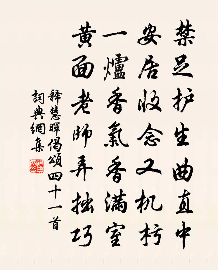 詩詞名句歷史字典書法欣賞書法字典國語詞典說文解字康熙字典古漢語字典標 題 作 者 詩 句 偈頌四十一首作者:釋慧暉 朝代:宋代偈頌四十一首原文禁足護生曲直中,安居收念又機杇。一爐香氣香滿室,黃面老師弄拙巧。詩詞問答問:偈頌四十一首的作者是誰?答:釋慧暉問:偈頌四十一首寫於哪個朝代?答:宋代釋慧暉偈頌四十一首書法欣賞偈頌四十一首書法作品詩詞推薦次韻分生五首陳著〔宋代〕交不緣詩有密疏,詩能宣與此心初。但從禮義中遊戲,便是趨庭孔伯魚。拾遺二首新添寒山〔唐代〕我見世間人,個個爭意氣。一朝忽然死,只得一片地。闊四尺,長丈二。汝若會出來爭意氣,我與汝立碑記。家有和魏衍聞鶯陳師道〔宋代〕春力著人朝睡重,葉底黃鸝鳴自送。綠幕朱欄日觀明,迴廊側戶風簾動。昨夜春回到寒谷,好鳥飛來把修竹。整翰送呂主簿還任永豐方回〔宋代〕吾友陸太初,擢第歲丙辰。同舟下歙灘,群英對楓宸。於時程訥相,中書秉洪鈞。拔我魏靜翁,丞郎廁朝紳。明年送關小師還金陵皎然〔唐代〕如何有歸思,愛別欲忘難。白鷺沙洲晚,青龍水寺寒。蕉花鋪淨地,桂子落空壇。持此心為境,應堪月夜看。讀藝文志徐僑〔宋代〕所存諸子少知名,自古陳編浩莫程。未說合神老成子,誰傳談易杜田生。到頭法文那能廢,終久浮言自不行。只向春遊茅山酬杜評事見寄權德輿〔唐代〕喜得賞心處,春山豈計程。連溪芳草合,半嶺白雲晴。絕澗漱冰碧,仙壇挹顥清。懷君在人境,不共此時情。次韻舍弟遇子固憶少述王安石〔宋代〕歸計何時就一廛,寒城回首意茫然。野林細錯黃金日,溪岸寬圍碧玉天。飛兔已聞追騕褭,太阿猶恨失龍泉。遙知岳忠弄祠三首袁甫〔宋代〕當年老檜肆欺謾,忠武哀哉抱寸丹。賴有皇天為吐氣,豈無青名更診治奸。字留陳跡何年泯,煙鎖空山盡日間。世黃憲生朝三首黃公度〔宋代〕經術賢關望,訏謨帝席前。詞場聲擲地,憲府力回天。金監風流在,炎陬雨露偏。殷勤理歸揖,早覲日華邊。禪人畫師像請贊釋如珙〔宋代〕栽菜根向上,種豆要收谷。不必生疑訝,今年六十六。張公洞蔡中道〔宋代〕天上騾蹤竟不回,洞門深閉密封苔。神光夜燭燒丹灶,淑氣晴薰講易台。瑤草春肥仙去遠,紫芝雲暖鶴歸來。清游偈二首釋道川〔宋代〕東邊覷了復西觀,拄杖重重話歲寒。帶雨一枝花落盡,不煩公子倚欄乾。玉樓春(三月三日雨夜觴客)毛滂〔宋代〕一春花事今宵了。點檢落紅都已少。阿誰追路問東君,祗有青青河畔草。尊前不信韶華老。酒意妝光相借好。檐前與虞章舜卿二表弟季明游兼勝亭有作三律陳東〔宋代〕野曠湖山遠,林深松竹幽。舊題看壁立,前事逐萍浮。荏苒荒三徑,依稀度九秋。故人應念我,雅會莫遲留。邯鄲行傅若金〔元代〕邯鄲城頭下白日,邯鄲市上風蕭瑟。故壘空餘鳥雀悲,荒垣只見狐狸出。何王墳墓對山阿,尚憶諸侯征戰多。趙客贈隱者忘機家鉉翁〔宋代〕寂然不動機已兆,感而遂通機乃神。一陽昨夜回冰底,生意流行萬象春。自惜身薄祜行曹叡〔魏晉〕出身秦川。爰居伊洛。壽喬平章三首程公許〔宋代〕老仙何處來,文焰貫東壁。八十五春秋,骨健神氣溢。權衡有定度,蓍蔡無遺策。若非安其生,定是李八百。堅苦花庵獨坐司馬光〔宋代〕荒園才一畝,意足已為多。雖不居丘壑,常如隱薜蘿。忘機林鳥下,極目塞鴻過。為問市朝客,紅塵深幾何。名句推薦天之生民,非為君也;天之立君,以為民也。荀子《荀子·大略》 若順吾皇意,即無臣子心。棲蟾《送遷客》 彊弩之極,矢不能穿魯縞;衝風之末,力不能漂鴻毛。司馬遷《史記·七十列傳·韓長孺列傳》 老至居人下,春歸在客先。劉長卿《新年作》 心病終須心藥治,解鈴還是系鈴人。曹雪芹《紅樓夢·第九十回》 聽風聽雨過清明。愁草瘞花銘。吳文英《風入松·聽風聽雨過清明》 歸來三徑重掃,松竹本吾家。葉夢得《水調歌頭·秋色漸將晚》 清秋幕府井梧寒,獨宿江城蠟炬殘。杜甫《宿府》 國無義,雖大必亡;人無善志,雖勇必傷。劉安及其門客《淮南子·主術訓》 兩水夾明鏡,雙橋落彩虹。李白《秋登宣城謝朓北樓》