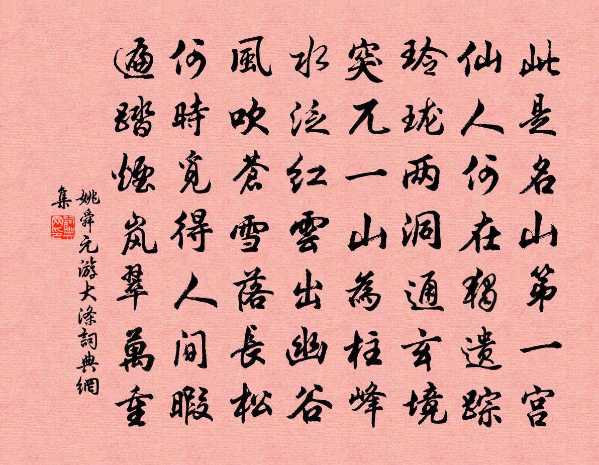 詩詞名句歷史字典書法欣賞書法字典國語詞典說文解字康熙字典古漢語字典標 題 作 者 詩 句 游大滌作者:姚舜元 朝代:宋代游大滌原文此是名山第一宮,仙人何在獨遺蹤。玲瓏兩洞通玄境,突兀一山為柱峰。水泛紅雲出幽谷,風吹蒼雪落長松。何時覓得人間暇,遍踏煙嵐翠萬重。詩詞問答問:游大滌的作者是誰?答:姚舜元問:游大滌寫於哪個朝代?答:宋代姚舜元游大滌書法欣賞游大滌書法作品詩詞推薦秋晚登擬峴望祥符觀陸游〔宋代〕放翁侷促留江乾,愛此樓前煙水寬。雨昏回望殿突兀,秋晚剩覺山蒼寒。中原未復淚橫臆,故里欲歸身屬官。雲外和仲韓見簡韻章甫〔宋代〕野人不愛名,中歲益安命。辛苦營一區,婆娑只三徑。那知錢有神,但喜酒能聖。翩翩趙公子,時時枉軒乘。詩詞恭和御製賜太師致仕文彥博七言四韻詩一首蘇頌〔宋代〕出處逢時道不殊,當年功立老間居。來膺冕紱三公命,歸奉雲章五色書。社稷元臣名已遂,山河雄鎮寵仍疏。瓊林瓔珞泉陳岩〔宋代〕花花結結淨無塵,卻笑莊嚴未是真。五色明珠光照水,湛然清淨本來身。水調歌頭(處州煙雨樓落成,欲就中秋,後值雨)李處全〔宋代〕樓觀數南國,煙雨壓東州。溪山雄勝,天開圖畫肖瀛洲。我破瀛洲客夢,來剖仙洲符竹,樂歲又雲秋。聊作幻師戲次韻德先步月答所問語魏了翁〔宋代〕夜景湛虛明,浩然無與京。如今蘇氏婦,但指聖人清。鷓鴣天葛長庚〔宋代〕西畔雙松百尺長。當時親自見劉王。山前今日蓮花水,往者將軍洗馬塘。南粵路,漢宮牆。晚風歷歷說興亡。摩挲菩薩蠻盧祖皋〔宋代〕芙蓉香卸桐陰薄。水窗未雨涼先覺。何處理秋裳。月高砧杵長。袂羅新恨悄。展轉屏山曉。長是捲簾時。翠禽相對雪晴訪趙嘏街西所居三韻杜牧〔唐代〕命代風騷將,誰登李杜壇。少陵鯨海動,翰苑鶴天寒。今日訪君還有意,三條冰雪獨來看。葛嶺林景熙〔宋代〕不讀霍光傳,炫會桃李門。湖山變朝市,烽火滿乾坤。膽落冰天騎,魂飛瘴雨村。春風吹秀麥,誤國竟何言。鷓鴣天(圓子)王千秋〔宋代〕翠勺銀鍋饗夜遊。萬燈初上月當樓。溶溶琥珀流匙滑,璨璨蠙珠著面浮。香入手,暖生甌。依然京國舊風流。翠娥同諸公會太府韓卿宅姚合〔唐代〕九寺名卿才思雄,邀歡筆下與杯中。六街鼓絕塵埃息,四座筵開語笑同。焰焰蘭缸明狹室,丁丁玉漏發深宮。即聽採珠行元稹〔唐代〕海波無底珠沉海,採珠之人判死采。萬人判死一得珠,斛量買婢人何在。年年採珠珠避人。今年採珠由海神。海神蝶戀花歐陽修〔宋代〕梨葉初紅蟬韻歇。銀漢風高,玉管聲淒切。枕簟乍涼銅漏徹。誰教社燕輕離別。草際蟲吟秋露結。宿酒醒來,不記坐病不赴姚總統席夜聞樂聲因寄董嗣杲〔宋代〕精神疲夜漏,弦管沸秋筵。想醉黃花下,誰歌翠幙前。病身空羨酒,愁耳愛聽泉。月轉羈窗破,蕭蕭照客眠。山居遣興釋紹嵩〔宋代〕百衲老空林,疏慵倦九箴。浮沉千古事,去住兩鄉心。絕頂無禪侶,忘言有匣琴。感多聊自遣,時復一閒吟。次韻宋尚書山居息齋方岳〔宋代〕塵途長逐眾人忙,不抵齋扉一枕涼。世路巇嶇吾倦至,底須辛苦為膏梁。王子開朝散早年以疾病謝事還江陰求詩為別三張耒〔宋代〕田園何日到,水國洗秋寒。興來出飲酒,興罷歸杜門。漫郎游已倦,老眼亂丹鉛。扁舟肯載我,共看雪濤翻。憩竇園因題池亭釋紹嵩〔宋代〕午枕藜床夢忽驚,竇家園裹有鶯聲。半生客路逢佳節,萬瓦腳跟開化城。鸂鶒刷毛花蕩漾,蒲萄上架月縱橫。誰教南海子納蘭性德〔清代〕相風微動九門開,南陌離宮萬柳栽。草色橫粘下馬泊,水光平占晾鷹台。錦韉欲射波間去,玉輦疑從島上回。自是名句推薦思君若汶水,浩蕩寄南征。李白《沙丘城下寄杜甫》 別日南鴻才北去,今朝北雁又南飛。魚玄機《閨怨》 山桃紅花滿上頭,蜀江春水拍山流。劉禹錫《竹枝詞·山桃紅花滿上頭》 拔一毛而利天下,不為也。孟子《孟子·盡心章句上·第二十六節》 春去也,飛紅萬點愁如海。秦觀《千秋歲·水邊沙外》 青山依舊在,幾度夕陽紅。楊慎《臨江仙·滾滾長江東逝水》 一月不讀書,耳目失精爽。蕭掄謂《讀書有所見作》 君子矜而不爭,群而不黨。孔子弟子《論語·衛靈公篇》 秋風生渭水,落葉滿長安。賈島《憶江上吳處士》 起來無語理朝妝,寶匣鏡凝光顧敻《虞美人·觸簾風送景陽鍾》