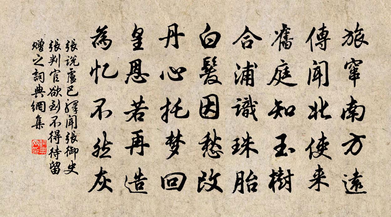 詩詞名句歷史字典書法欣賞書法字典國語詞典說文解字康熙字典古漢語字典標 題 作 者 詩 句 盧巴驛聞張御史張判官欲到不得待留贈之作者:張說 朝代:唐代原文旅竄南方遠,傳聞北使來。舊庭知玉樹,合浦識珠胎。白髮因愁改,丹心託夢回。皇恩若再造,為憶不然灰。詩詞問答問:《盧巴驛聞張御史張判官欲到不得待留贈之》的作者是誰?答:張說問:該詩寫於哪個朝代?答:唐代問:該詩是什麼體裁?答:五律書法欣賞盧巴驛聞張御史張判官欲到不得待留贈之書法作品注釋全唐詩:卷87_52詩詞推薦賀新郎(賀耐軒周府尹·己卯)佚名〔宋代〕富貴人間有。就如今、秤量陰德,還公最厚。一郡鶻侖全似舊,春滿霜疇稻畝。近帳外、干將夜吼。直指禾川弄霆盆池陳與義〔宋代〕三尺清池窗外開,茨菰葉底戲魚回。雨聲轉入浙江去,雲影還從震澤來。次耿令君藥名韻曹彥約〔宋代〕賦分微官即忍冬,衣單無計可防風。四方遠志從頭去,一水空青到底窮。地骨自寒誰與祛,天門欲到愧無功。是誰送郭補闕歸江陽李端〔唐代〕東門春尚淺,楊柳未成陰。雁影愁斜日,鶯聲怨故林。隋宮江上遠,梁苑雪中深。獨有懷歸客,難為欲別心。逢舍弟釋行海〔宋代〕兄弟相逢在浙西,問家言客思依依。已難與汝淒涼別,終不教吾獨自歸。流落異鄉成老貌,別來無處寄寒衣。死生夢天李賀〔唐代〕老兔寒蟾泣天色,雲樓半開壁斜白。玉輪軋露濕團光,鸞佩相逢桂香陌。黃塵清水三山下,更變千年如走馬。遙望清曠亭送子云得有字韓元吉〔宋代〕歡期苦難逢,離別乃易久。天涯老兄弟,況復親白首。田園固不足,功名亦何有。今年送兄行,正爾作太宋。池陽憶少年乩仙〔宋代〕淒涼天氣,淒涼院落,淒涼時候。孤鴻叫斜月,伴寒燈殘漏。落盡梧桐秋影瘦。菱鑑古、畫眉難就。重陽又近也,逍遙詠宋太宗〔宋代〕含元得一本真宗,誤者平論總是空。萬象都來皆備數,千言譬諭瞭然通。才高俊彥優堪賞,竊祿偷安有異同。唯願白雲亭李晏〔元代〕白雲亭上白雲秋,桂棹蘭槳記昔游。往事已隨流水去,青山空對夕陽愁。興亡翻手成舒捲,今古無心自去留。獨倚京山行孟郊〔唐代〕眾虻聚病馬,流血不得行。後路起夜色,前山聞虎聲。此時遊子心,百尺風中旌。漫興詹初〔宋代〕秋風獨坐野塘前,水上游魚自有天。真意更須何處覓,知音從古在無弦。竹枕朱翌〔宋代〕方床洗湘斑,夏簟織蘄笛。誰與同臥起,青 * 甚相得。嘉哉直節君,契分近愈密。深林捕貓頭,乃復枕上膝。直送胡季昭謫象州丁黼〔宋代〕一封書奏觸天威,萬里徒行出帝畿。始得明時來讜論,豈知薄命墮危機。身同季弟辭兄去,女抱嬰兒伴丹歸。風雨酬滑州公儀龍圖見寄歐陽修〔宋代〕畫舫齋前舊菊叢,十年開落任秋風。知君為我留紅◇,猶記栽花白髮翁。栽松道者釋普寧〔宋代〕栽培得地,節操蒼然。死而復活,身後身前。楖栗橫肩阿剌剌,再來不直半分錢。薛道祖寄黃魯直詩帖贊岳珂〔宋代〕詩以情寄,而拳拳首子侄之示。又使之寶而勿棄,亦足以見其得意。送後集往廬山東林寺兼寄雲皋上人白居易〔唐代〕後集寄將何處去,故山迢遞在匡廬。舊僧獨有雲皋在,三二年來不得書。別後道情添幾許,老來筋力又何如。來生和邢惇夫秋懷十首黃庭堅〔宋代〕邢子臥北窗,吟秋意少悰。讀書用意苦,嘔血驚乃翁。安得和扁輩,為浣學古胸。肺熱今好否,微涼生井桐。醉蓬萊(壽郁梅野)伍梅城〔宋代〕倚東風笑問。落紅啼鴂,清明來未。小雨弄晴,做輕寒天氣。南極光中,五雲深處,人慶千秋歲。翡翠屏間,琉璃名句推薦君埋泉下泥銷骨,我寄人間雪滿頭。白居易《夢微之》 拜華星之墜幾,約明月之浮槎。文天祥《回董提舉中秋請宴啟》 姑蘇台上烏棲時,吳王宮裡醉西施。李白《烏棲曲》 輪台九月風夜吼,一川碎石大如斗,隨風滿地石亂走。岑參《走馬川行奉送出師西征 / 走馬川行奉送封大夫出師西征》 意內稱長短,終身荷聖情。杜甫《端午日賜衣》 轡搖銜鐵。蹴踏平原雪。張炎《清平樂·平原放馬》 昨夜更闌酒醒,春愁過卻病。李璟《應天長·一鉤初月臨妝鏡》 小人不激不勵,不見利不勸。王通《中說·卷一·王道篇》 逐流牽荇葉,緣岸摘蘆苗。儲光羲《江南曲四首》 兒不嫌母醜,狗不嫌家貧。佚名《增廣賢文·下集》