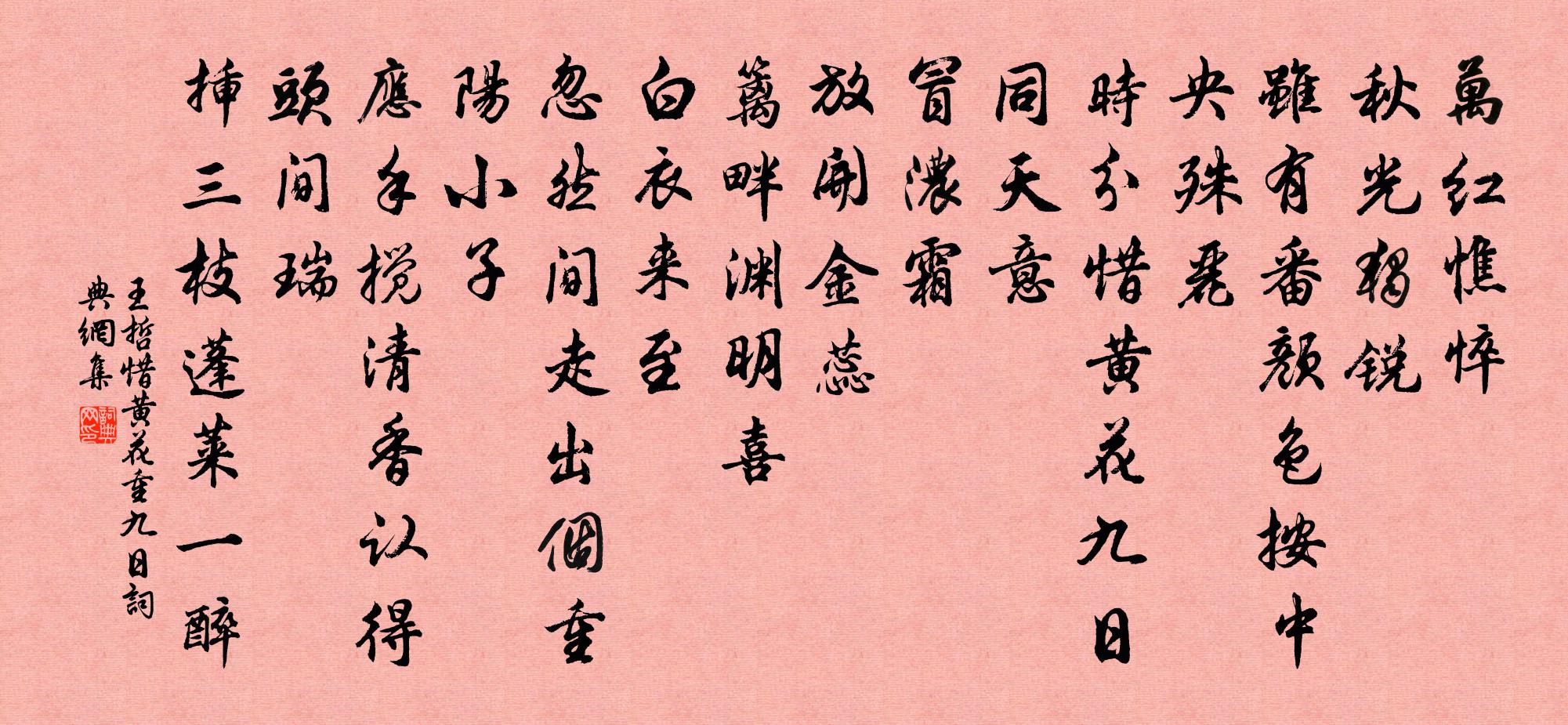 詩詞名句歷史字典書法欣賞書法字典國語詞典說文解字康熙字典古漢語字典標 題 作 者 詩 句 惜黃花 重九日作者:王哲 朝代:元代惜黃花 重九日原文萬紅憔悴。秋光獨銳。雖有番,顏色按,中央殊麗。時分惜黃花,九日同天意。冒濃霜。放開金蕊。籬畔淵明喜。白衣來至。忽然間,走出個重陽小子。應手攪清香,認得頭間瑞。插三枝、蓬萊一醉。詩詞問答問:惜黃花 重九日的作者是誰?答:王哲問:惜黃花 重九日寫於哪個朝代?答:元代問:惜黃花 重九日是什麼體裁?答:詞王哲惜黃花 重九日書法欣賞惜黃花 重九日書法作品詩詞推薦山行逢勤禪德釋重顯〔宋代〕乳岩秋日無他作,策杖層層止寥廓。四顧有誰分野情,一點彤雲起深壑。蘚石遲遲略輕踞,逢箇衲僧忽驟步。頻喚臨寂頌釋宗杲〔宋代〕生也只恁麽,死也只恁麽。有偈與無偈,是甚麽熱大。題竹溪近藁二首劉克莊〔宋代〕□□久讓□□□,□□牆低怯淺攻。白敏居常嘲杜甫,愈謙自說效盧仝。三千首探驪頷寶,九萬里摶鵬背風。欲往聞韶州李相公移拜郴州因寄許渾〔唐代〕詔移丞相木蘭舟,桂水潺湲嶺北流。青漢夢歸雙闕曙,白雲吟過五湖秋。恩回玉扆人先喜,道在金縢世不憂。聞說杭州雜詩和林石田汪元量〔宋代〕此夕知何夕,遊船雜戰船。山河空百二,宮闕漫三千。雨歇雲垂地,潮平水接天。惜哉無祖逖,誰肯著先鞭。次程岳州廷邁春行昨訪天梯佛龕今約烏奴洪咨夔〔宋代〕汗血嘶風草正青,眼中萬馬斂春坰。檄書縱不煩師魯,薦藁猶當出古靈。杜若扶疏明遠渚,荼蘼猗靡馥中庭。天梯同賦梅花十二題風前王銍〔宋代〕清香自滿不因風,花氣迷人處處同。祗與吹開又吹落,春愁已在笛聲中。夏日閨怨蔡瑰〔唐代〕桃徑李蹊絕芳園,炎氛熾日滿愁軒。枝上鳥驚朱槿落,池中魚戲綠蘋翻。君戀京師久留滯,妾怨高樓積年歲。非關寄劉行簡王洋〔宋代〕西來有客解歸裝,先說東台白首郎。顏貌宛如周柱史,鬚眉皆是漢馮唐。百年未覺強弓滿,新曆還添漏箭長。欲寄宮詞王仲修〔宋代〕煌煌玉燭四時平,順氣熏蒸萬物成。謾說蓬萊宮裹橘,宣和殿下荔枝生。次韻樞相雪中之什李流謙〔宋代〕空明無際了寒天,戍堠消鋒弩絕拳。平白萬方包險穢,清冷一片起沉綿。山登姑射欣逢歲,賊破淮西欲問年。更長挽鄭甥主學二首劉克莊〔宋代〕親則班□子,賢於輔嗣甥。奠芻終古訣,炊黍霎時榮。先墓身為殉,新丘手自營。老人尤惜淚,何況又偏盲。賀新涼(戊申生日)方岳〔宋代〕一笑君知否。笑當年、山 * 士,行歌樵叟。五十到頭公老矣,只可鷺朋鷗友。便富貴、何如杯酒。好在歸來蒼崖蘇學十題泮池朱長文〔唐代〕怪石鋪幽麓,芳塘倚茂林。冷光開玉鏡,清景滌人心。芹藻無傷性,龜魚各就深。泉源應不涸,何必傅岩霖。送僧之雙林釋心月〔宋代〕去到雙林見舊遊,眉彎新月眼橫秋。寒暄未舉宜先問,因甚橋流水不流。雪後赴徐氏燕集李處權〔宋代〕已雪猶陰更逆風,斜川略彴斷行蹤。瑤台貝闕三千丈,玉樹瓊林一萬重。學子經時無載酒,鄰僧過午未鳴鐘。華筵送趙仲寶永興乾耀提舉捉賊梅堯臣〔宋代〕知君少以勇,曾向蕭關戰。橫刀突虜圍,奪馬傷胡箭。當時獨免歸,猛毅邊人羨。今來提漢卒,寇盜清秦縣。未足照君辭釋智圓〔宋代〕昭君停車淚暫止,為把功名奏天子。靜得胡塵唯妾身,漢家文武合羞死。七月六日二首張耒〔宋代〕月落暗蟲啼不休,五更白露曉悠悠。西風是處將搖落,可但梧桐獨報秋。立夏奉祀太一宮五言十韻劉筠〔宋代〕朱駕開炎序,瓊科舉舊儀。恭承宣室詔,肅奉列真祠。地接蘢蔥氣,人多綽約姿。珍叢羅寶槭,嘉樹蔭文榱。仙饌名句推薦竹葉於人既無分,菊花從此不須開。杜甫《九日五首·其一》 竹邊荷外再相逢,又還是、浮雲飛去。趙以夫《鵲橋仙·富沙七夕為友人賦》 君子之交淡若水,小人之交甘若醴。莊子《莊子·外篇·山木》 柳重煙深,雪絮飛來往。歐陽修《蝶戀花·面旋落花風蕩漾》 自春來、慘綠愁紅,芳心是事可可。柳永《定風波·自春來》 面譽者不忠,飾貌者不情戴聖《大戴禮記·文王官人第七十二》 凡與敵戰,若我勝彼負,不可驕惰,當日夜嚴備以待之。佚名《百戰奇略·第六卷·勝戰》 只在此山中,雲深不知處。賈島《尋隱者不遇 / 孫革訪羊尊師詩》 同穴窅冥何所望,他生緣會更難期。元稹《遣悲懷三首·其三》 天時人事日相催,冬至陽生春又來。杜甫《小至》