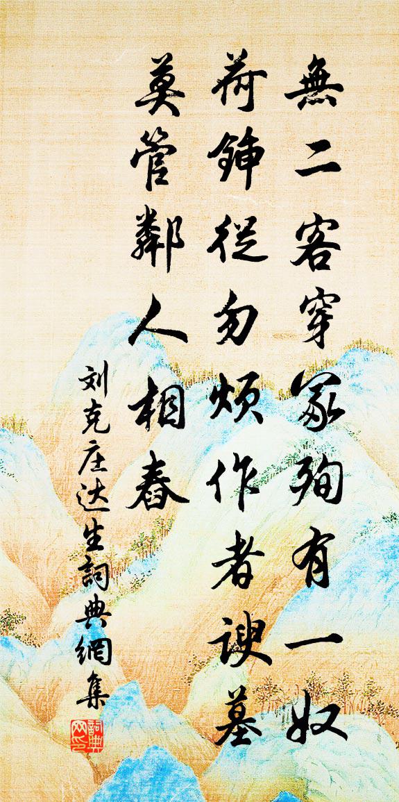 詩詞名句歷史字典書法欣賞書法字典國語詞典說文解字康熙字典古漢語字典標 題 作 者 詩 句 達生作者:劉克莊 朝代:宋代達生原文無二客穿冢殉,有一奴荷鍤從。勿煩作者諛墓,莫管鄰人相舂。詩詞問答問:達生的作者是誰?答:劉克莊問:達生寫於哪個朝代?答:宋代問:劉克莊的名句有哪些?答:劉克莊名句大全劉克莊達生書法欣賞達生書法作品詩詞推薦禮部直舍枯竹嫩叢燕雀飛來欲折以二韻記雲鄭剛中〔宋代〕火邊遺竹但枯枝,瘦筍叢生未及齊。篠嫩不禁風燕立,綠梢煙外起還低。過北山何先生故宅於石〔宋代〕青雲不在金華巔,白雲孤起金華岑。百世相傳勉齋學,四書誰識晦翁心。水流盤澗自深淺,月照北山無古今。人問贈譯經僧韓愈〔唐代〕萬里休言道路賒,有誰教汝度流沙。只今中國方多事,不用無端更亂華。自曹家沙風中拋江危甚抵銅陵縣董嗣杲〔宋代〕朔風吹沙昏,聚落風物蕃。劇邑此寄治,零星數軍屯。奸狡紛雁鶩,生殖豐雞豚。獵子事兵仗,儒家扃蓽門。時聞乙卯重九陸游〔宋代〕九日村醅熟,逢迎不用呼。樽前狂起舞,陌上醉相扶。殘發新霜白,衰顏落葉枯。明年何足問,且復插茱萸。水仙子佚名〔元代〕青山隱隱水茫茫,時節登高卻異鄉。孤城孤客孤舟上,鐵石人也斷腸,淚漣漣斷送了秋光。黃花夢,一夜香,過了句宋翰〔宋代〕襟分楚澤三千里,曲奏湘妃五十弦。匡城尋薛閔秀才不遇劉滄〔唐代〕音容一別近三年,往事空思意浩然。匹馬東西何處客,孤城楊柳晚來蟬。路長草色秋山綠,川闊晴光遠水連。不見鵲踏枝·叵耐靈鵲多謾語敦煌曲子〔唐代〕叵耐靈鵲多謾語。送喜何曾有憑據?幾度飛來活捉取。鎖上金籠共語。比擬好心來送喜。誰知鎖我在金籠里。欲他品令(族姑慶八十,來索俳語)辛棄疾〔宋代〕更休說。便是個、住世觀音菩薩。甚今年、容貌八十歲,見底道、才十八。莫獻壽星香燭。莫祝靈龜椿鶴。只消得雪夕奉陪天台明照禪師擁爐閒話錢惟演〔宋代〕藜燭檐香夜幄清,朔風窗際激飛英。鳳梨鴟芋煨將熟,坐擁豐貂話赤城。必源以古風見投詞意甚遠因為賦風吹原上苗勉劉子翬〔宋代〕風吹原上苗,青青入無邊。發生賴陽和,秀潤滋澄漣。游車走道旁,忽之如浮煙。那知丁黃愁,枵腹望果然。農功縱步趙汝鐩〔宋代〕久雨厭人妨野步,幾時便得此番晴。到橋喚仆來相助,過寺逢僧約共行。籬落一團飛蛺蝶,汀洲數點立鵁鶄。農家少年游李甲〔宋代〕江國陸郎封寄後,獨自冠群芳。折時雪裡,帶時燈下,香面訝爭光。而今不怕吹羌管,一任更繁霜。玳筵賞處,玉青帝王初〔唐代〕青帝邀春隔歲還,月娥孀獨夜漫漫。韓憑舞羽身猶在, * 商弦調未殘。終古蘭岩棲偶鶴,從來玉谷有離鸞。幾時公退三首蘇籀〔宋代〕披文不釋遺編慕,躭祿終慚遠賄稱。劫劫抗塵非勝趣,寥寥出世有真乘。轉頭值寓無窮極,措足虛邪粗可勝。管晏自金陵溯流過白璧山玩月達天門,寄句容王主簿李白〔唐代〕滄江溯流歸,白璧見秋月。秋月照白璧,皓如山陰雪。幽人停宵征,賈客忘早發。進帆天門山,回首牛渚沒。川長秋夜趙汝鐩〔宋代〕秋到情懷惡,美人天一方。夜深窗轉月,夢斷角吹霜。斯遠兄入城見使君郎中且謁尚書韓先生提屬李趙蕃〔宋代〕上饒耆舊無曾呂,月旦多稱李德翁。聞道二難真頓有,蓋公堂下求盍通。減字木蘭花魏夫人〔宋代〕西樓明月。掩映梨花千樹雪。樓上人歸。愁聽孤城一雁飛。玉人何處。又見江南春色暮。芳信難尋。去後桃花流水名句推薦一恕字是接物之要,所以終身可行也。王永彬《圍爐夜話·第六則》 岸邊兩兩三三,浣沙游女。柳永《夜半樂·凍雲黯淡天氣》 門外平橋連柳堤,歸來晚樹黃鶯啼。溫庭筠《春洲曲》 歲寒,然後知松柏之後凋也。孔子弟子《論語·子罕篇》 陶潛酷似臥龍豪,萬古潯陽松菊高龔自珍《己亥雜詩·其一百三十》 不盡眼中青,是愁來時節張元乾《石州慢·寒水依痕》 白日依山盡,黃河入海流。王之渙《登鸛雀樓》 君子不畏虎,獨畏讒夫之口。王充《論衡·卷二十三·言毒篇》 老景蕭條,送君歸去添淒斷。毛滂《燭影搖紅·送會宗》 最是一年春好處,絕勝煙柳滿皇都。韓愈《早春呈水部張十八員外 / 初春小雨 / 早春》