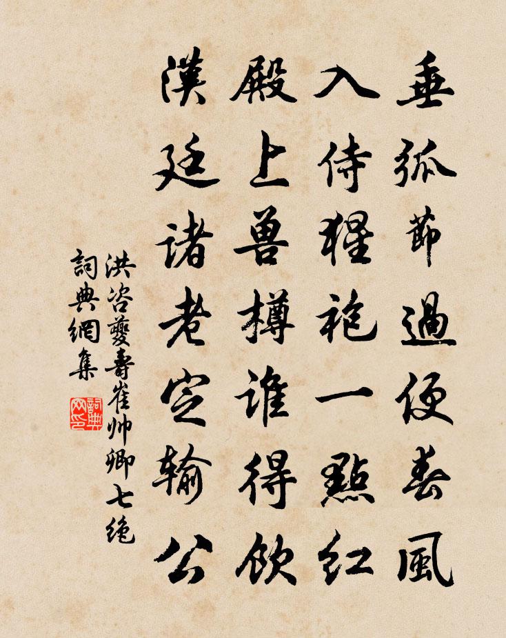 詩詞名句歷史字典書法欣賞書法字典國語詞典說文解字康熙字典古漢語字典標 題 作 者 詩 句 壽崔帥卿七絕作者:洪咨夔 朝代:宋代壽崔帥卿七絕原文垂弧節過便春風,入侍猩袍一點紅。殿上獸樽誰得飲,漢廷諸老定輸公。詩詞問答問:壽崔帥卿七絕的作者是誰?答:洪咨夔問:壽崔帥卿七絕寫於哪個朝代?答:宋代洪咨夔壽崔帥卿七絕書法欣賞壽崔帥卿七絕書法作品詩詞推薦病起見梅花有感四首袁燮〔宋代〕古澗荒郊人跡少,幾枝摘索為誰芳。因思陋巷甘岑寂,為已工夫味更長。致政少卿邵公輓辭三首蘇頌〔宋代〕屢試循良政,兼推乾裕才。惠和綏列郡,風績振行台。始見彤襜去,遄驚畫翣回。甘棠猶蔽芾,高隴已崔嵬。水調歌頭 為仲方東園賦王惲〔元代〕野飲不稱意,歸促紫游韁。誰知草堂深處,清賞興尤長。夢裡佳人錦瑟,眼底瓦盆濁酒,衣袖醉淋浪。歌罷竹軒晚次友人示詩集姚勉〔宋代〕杖藜看筍數犀株,天墮香雲五色書。落月照人驚夢昨,光風識面記春初。珠駢巧語誰能揀,錦比新詩迥不如。轉讀平陰張澄居士隱處三詩之復庵黃庭堅〔宋代〕舂糧出求仁,行李彌宇宙。久客渺愁人,馬飢僕夫瘦。歸來一丘中,萬事不改舊。禾黍鋤其驕,牛羊鞭在後。隱几晚秋病中王建〔唐代〕萬事風吹過耳輪,貧兒活計亦曾聞。偶逢新語書紅葉,難得閒人話白雲。霜下野花渾著地,寒來溪鳥不成群。病多田家即事舒岳祥〔宋代〕飽暖無他事,天心亦易回。繅車翻急瀑,麥磨響輕雷。履辟行泥筍,衣蒸過雨梅。荒村斷魚肉,隨興酌出杯。偈三首釋道昌〔宋代〕與我相似,共爾無緣。打翻藥銚,傾出爐煙。還丹一粒分明在,流落人間是幾年。和伍解元喜祈雨有感趙善括〔宋代〕痴龍偃蹇玩歲月,深居白雲抱幽石。有時江海肆貪殘,坐視天焦地皮拆。分疆守職各有方,止沸詎可揚其湯。曰暘漁家傲(閨思)吳禮之〔宋代〕紅日三竿鶯百囀。夢回鴛枕離魂亂。料得玉人腸已斷。眉峰斂。曉妝鏡里春愁滿。綠瑣窗深難見面。雲箋謾寫教誰建康懷古金朋說〔宋代〕石頭城下炬燒寒,司馬東來骨肉殘。可惜六朝花粉地,年年風雨草漫漫。眼兒媚(東院適人乞詞,醉中書於裙帶三首趙長卿)趙長卿〔宋代〕人隨社節去匆匆。此恨幾時窮。陽台寂寞,巫山悽慘,雲雨成空。芭蕉密處窗兒下,冷落舊香中。黃昏靜也,蛩聲偈頌二十一首釋堅璧〔宋代〕皓月當空,寒江不動。萬里清光,曾非別共。蚌孕珠而無從,兔懷胎而非種。萬別千差,波騰海涌。卷舒只在一毫春飲徐凝〔唐代〕烏家若下蟻還浮,白玉尊前倒即休。不是春來偏愛酒,應須得酒遣春愁。和王昭君韓維〔宋代〕漢宮姝麗地,華觀連珍台。娥眉三千人,皆自良家來。昭君乃獨出,負色羞自媒。一為丹青誤,白雪成緇埃。結歡洞仙歌利登〔宋代〕弄香吹粉,記前回酒困。綠露沈沈轉花影。翠簾深,隱隱紅霧依人,荷月靜,新樣雙鸞交映。如今誰念省。短雨長送支使蕭中丞赴闕羅隱〔唐代〕八年刀筆到京華,歸去青冥路未賒。今日風流卿相客,舊時基業帝王家。彤庭彩鳳雖添瑞,望府紅蓮已減花。從此長歌行陸游〔宋代〕我無四目與兩口,但在人間更事久。死生元是開闔眼,禍福正如翻覆手。消磨日月幾緉屐,陶鑄唐虞一杯酒。既非句陶弼〔宋代〕玉簪峰頂共登仙,銅柱溪頭再得賢。哨遍(秋水觀)辛棄疾〔宋代〕蝸角鬥爭,左觸右蠻,一戰連千里。君試思、方寸此心微。總虛空、並包無際。喻此理。何言泰山毫末,從來天地名句推薦楓樹夜猿愁自斷,女蘿山鬼語相邀李商隱《楚宮》 君子有三患:未之聞,患弗得聞也;既聞之,患弗得學也;既學之,患弗能行也。戴聖《禮記·雜記下》 支離東北風塵際,漂泊西南天地間。杜甫《詠懷古蹟五首·其一》 不可同日而語畢沅《續資治通鑑·宋紀·宋紀七十三》 兒女已在眼,眉目略不省。陳師道《示三子》 箴者,針也,所以攻疾防患,喻針石也。劉勰《文心雕龍·銘箴》 迢遞嵩高下,歸來且閉關。王維《歸嵩山作》 東飛烏鵲西飛燕。盈盈一水經年見。陳師道《菩薩蠻·七夕》 目前貧富非為準,久後窮通未可知。馮夢龍《醒世恆言·卷一》 柳如眉,雲似發,鮫綃霧縠籠香雪。魏承班《漁歌子·柳如眉》